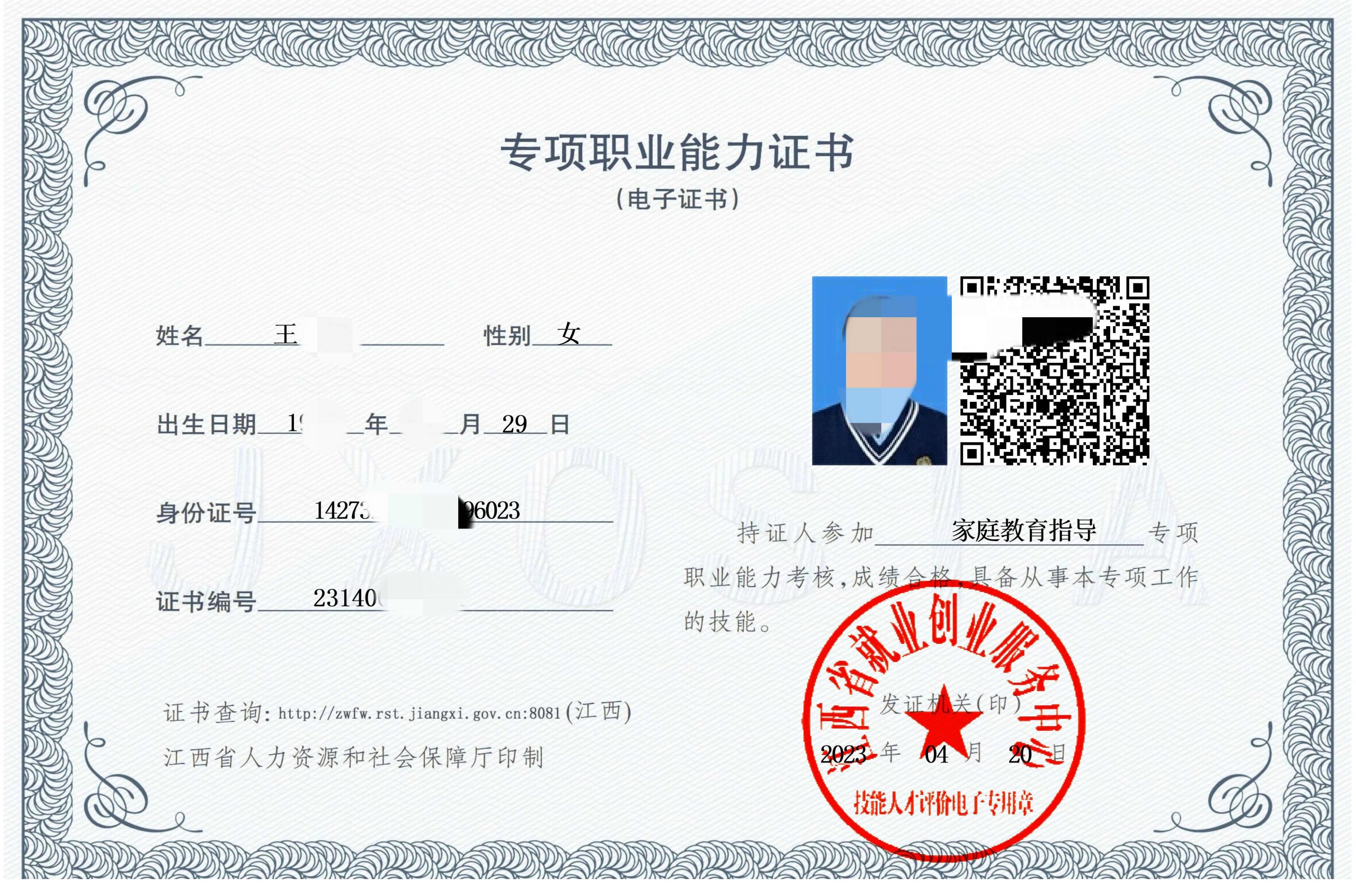 一、江西省【家庭教育指导】专项职业能力证书样式