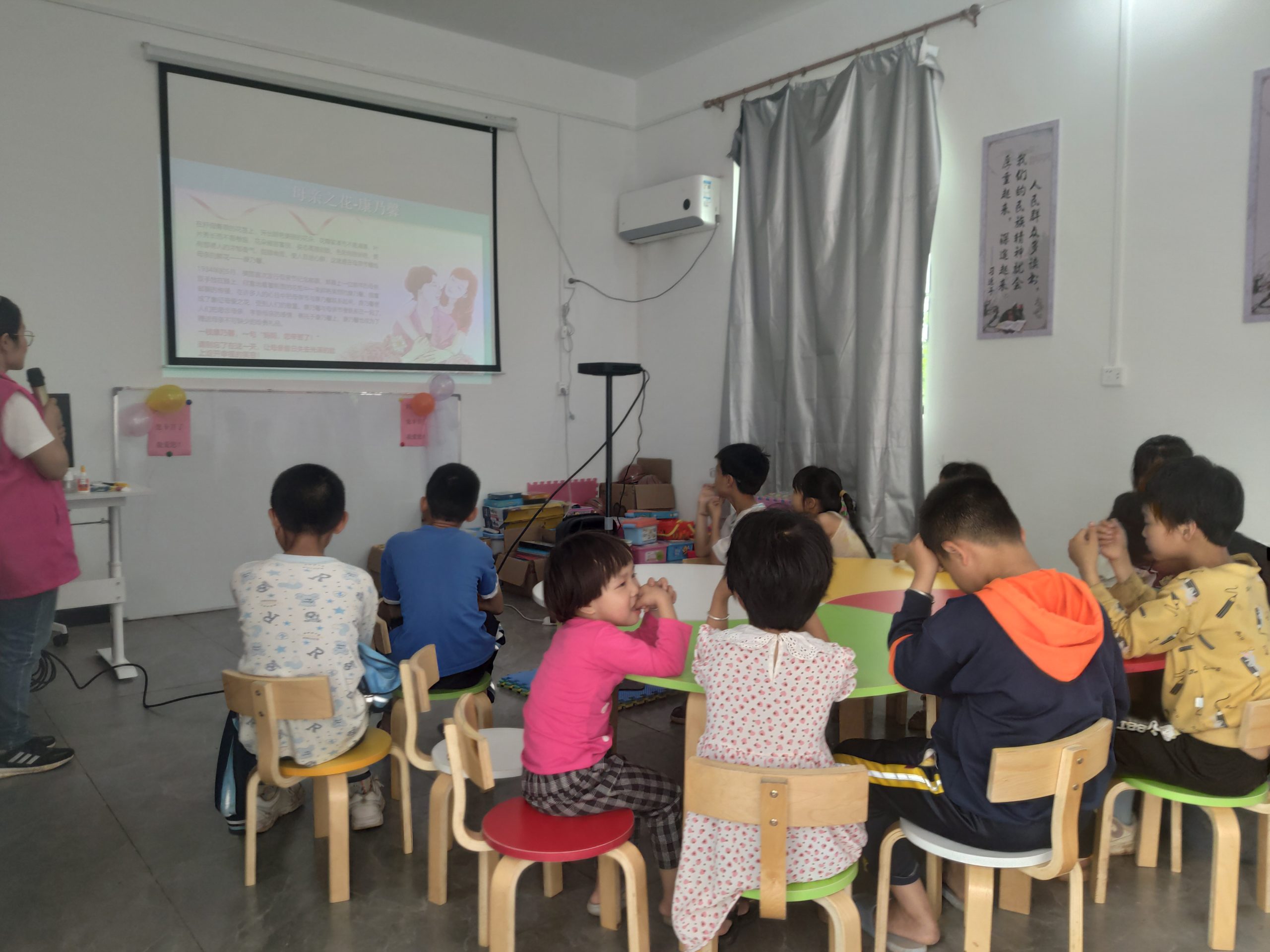 活动伊始,志愿者袁建芳给孩子们讲述活动主题及目的,并认真讲解了母亲节的由来。紧接着,带领孩子们一起跟着视频学习亲情手势舞——《有你就幸福》和《最亮的星星》。