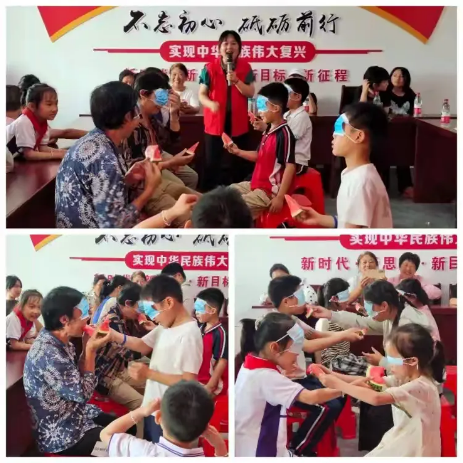 为了增强活动的趣味性和互动性,我们还特别设计了几个寓教于乐的游戏环节。其中,“喂西瓜”活动让孩子们和奶奶们两两组队,戴上眼罩后互相喂食,这不仅考验了孩子们的耐心和团队协作能力,也让他们体会到了与长辈之间的亲密情感。