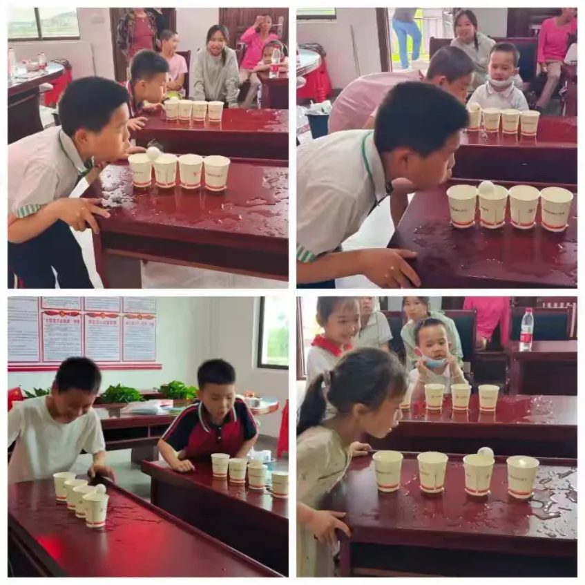 此外,“合唱《歌唱祖国》”环节更是将活动的氛围推向了高潮。志愿者带领大家一起合唱这首脍炙人口的歌曲,让孩子们在歌声中感受祖国的伟大和人民的团结。最后一个游戏是“小球水上漂”,孩子们用嘴吹动乒乓球,经过一系列的努力,最终将球滚入第四个杯子,赢得了现场观众的喝彩声。