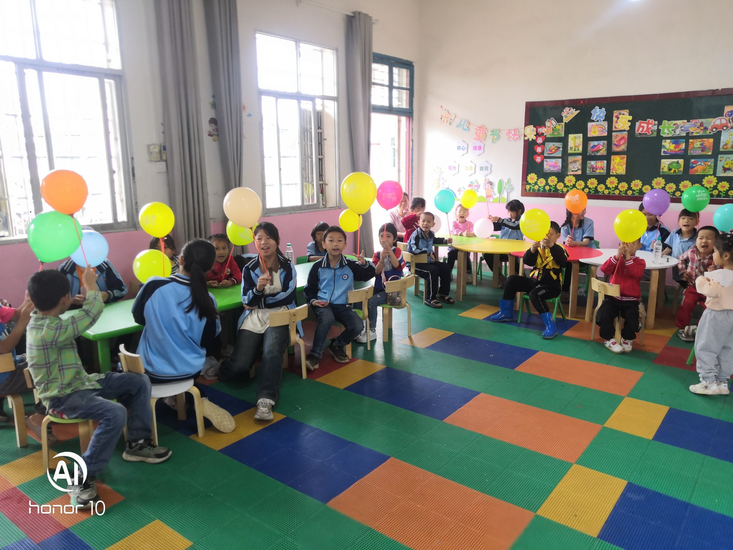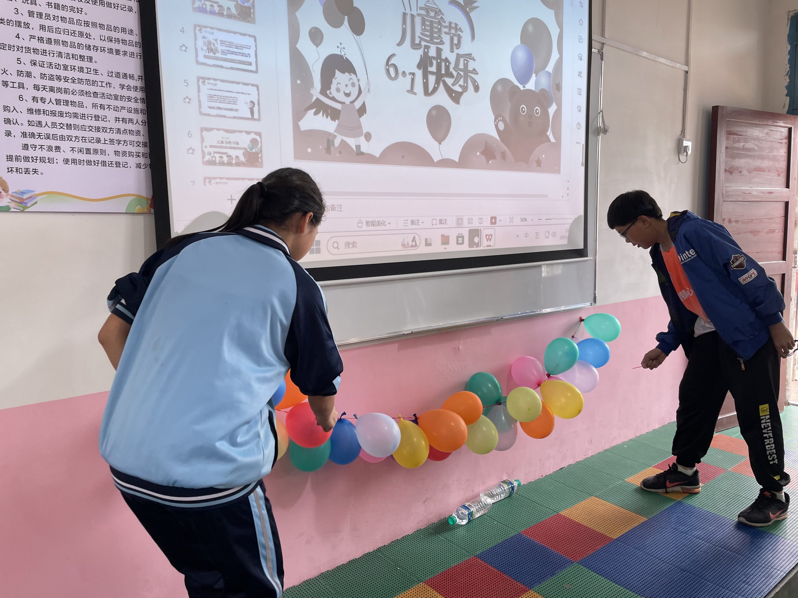 阳光驿站的孩子们跟志愿者一起装饰阳光驿站,吹气球。
