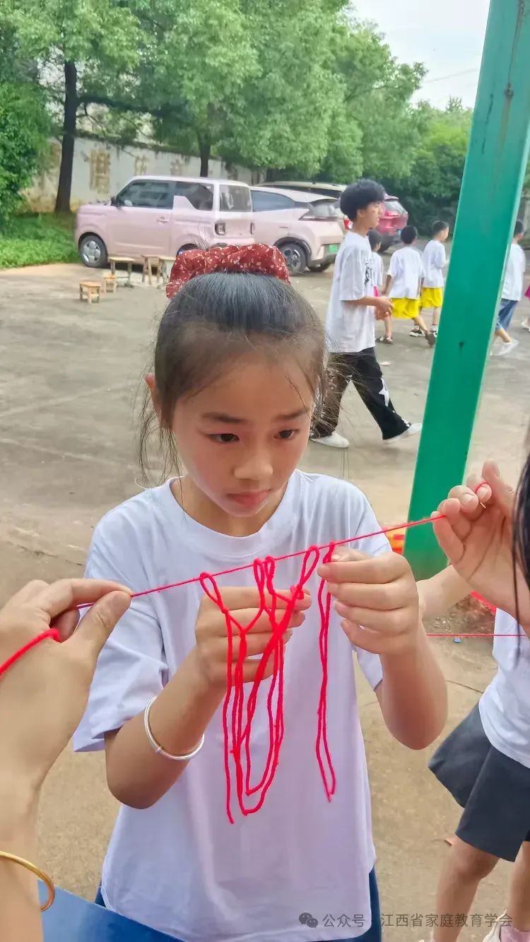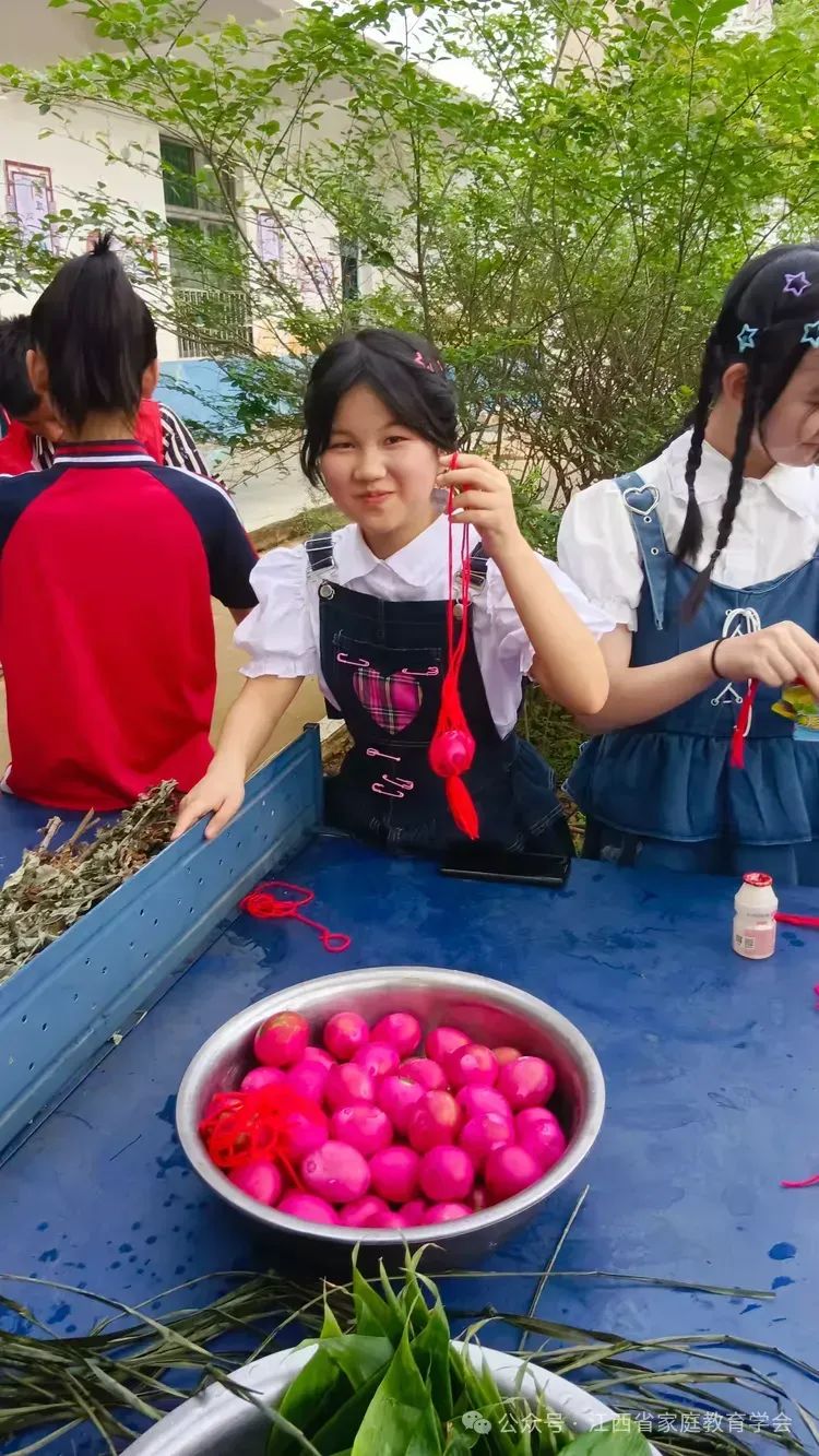 除了了解端午节的传统文化,我们还为孩子们准备了一系列丰富多彩的活动。工作人员提前将鸭蛋染成红蛋,带领孩子们共同编织红绳小网兜,将红蛋装进网兜中,挂在孩子们的胸前。孩子们兴高采烈地参与其中,亲手编织的小网兜既精美又实用,红蛋在阳光下闪耀着喜庆的光芒。