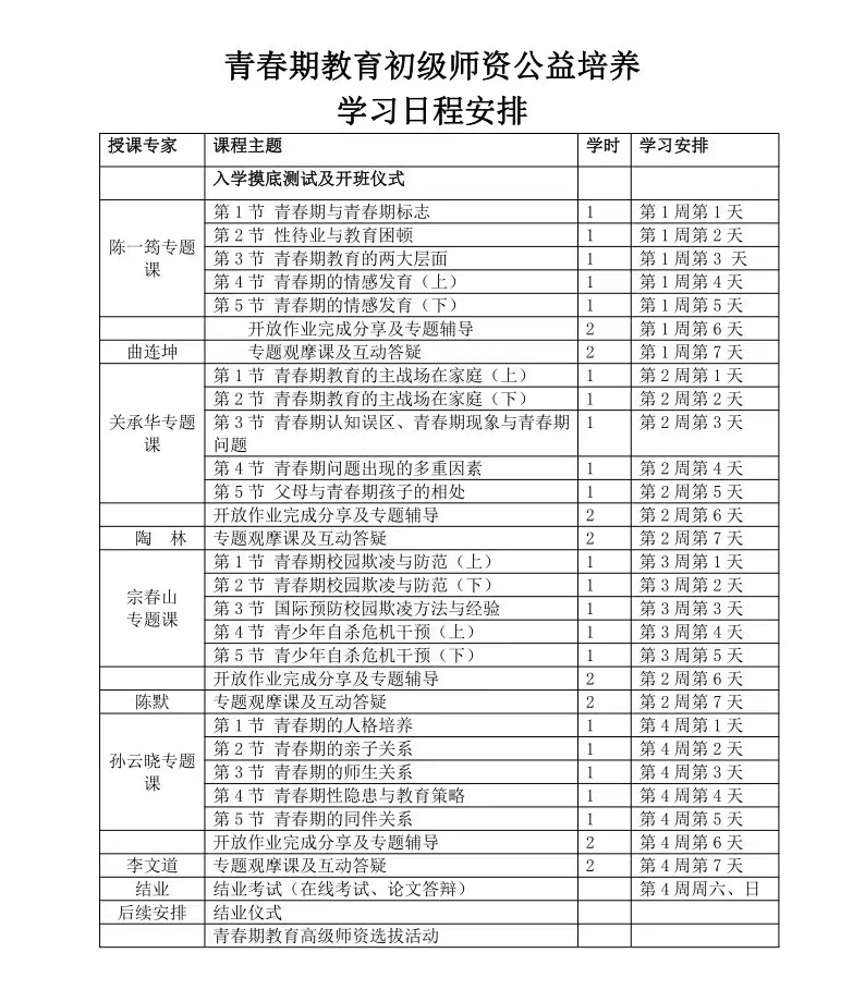 聚焦青春期教育的重点、热点、难点、焦点问题,在专家引领下,通过系统学习训练与实践成长,培养资深专家团队的学术传承者、成果转化者和专业传播者,打造一支有爱心、有情怀、有热情、有能力、有担当的青春期教育骨干师资队伍,为各地开展青少年青春期教育持续赋能,在知识、能力、人才、内容、研发等方面提供有效支撑。具体培训目标如下: