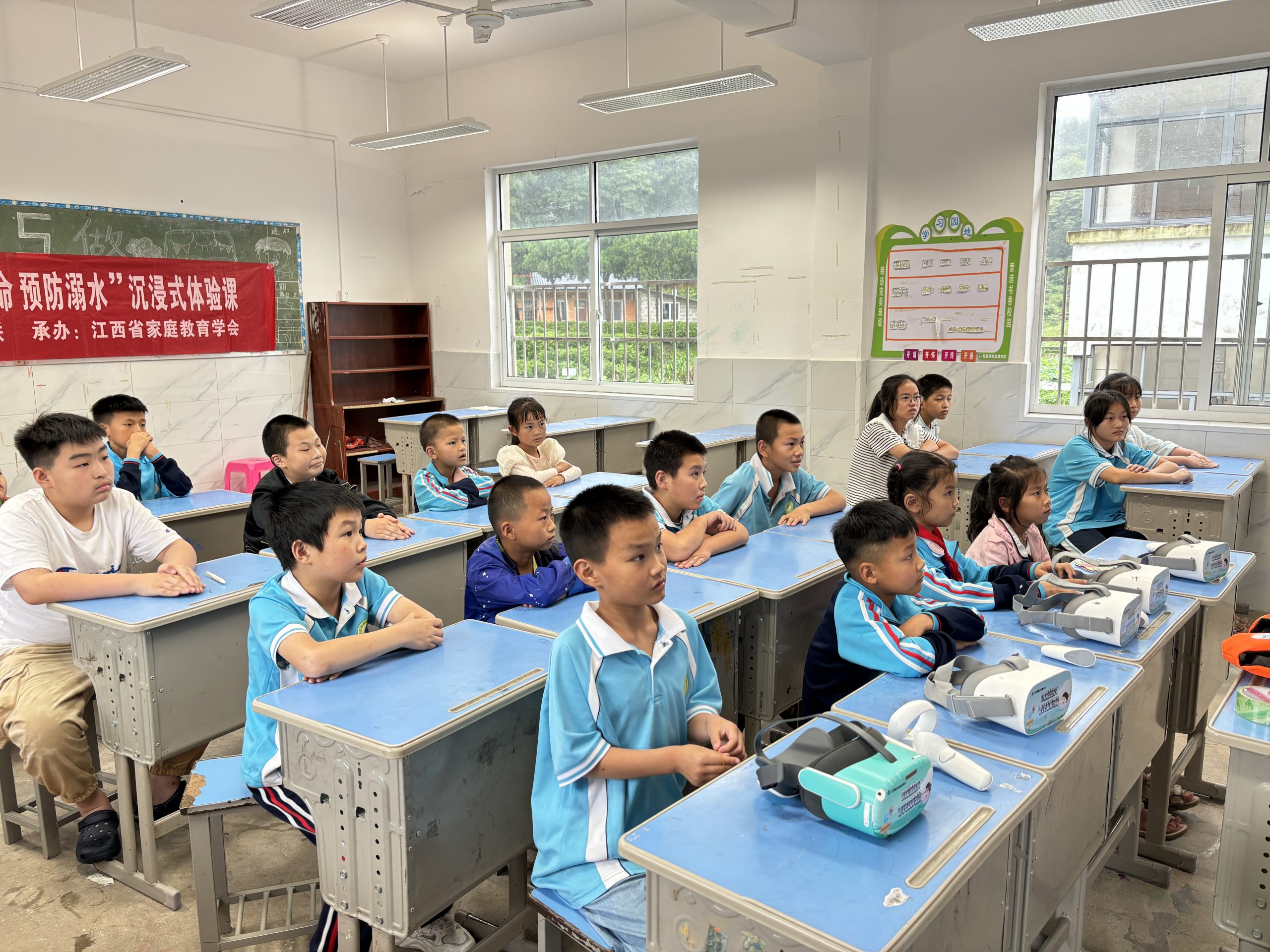 课堂上,江西省家庭教育学会儿童安全讲师们采用VR设备、心肺复苏假人模型、救生衣、救生圈等多种防溺水教具相结合的方式,让孩子们在虚拟环境下,代入真实的溺水情景,沉浸式体验窒息而无法自救的场景,身临其境地感受溺水的恐惧和无助,进一步提高学生的安全防范意识。