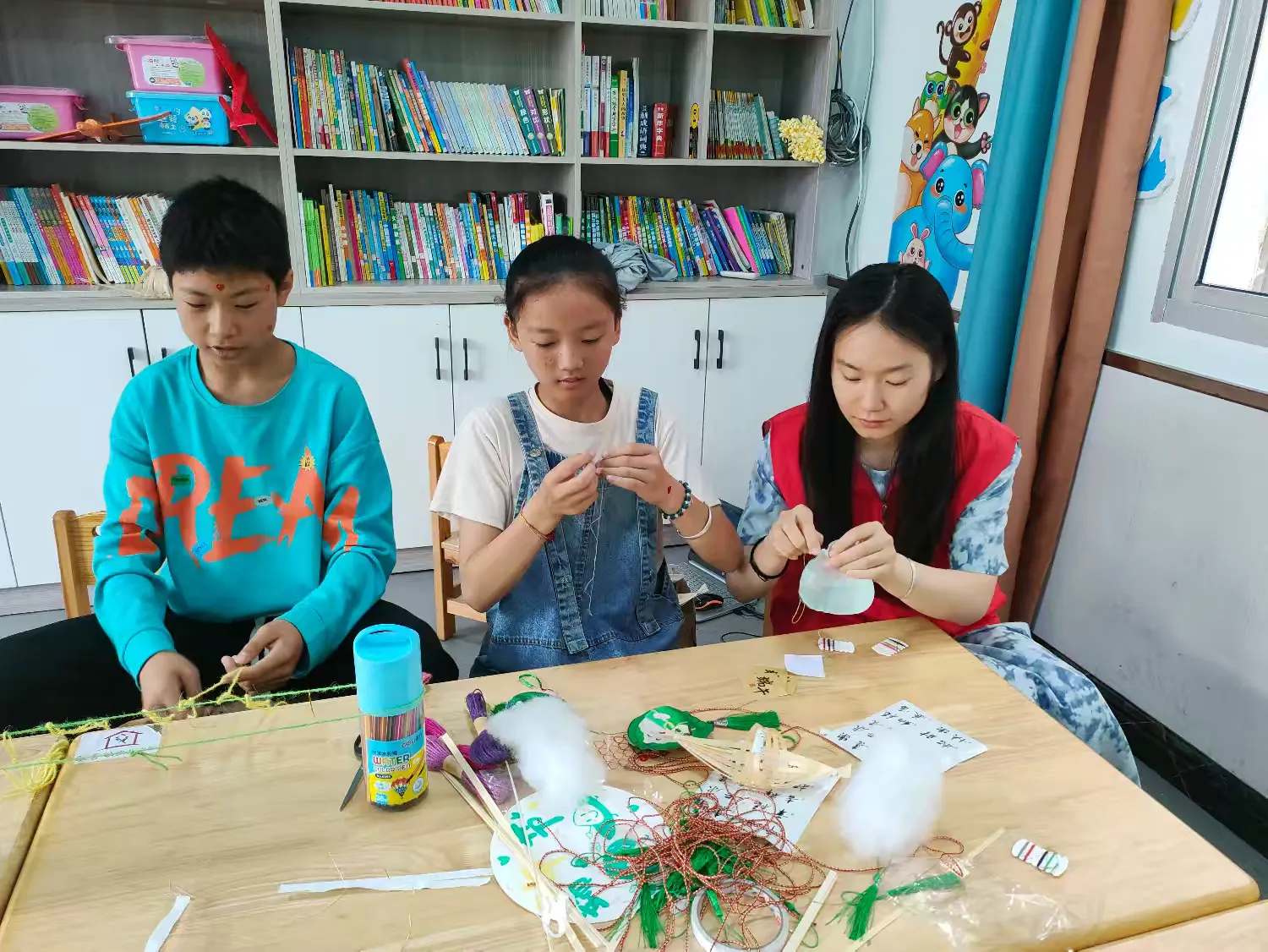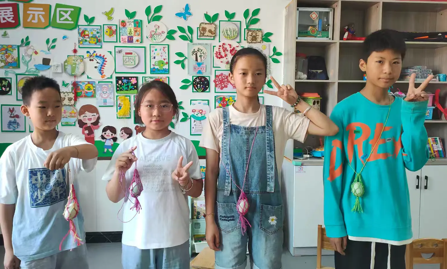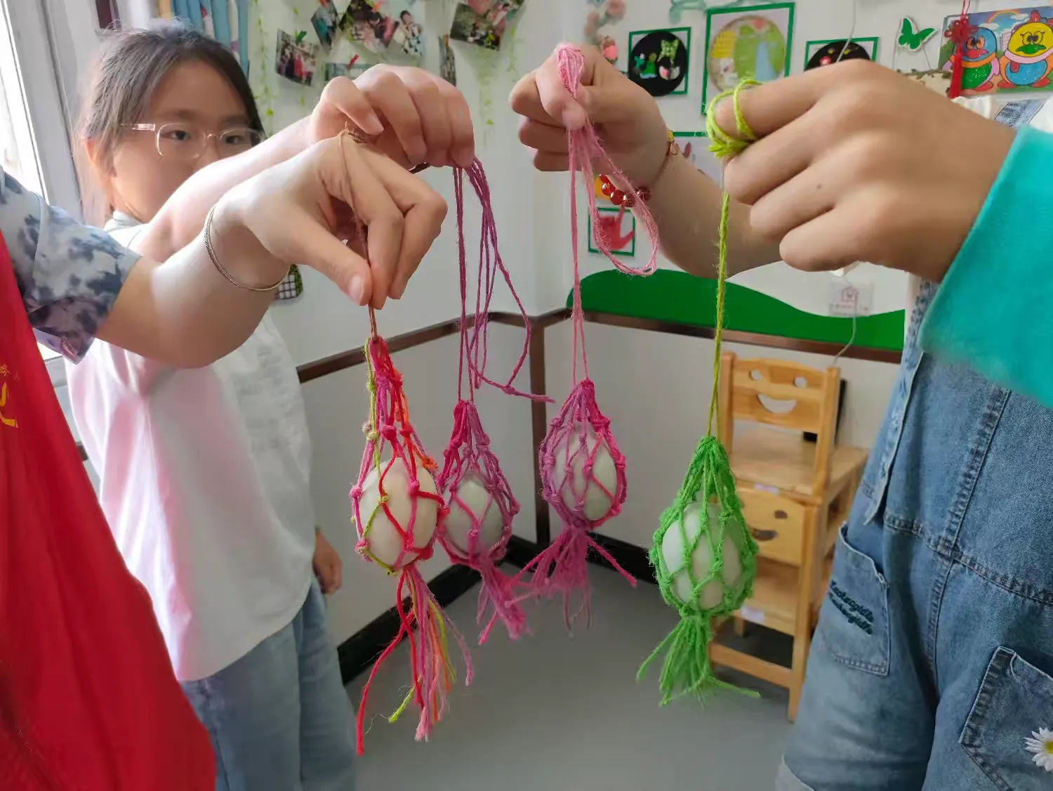 做彩蛋兜,志愿者耐心为孩子们讲解打结的要领,孩子们学得很认真,很快就编织好了,几个孩子将蛋兜挂在胸前,脸上洋溢着成功的喜悦