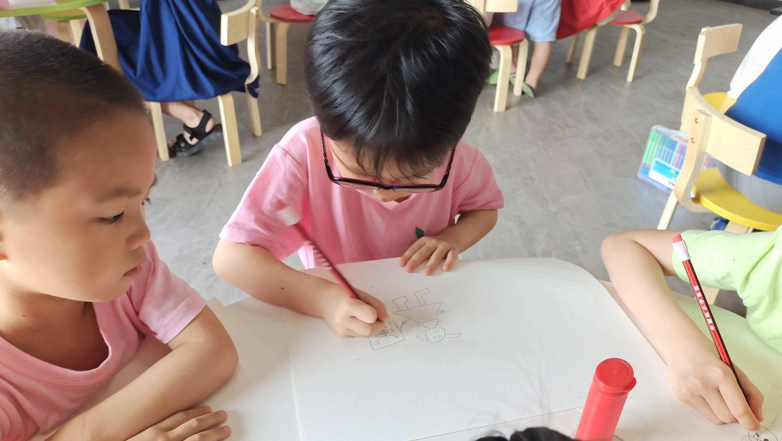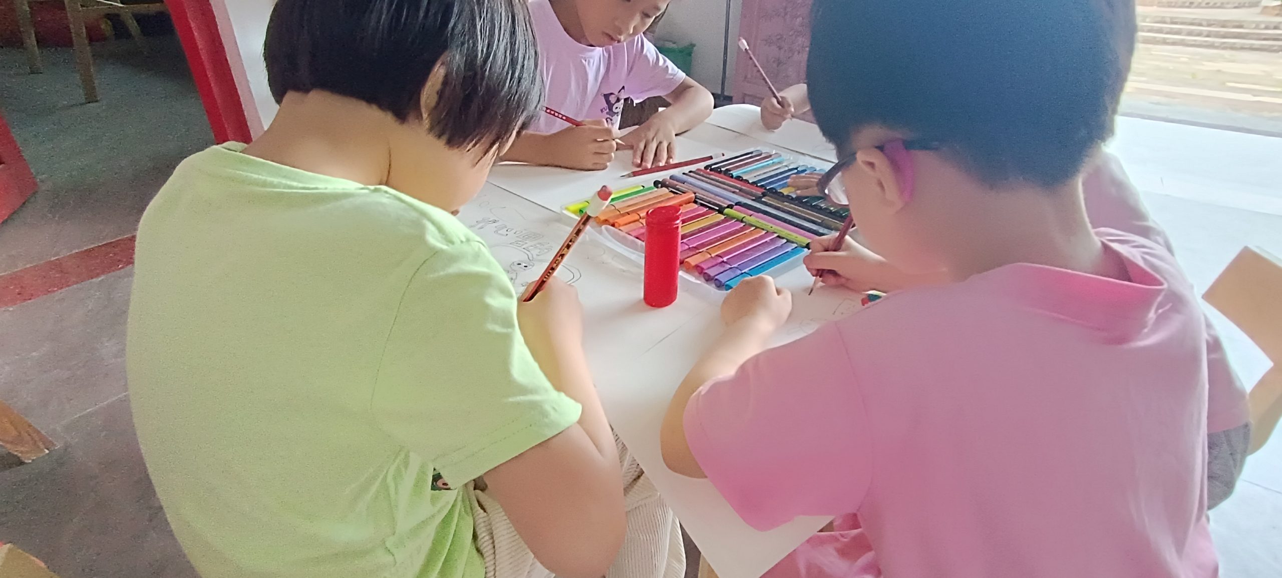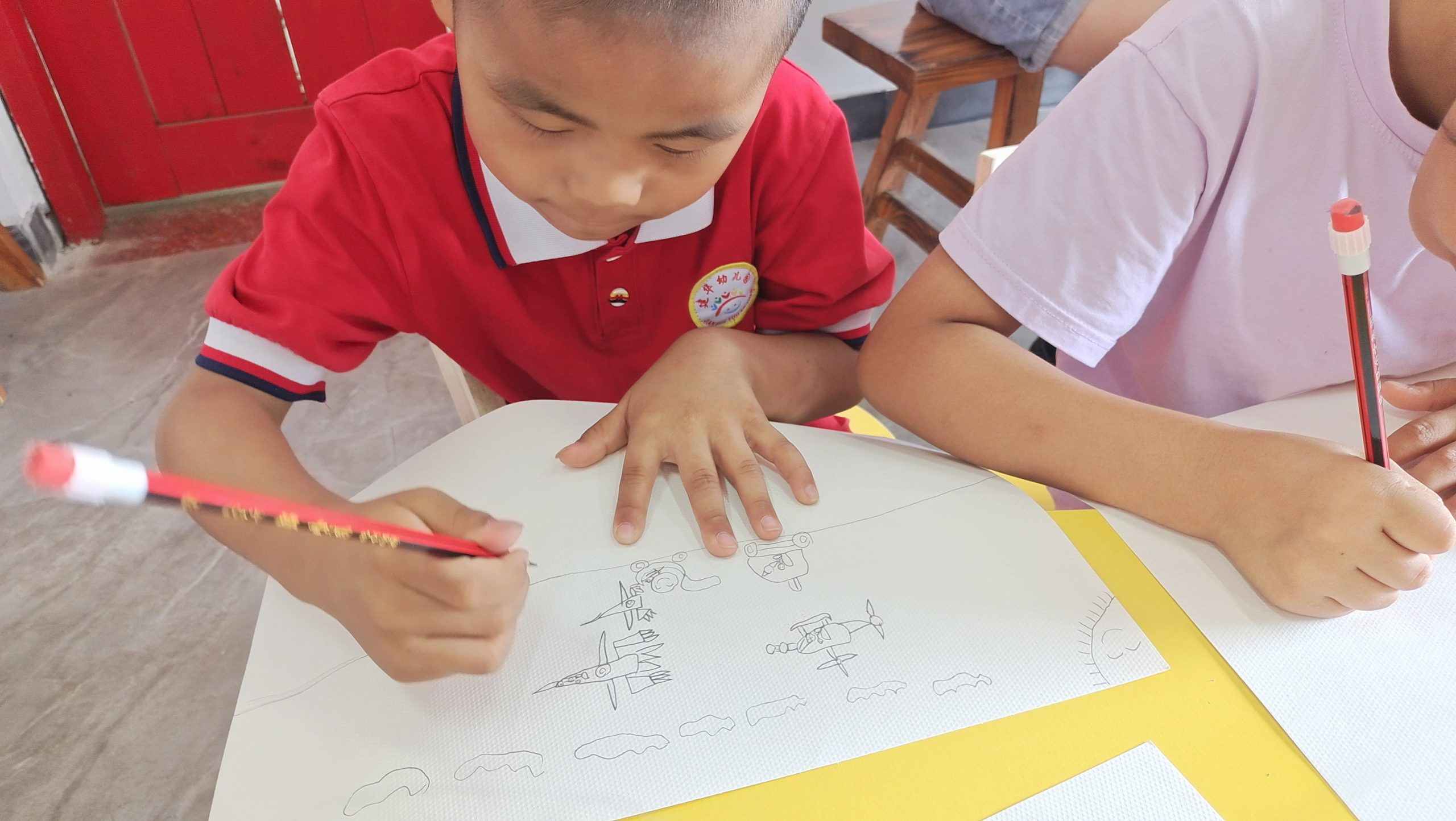 孩子们通过彩笔画出自己心目中的英雄以及他们所看到的和平盛世。