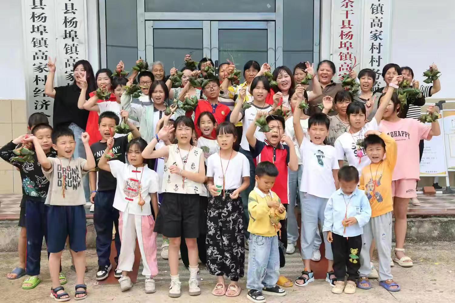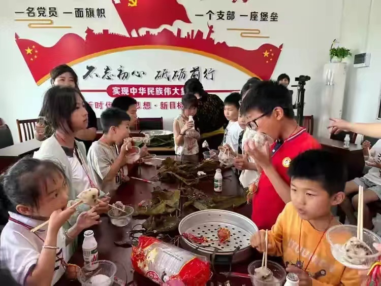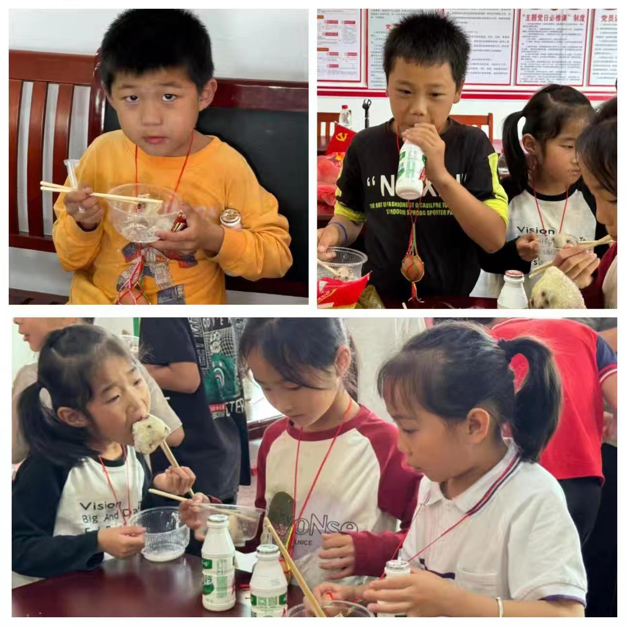 包完粽子之后,志愿者与孩子们一起分享煮熟的粽子,并为孩子们分发五彩蛋和牛奶,送上美好祝愿。
