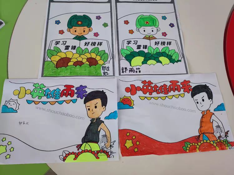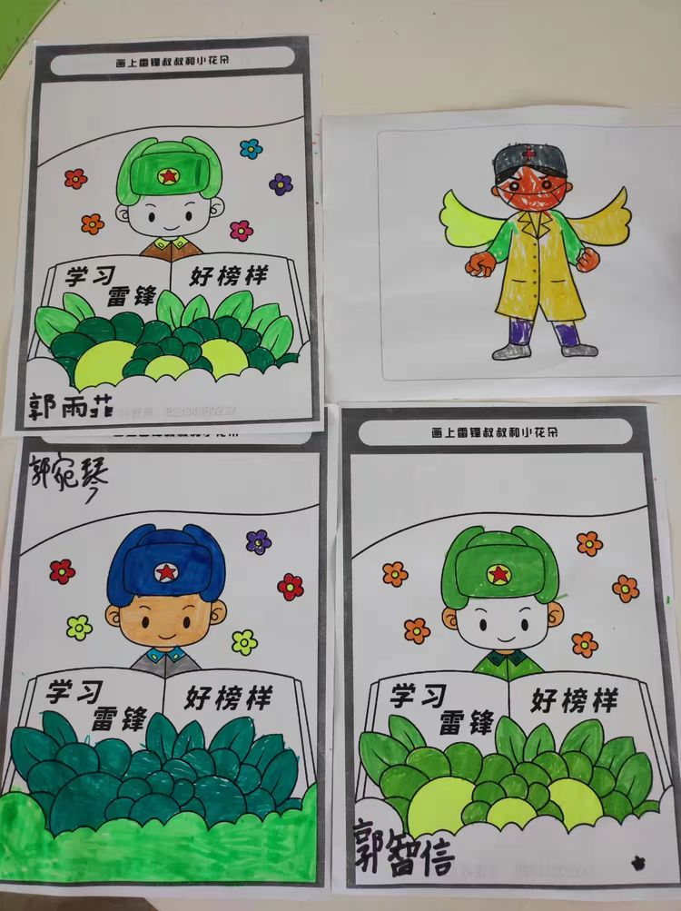 活动四:你心中的英雄。鼓励孩子们用彩色画出自己心中的英雄模样。“雨来”、“雷锋”、“医生”被孩子们描绘的惟妙惟肖,这些作品表达了孩子们对英雄的敬佩之情。