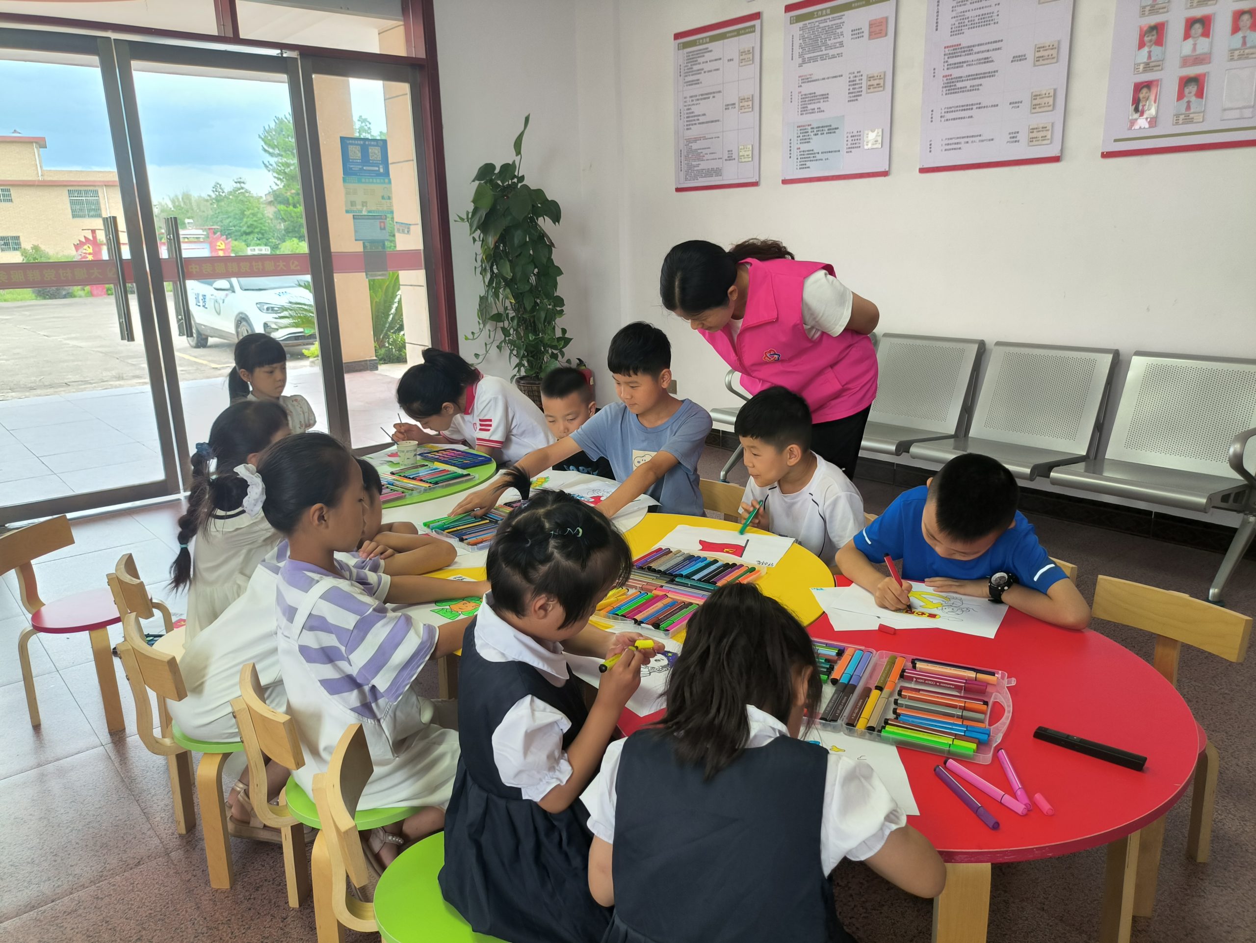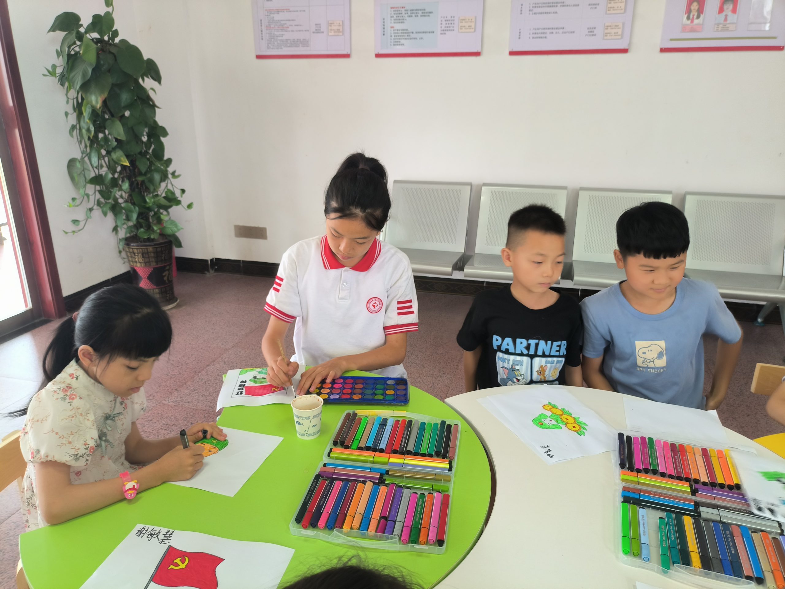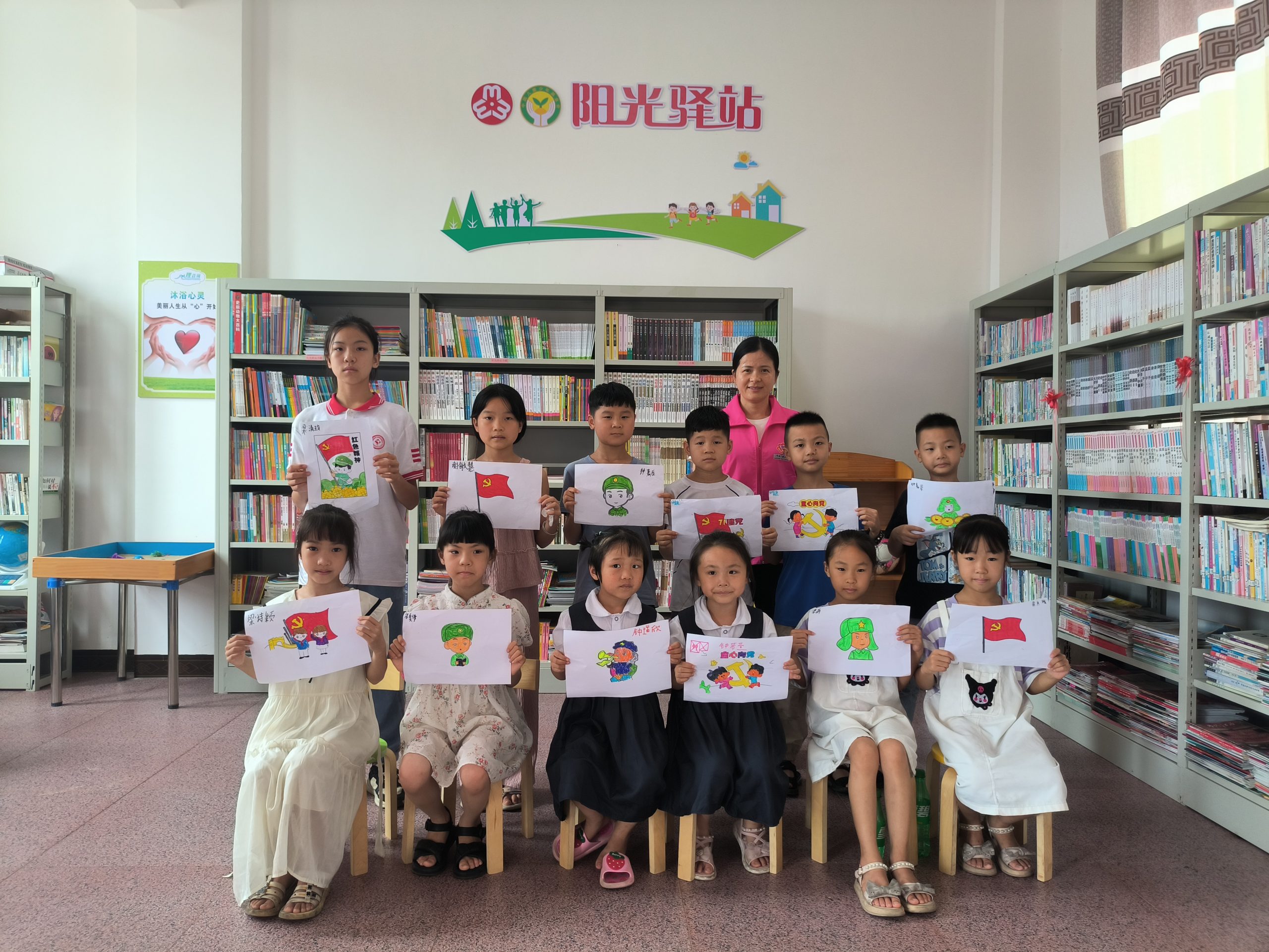 听完红船故事,阳光驿站工作人员鼓励孩子们画出自己心中的英雄模样或者围绕”建党节“这个主题绘画。“雨来”“雷锋””党旗“被孩子们描绘的惟妙惟肖,这些作品表达了孩子们对英雄的敬佩之情,对中国共产党的热爱之情。