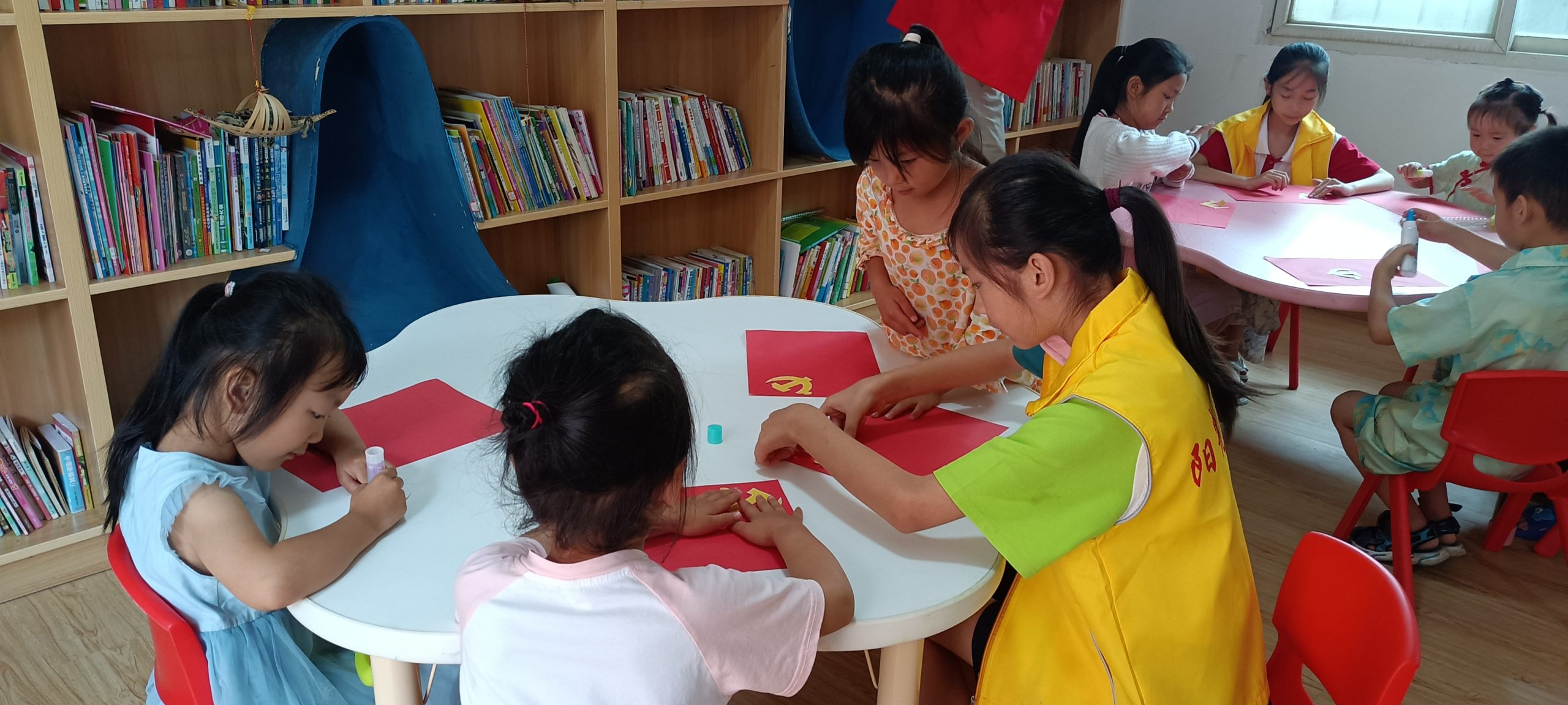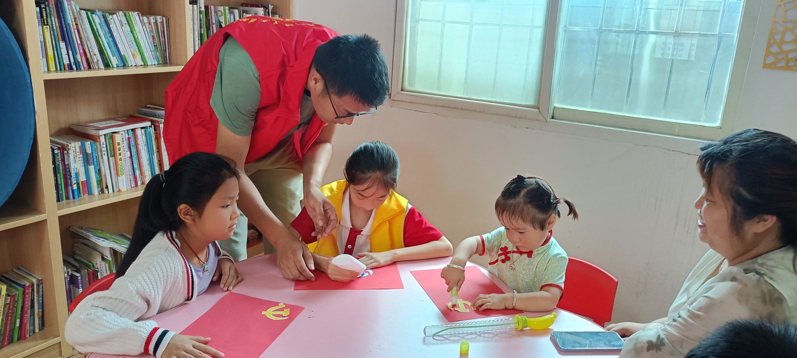 随后,进入了亲手制作党旗的环节。志愿者为小朋友们准备了红色和黄色的纸张、剪刀、胶水等材料,并耐心地讲解制作步骤。小朋友们在老师和志愿者的帮助下,认真地裁剪、粘贴,用自己稚嫩的双手制作出一面面鲜艳的党旗。制作完成后,他们的脸上情不自禁地洋溢着自豪和喜悦。