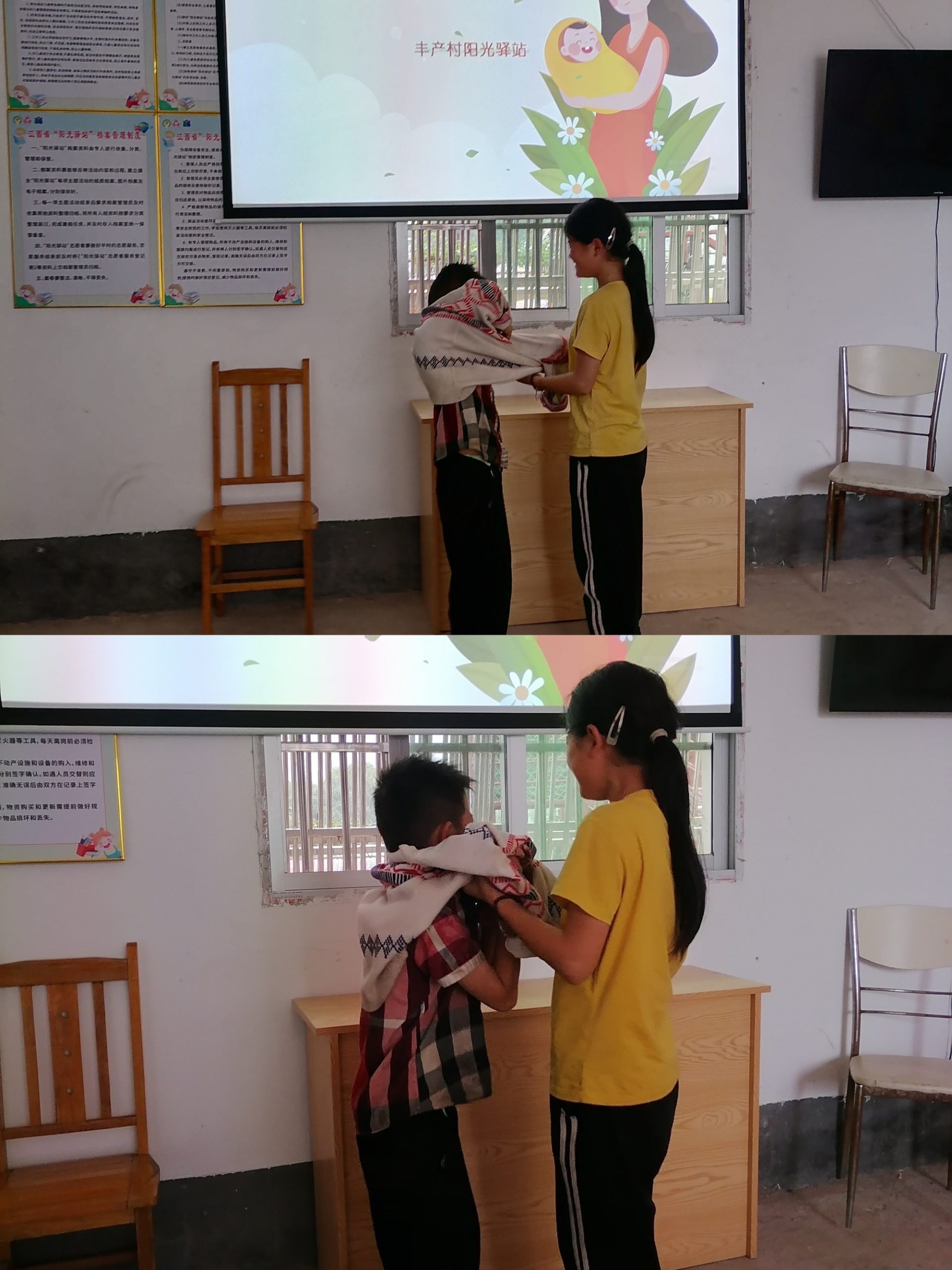 工作人员邀请儿童进行穿衣服比赛:两名儿童一组,一名大龄 儿童作为母亲给另一名小龄儿童穿要求细 心,动作轻柔,穿戴整齐且速度快。最后工作人员小结:说说给孩子 穿衣服的感受,体会妈妈哺育我们的辛苦.