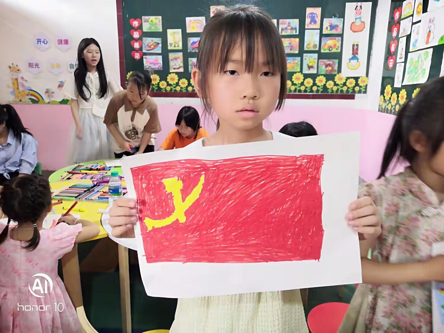 “我们是祖国的花朵,阳光下尽情唱着歌,看我们幸福的生活,像花儿五彩的颜色……,”伴随着轻快的音乐声,孩子们一笔一画认真的绘出党旗风采。