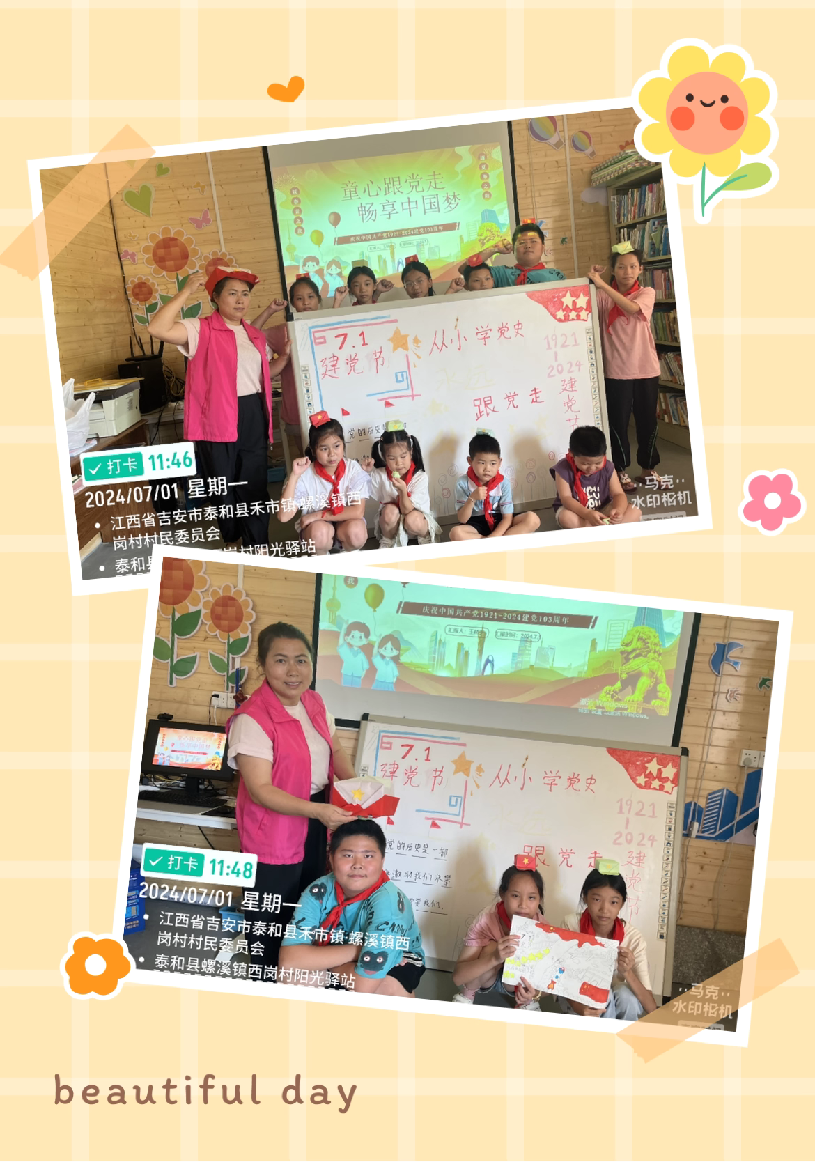 是孩子们用自己的方式为建党节献上了真诚的礼物和祝福,孩子们合唱《没有共产党就没有新中国》,他们用稚嫩的歌声表达对党深深的祝福及热爱。孩子们通过手里的彩笔,画党旗、涂党旗、做党旗,在一点一滴的过程中,他们认识党旗、了解党旗,知道党旗是中国共产党的象征和标志,最后和党旗合影,张张笑脸燃起宝贝们对党最真挚的情。