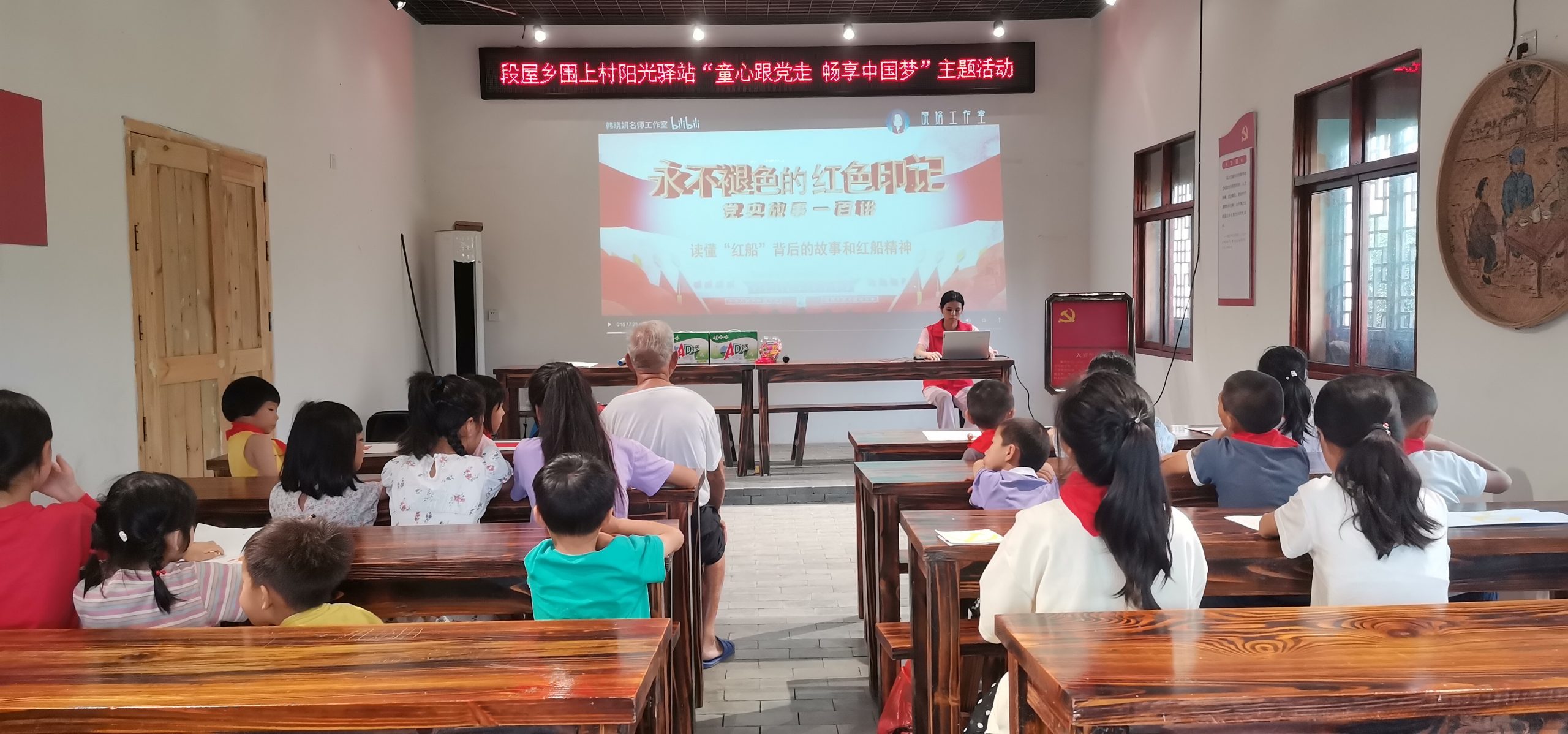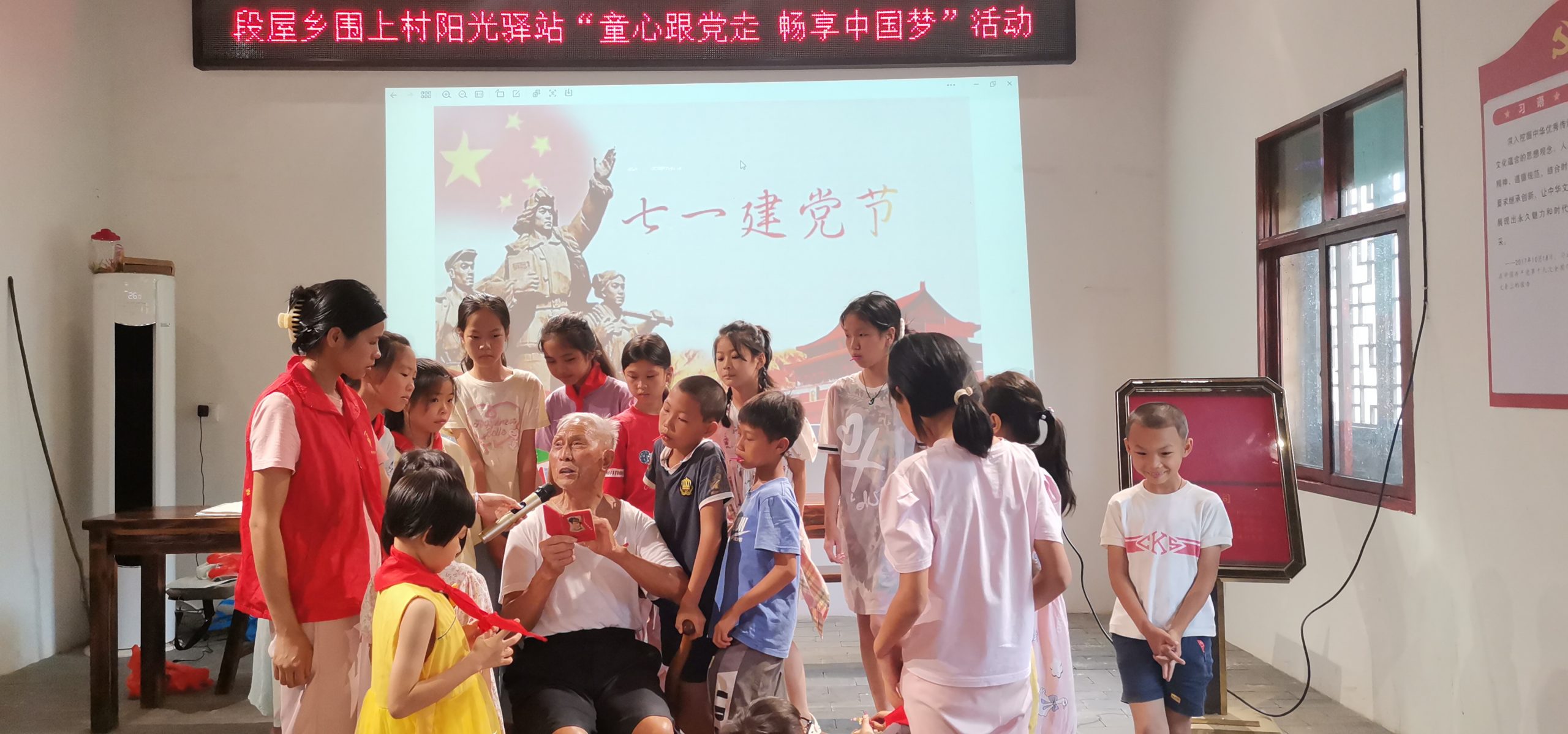 为加强儿童思想道德建设,增进未成年人爱党爱国的情感,中国共产党成立103周年之际,2024年7月1日段屋乡围上村阳光驿站开展“童心跟党走 畅享中国梦”主题。引导儿童认识党旗与党徽,进一步了解建党节党旗是红色的,镰刀代表农民,铁锤代表工人,是黄色的,象征中国共产党领导的工人和农民。弘扬爱国主义精神,抒发儿童的积极向党的情怀。过一个快乐、向上的“七一”建党节,让孩子们在活动中展示风采、在参与中体验成功,幸福快乐地成长。