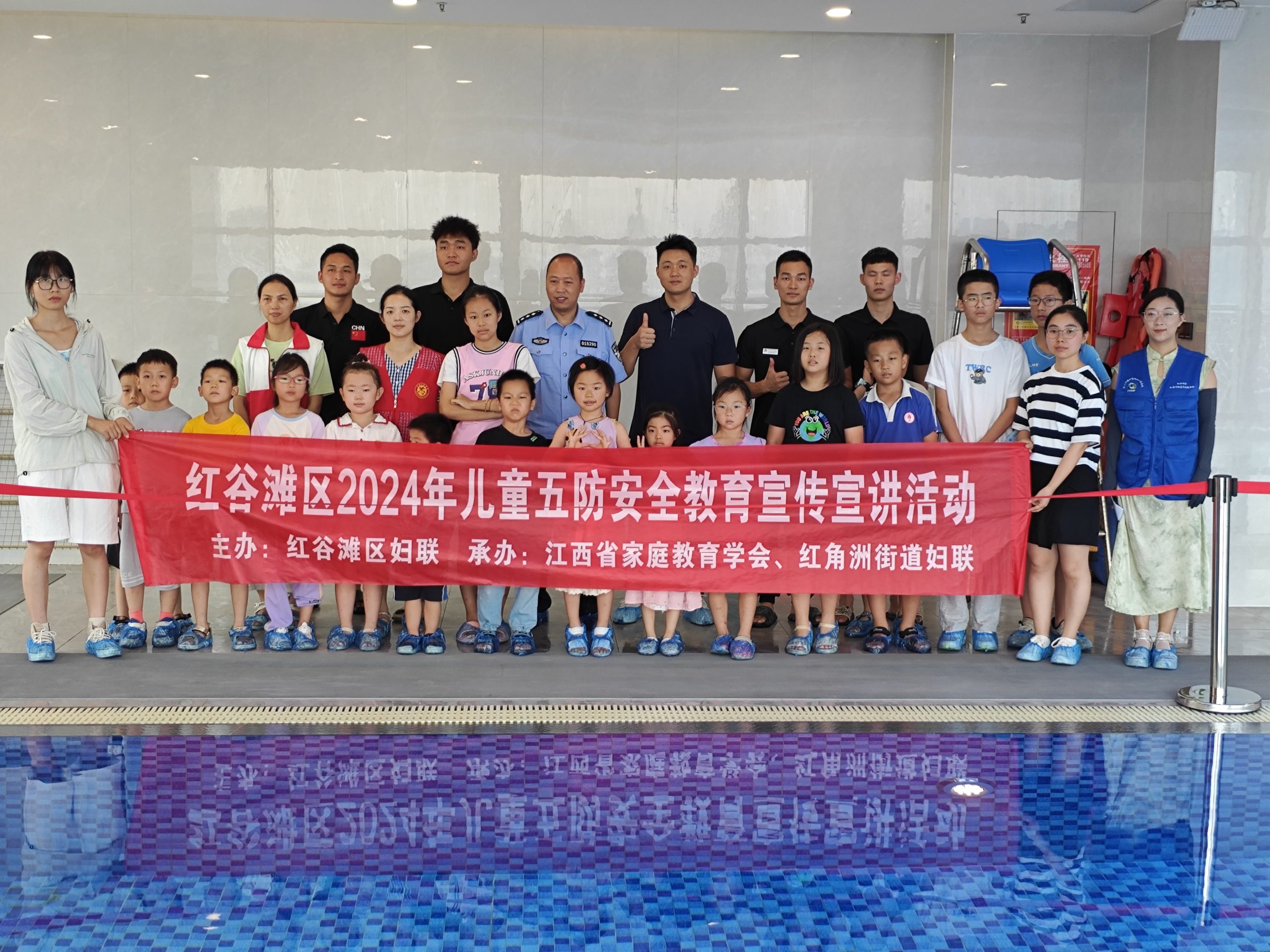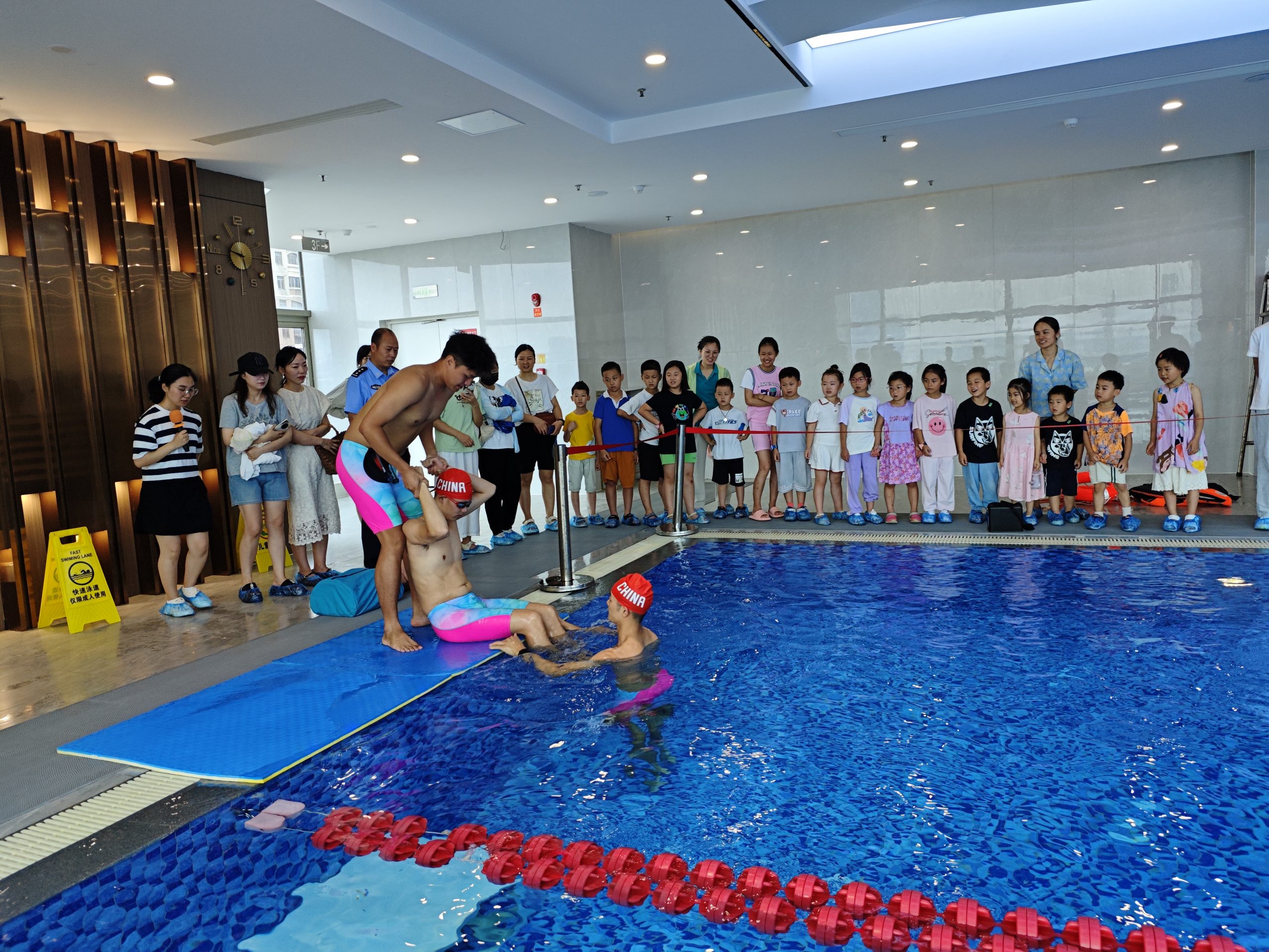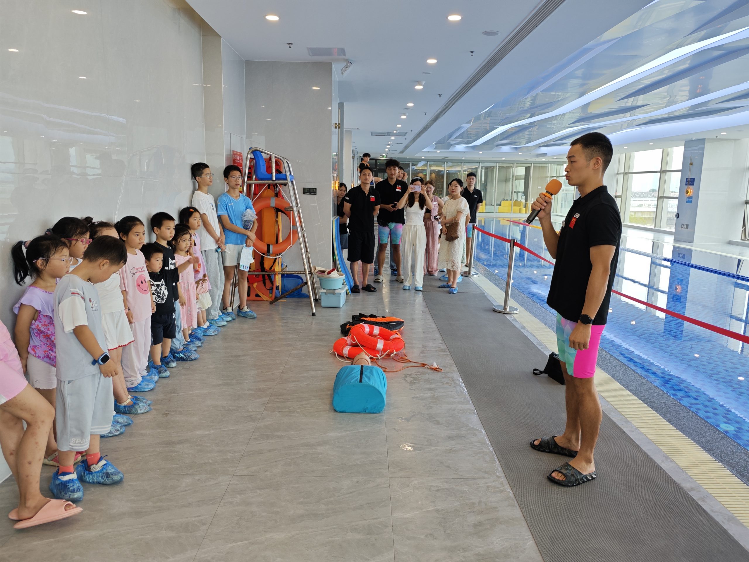 7月15日,红谷滩区红角洲街道香域滨江社区在辖区内的沃尔顿酒店游泳馆内,面向社区的儿童及家长开展了一场沉浸式防溺水教学活动,江西省家庭教育学会的儿童安全讲师以及游泳馆的专业教练和救生员们化身安全卫士,通过生动形象的讲解和实际演示,为活动参与者们上了一堂精彩纷呈的防溺水安全体验课。