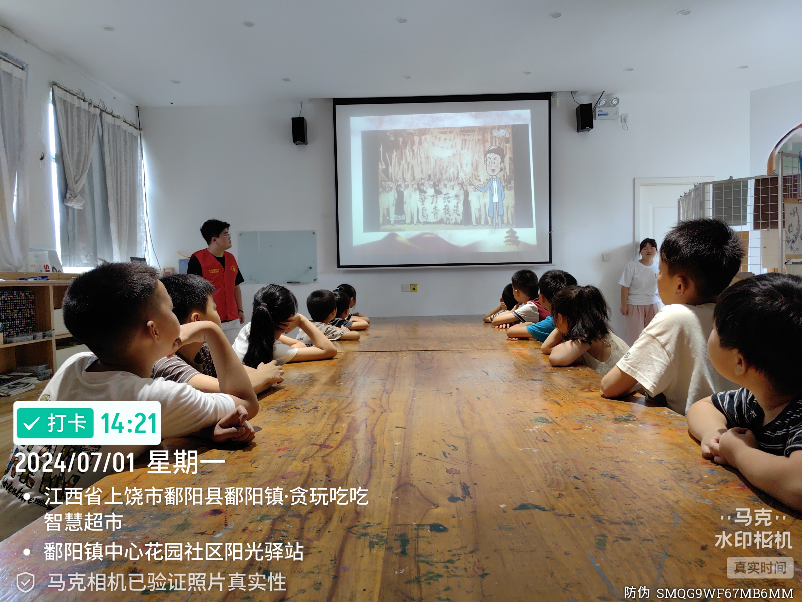 活动开始工作人员向小朋友们介绍建党节的由来。引导儿童了解建党节时间。由于当时的中国共产党忙着革命斗争,并没有条件进行庆祝。后来在党成立二十周年的时候,中共中央正式规定将7月1日作为党的诞生纪念日。工作人员讲解:党旗是红色的,镰刀代表农民,铁锤代表工人, 是黄色的,象征中国共产党领导的工人和农民。
