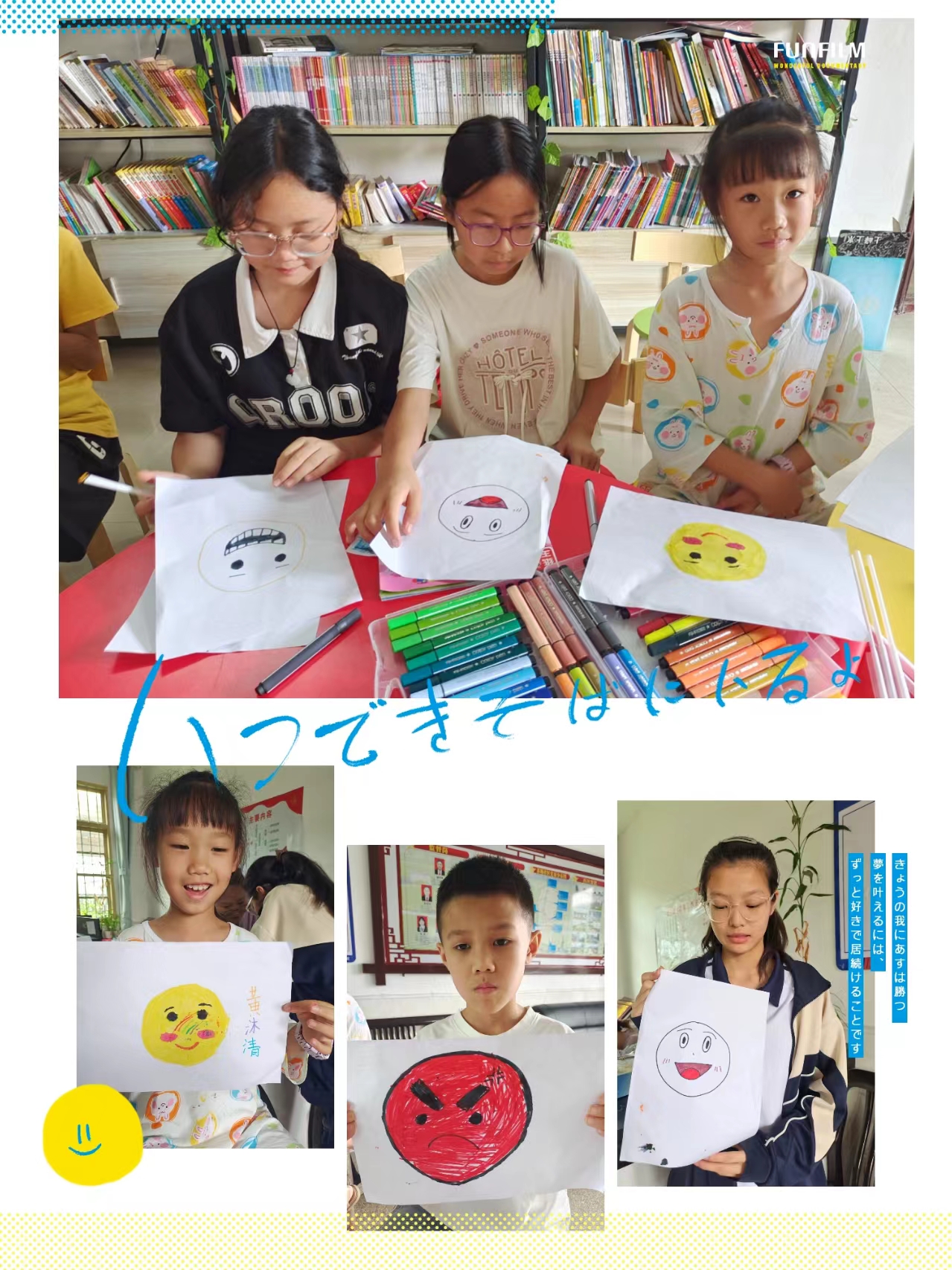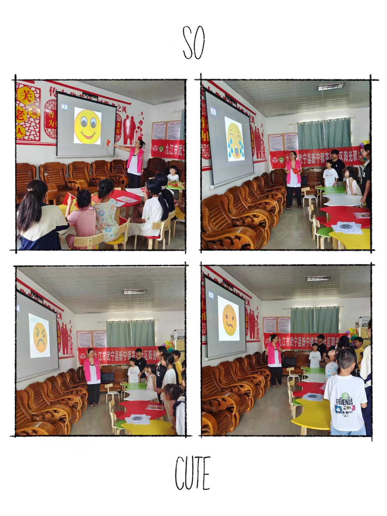 志愿者老师展示喜、怒 、哀、乐、忧等情绪,让孩子们表演各种情绪,并画出最喜欢的表情。结束后,为孩子们播放电影《冲出亚马逊》。