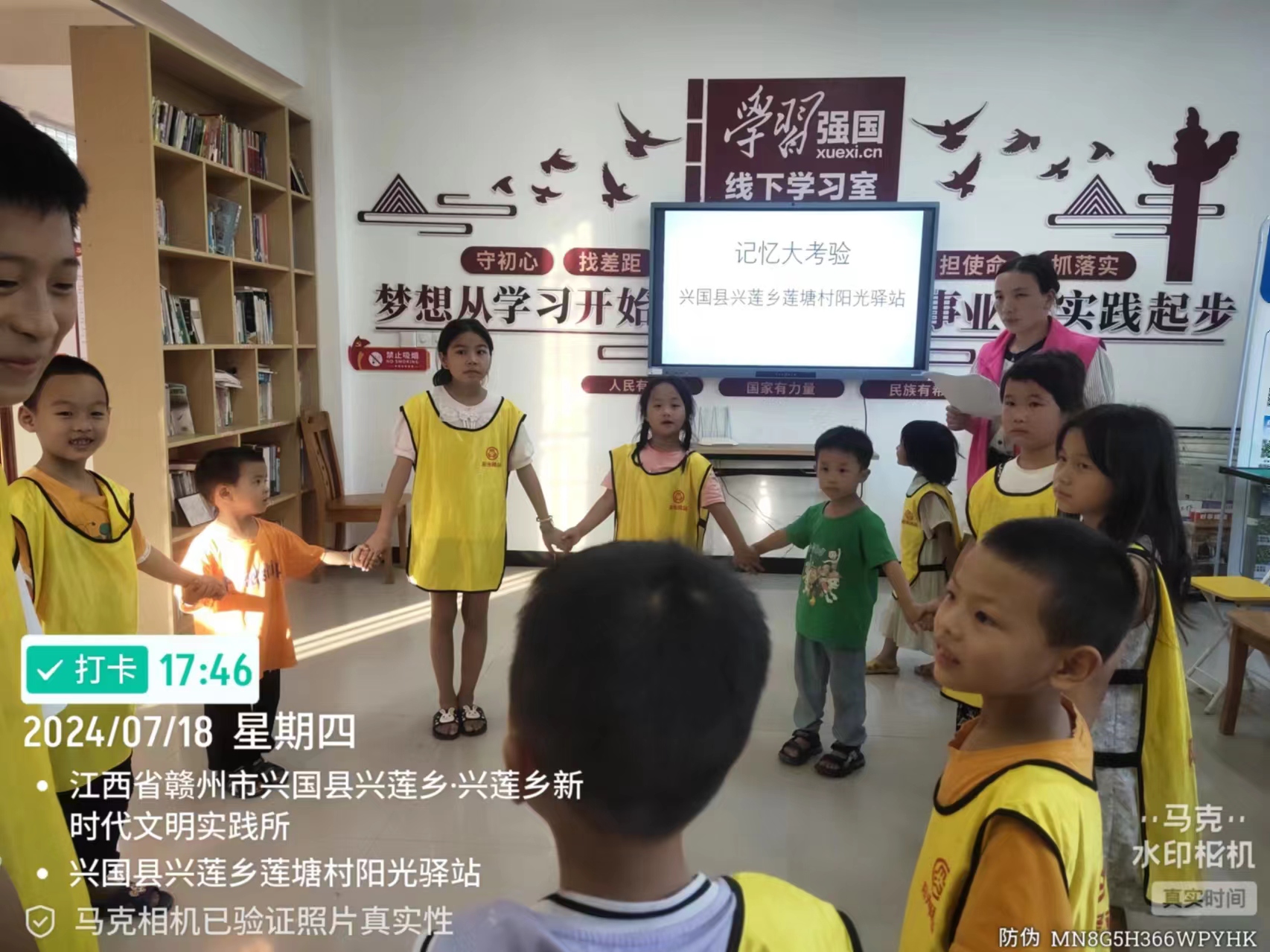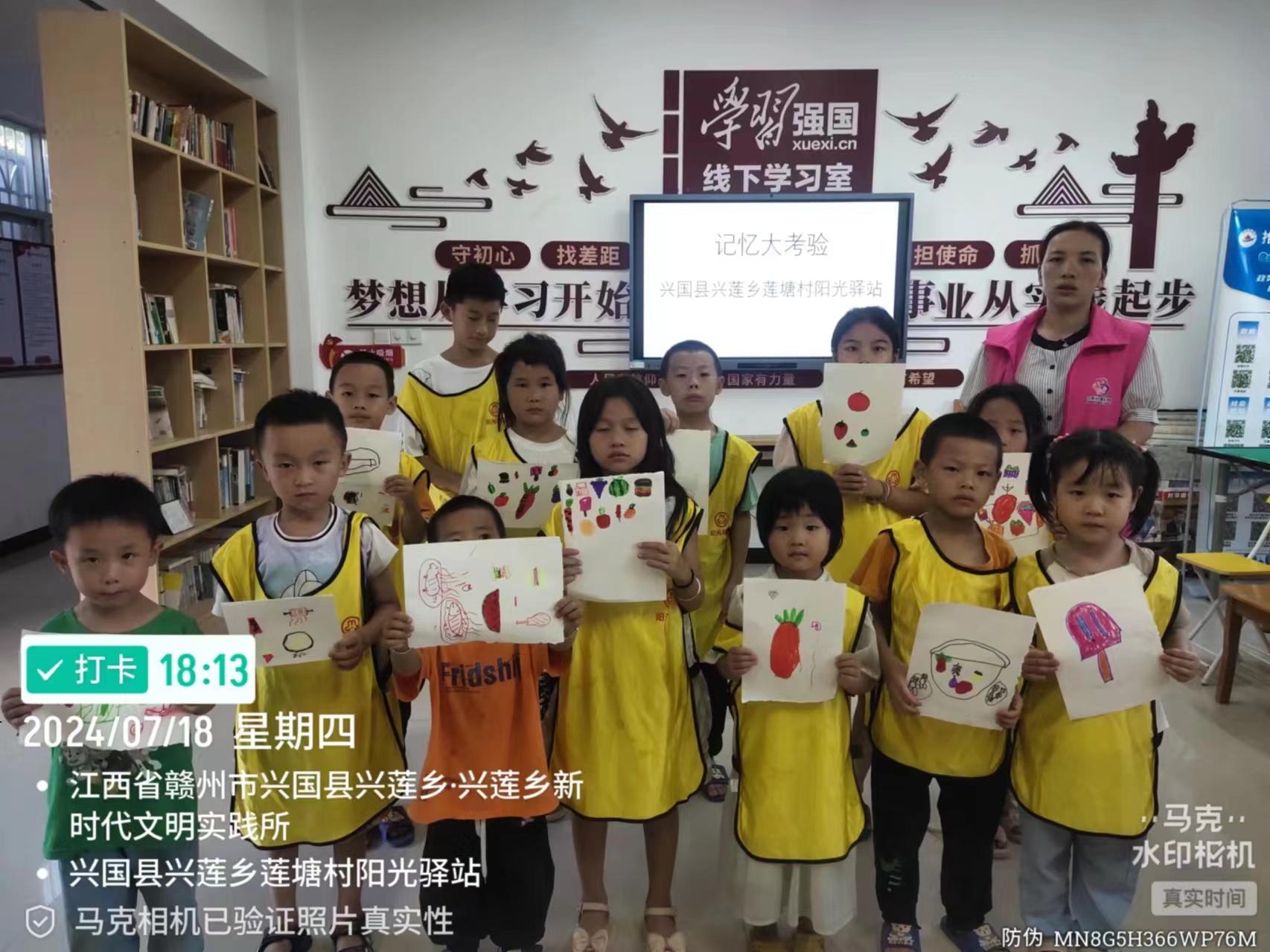 活动中说明规则,兴莲乡莲塘村阳光驿站志愿者组织到场的小朋友围成一个圈,第一个小朋友说出自己今天所吃的食物。第二个小朋友接着说出第一个小朋友所说的食物,然后新增一种食物。轮到第三个小朋友要重复第一个小朋友和第二个小朋友所说的还要新增一种自己吃的食物。这样重复等到说出有误的那个小朋友则为淘汰。