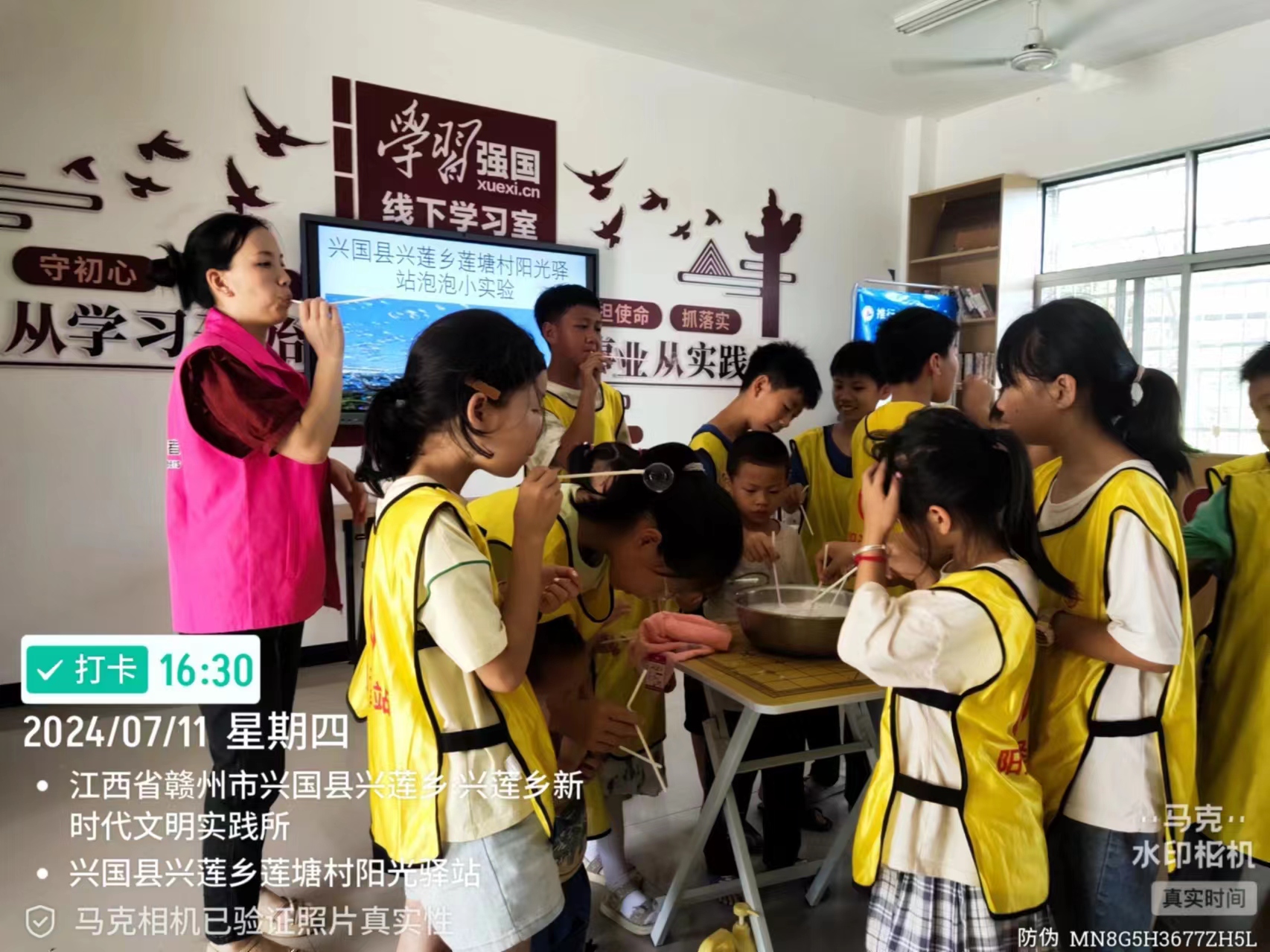 首先,兴国县兴莲乡莲塘村阳光驿站的志愿者制作泡泡水需要准备一些材料。我们需要一瓶洗洁精或者洗衣液,一些清水,还有一个容器用来混合。将清水倒入容器中,然后加入适量的洗洁精或洗衣液,搅拌均匀即可。这样,我们就制作好了泡泡水。泡泡水制作好之后,我们可以开始享受制作泡泡的乐趣了。拿起一个泡泡水的吹泡泡棒,蘸取适量的泡泡水,然后轻轻地吹出去,就会看到漂亮的泡泡出现了。泡泡飘飘,五彩斑斓,给人一种童真的快乐。