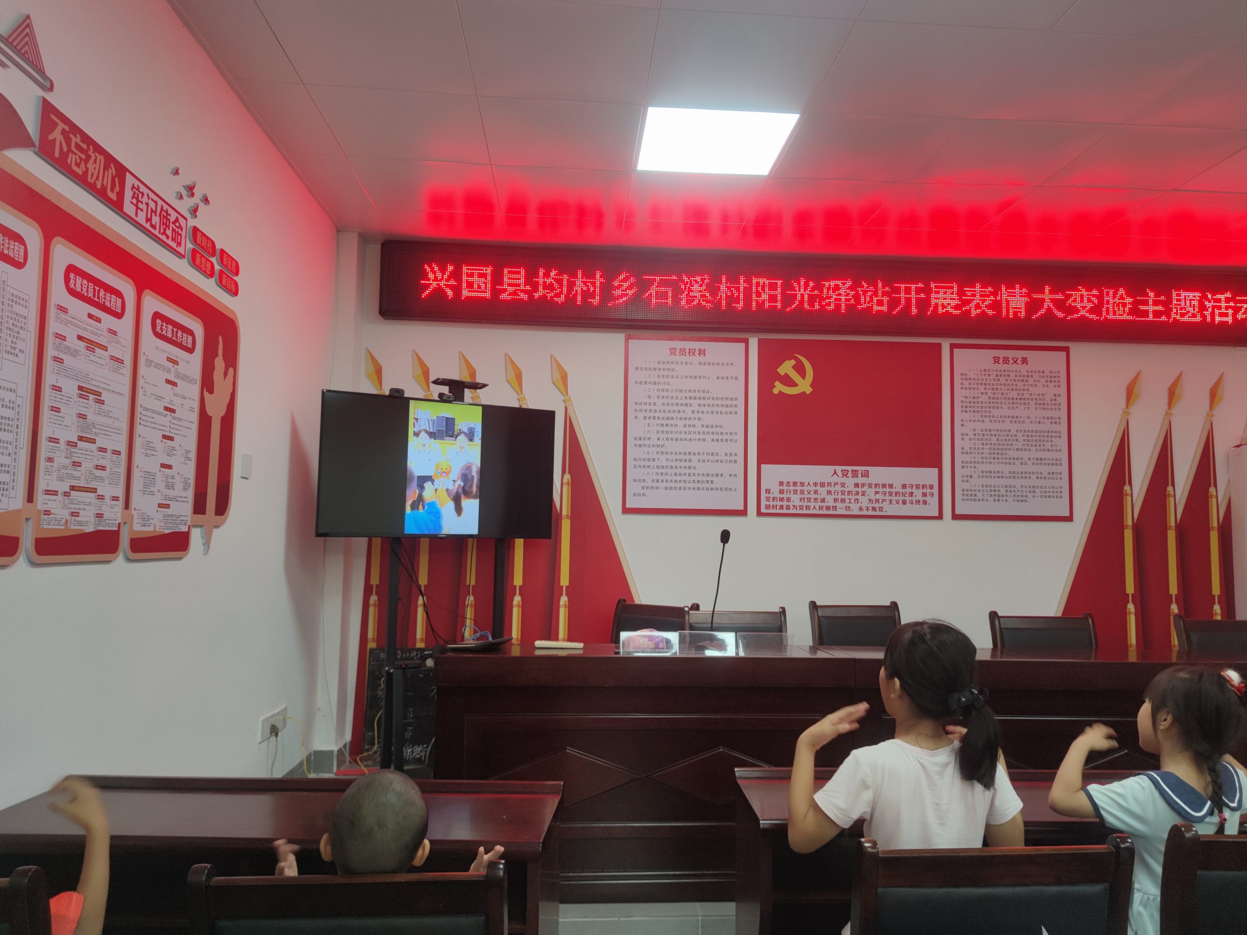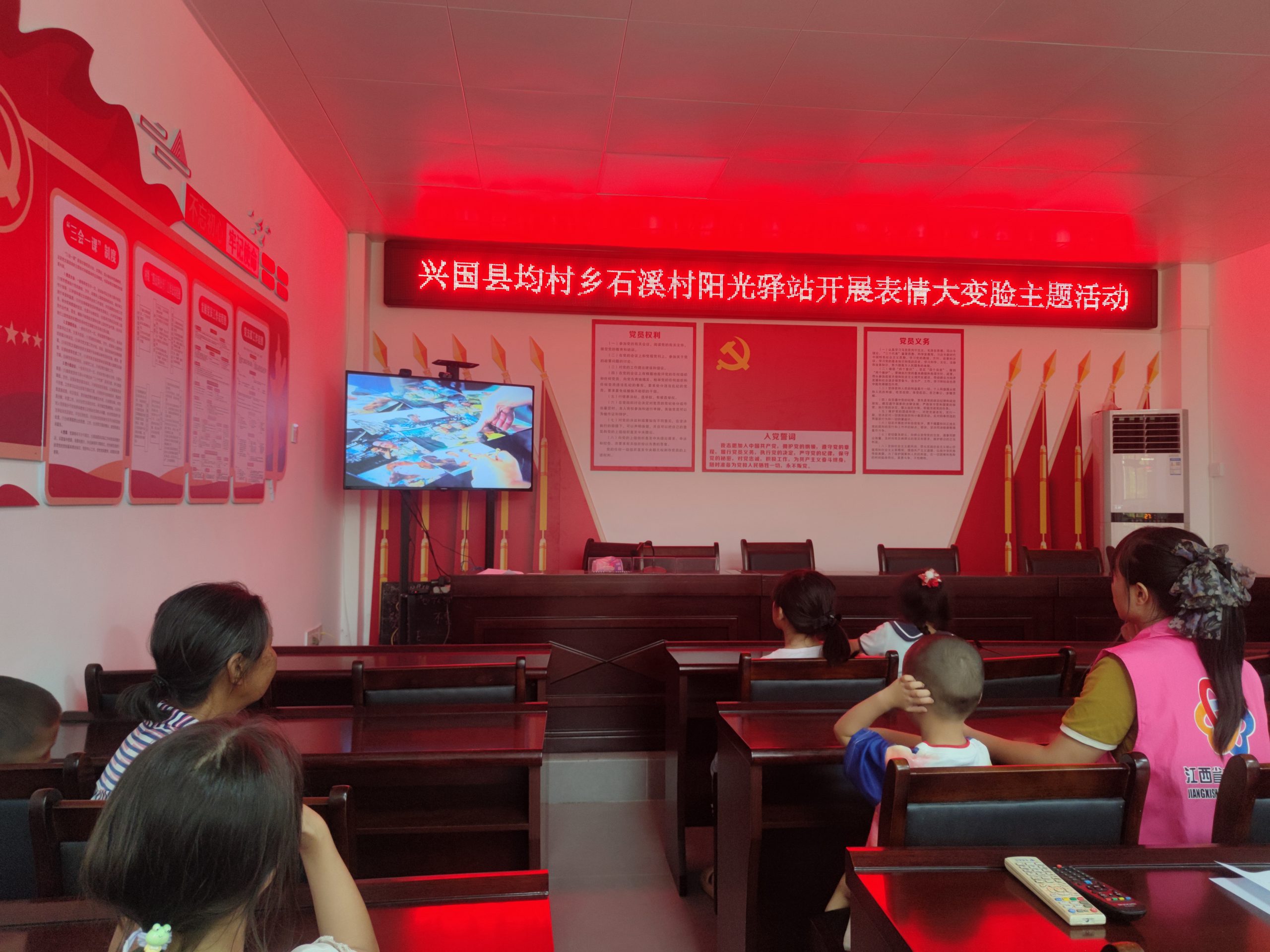 志愿者跟小朋友一起做“喜,怒,哀,乐,忧”手势舞,邀请小朋友表演喜,怒,哀,乐,忧”,然后场下的儿童把他们画下来。播放电影《冲出亚马逊》。