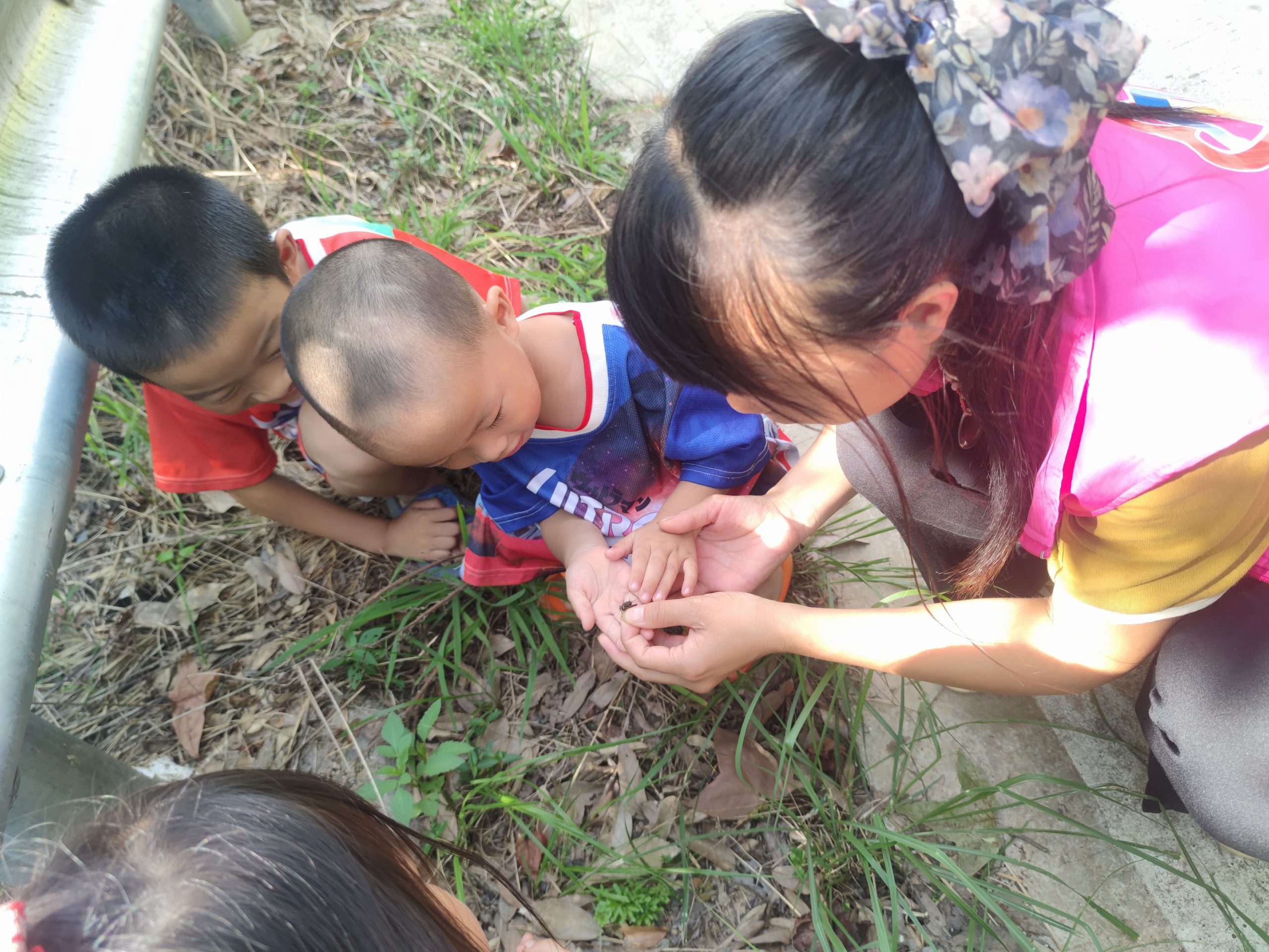 志愿者带孩子们前往路边寻找昆虫,认识昆虫,一起跳《知了》手势舞,观看《闪闪红星》电影。