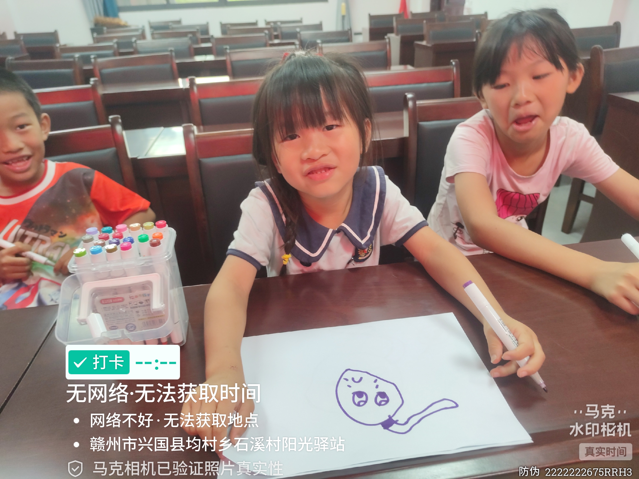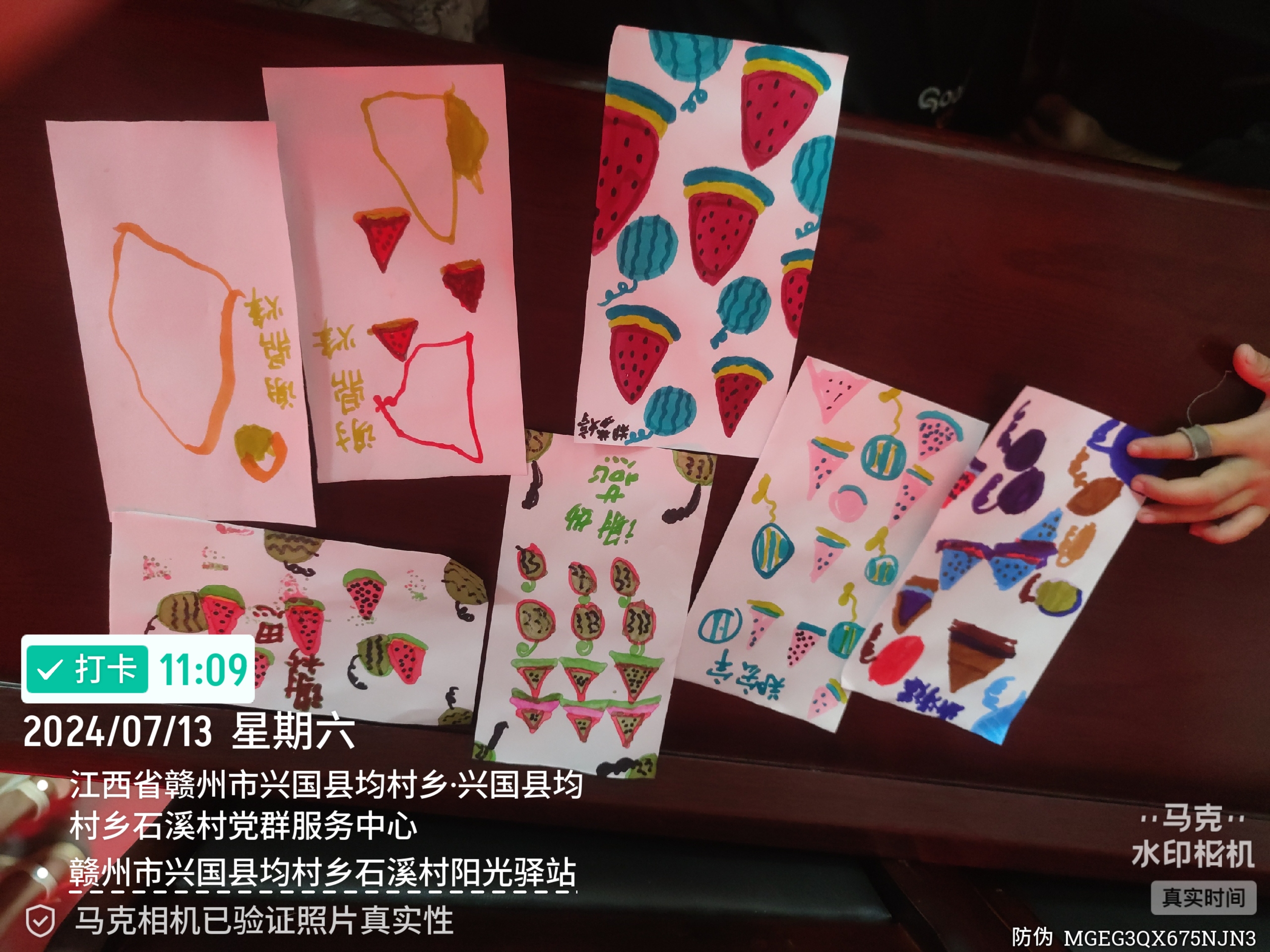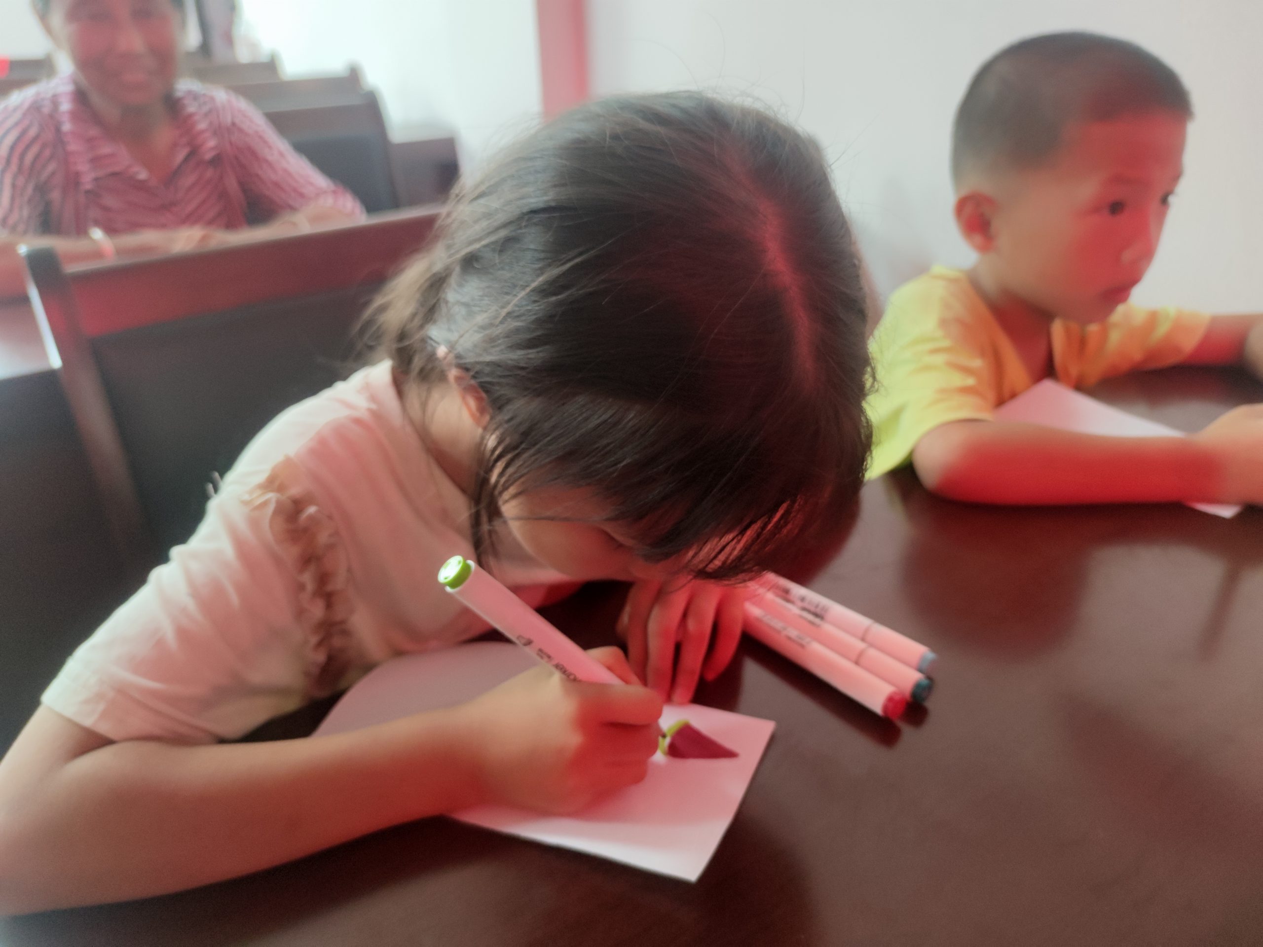 志愿者带领孩子们一去跳《夏日憧憬舞》,一起制作《夏日书签》,观看《红海行动》电影。