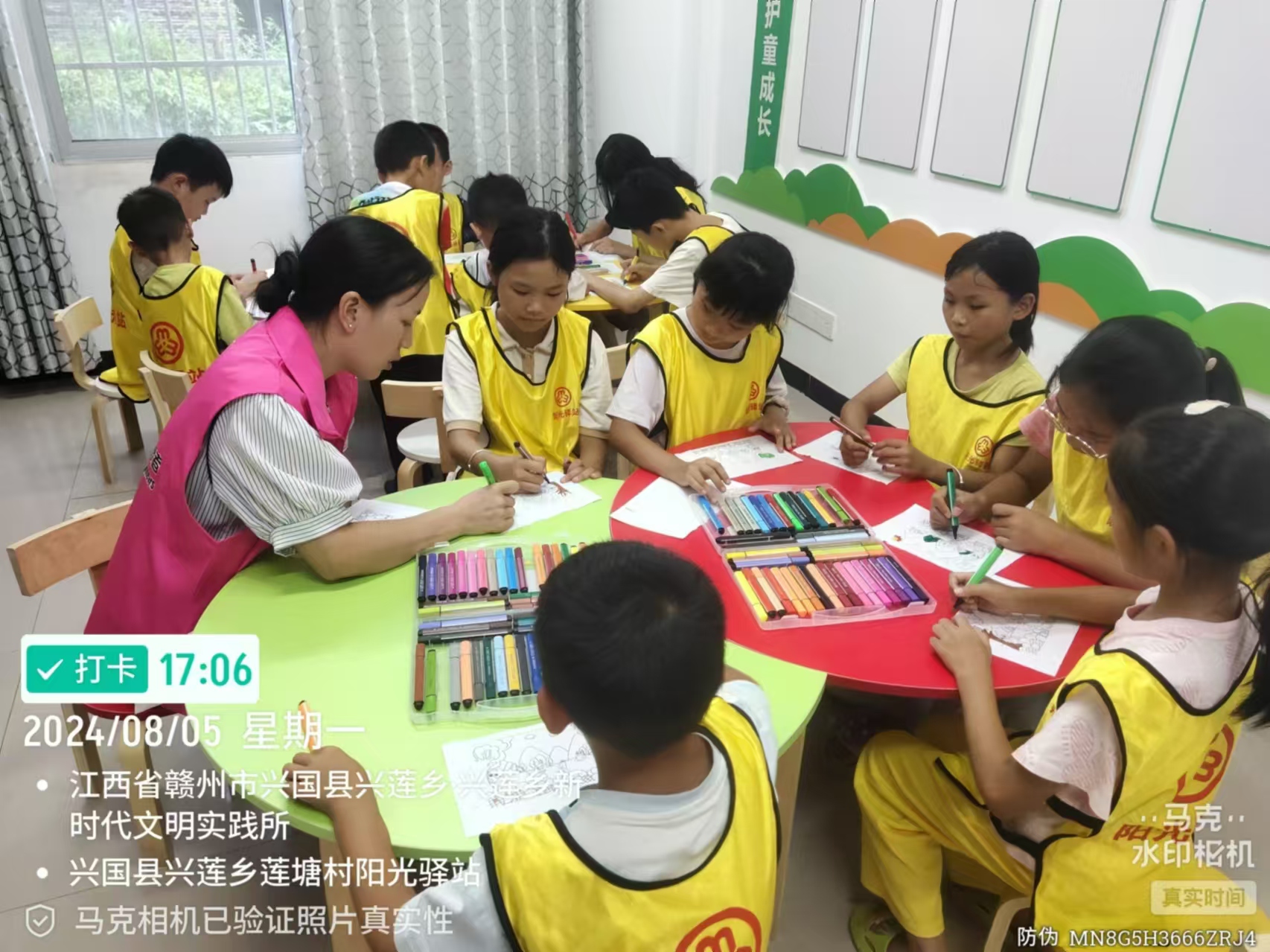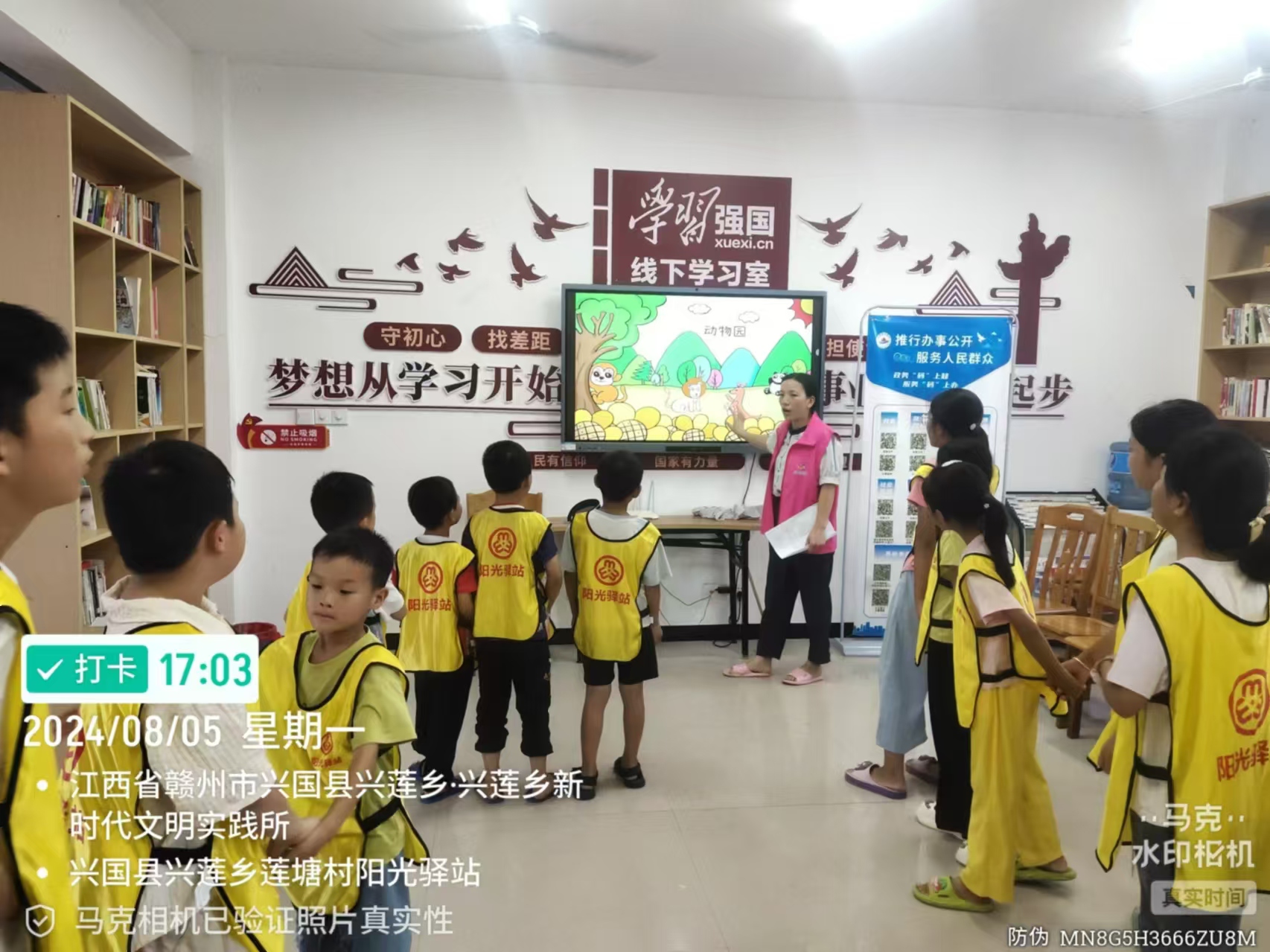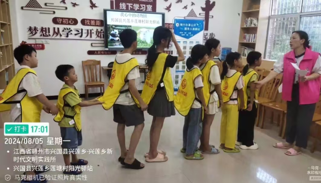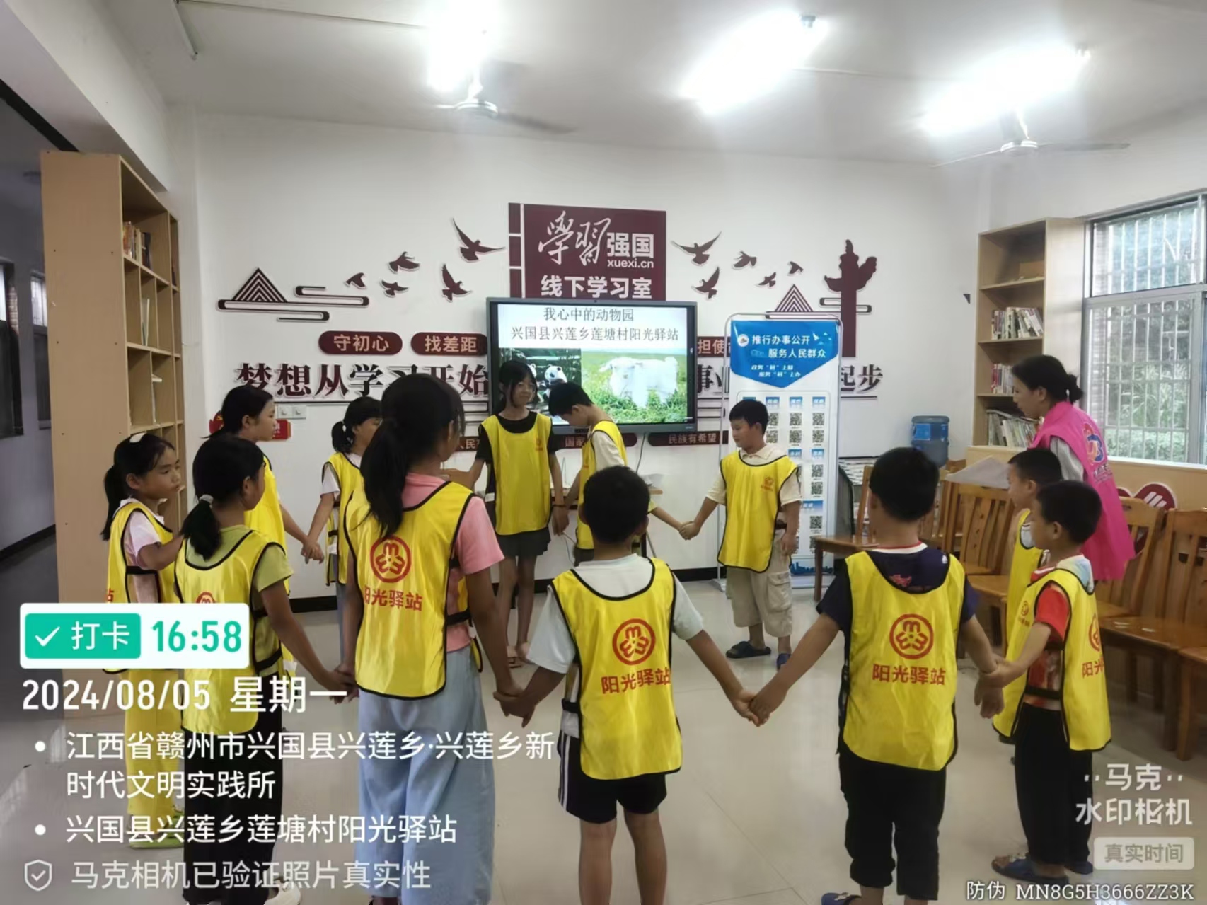 活动伊始,8月5日兴国县兴莲乡莲塘村阳光驿站志愿者组织小朋友们围成一圈,引领者边说我今天我们去了动物园看什么?随机询问一位小朋友回答一种动物后牵着引领者身后的衣服。以此类推至所有人结成一条小火车。