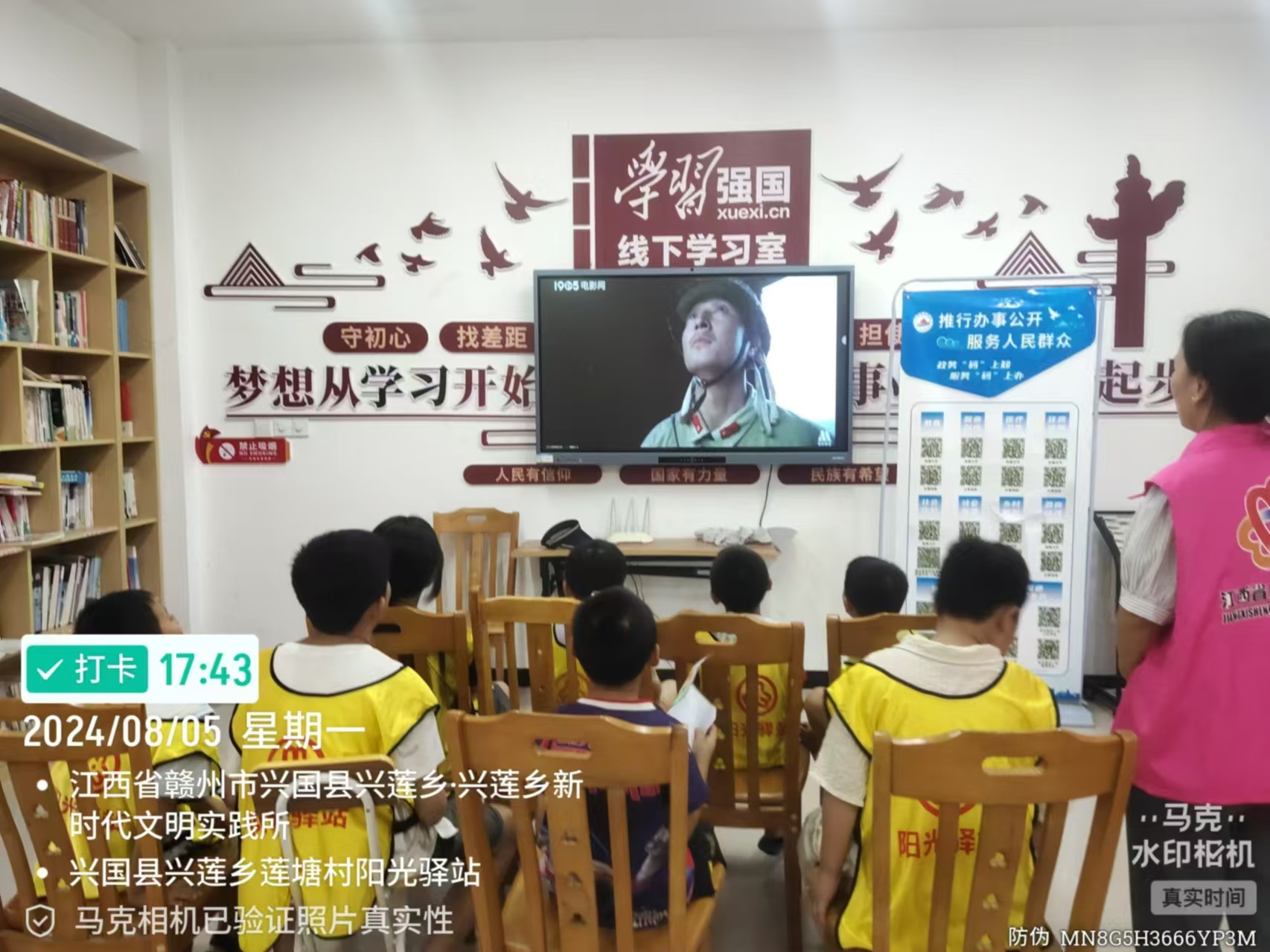 活动最后环节,志愿者组织小朋友观看红色电影《举起手来》。