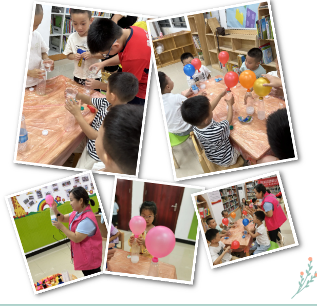 气球不用嘴吹,也能自己鼓起来,你们相信吗?在老师的指导下,孩子们将装有小苏打气球套在底部盛少许白醋的塑料瓶口,再缓慢地将气球立起来,待其中的小苏打被倒入白醋中,小朋友们发现,气球会慢慢地鼓起来,就像被吹气一样。这是因为小苏打和白醋发生反应产生二氧化碳气体,使得气球被吹鼓。