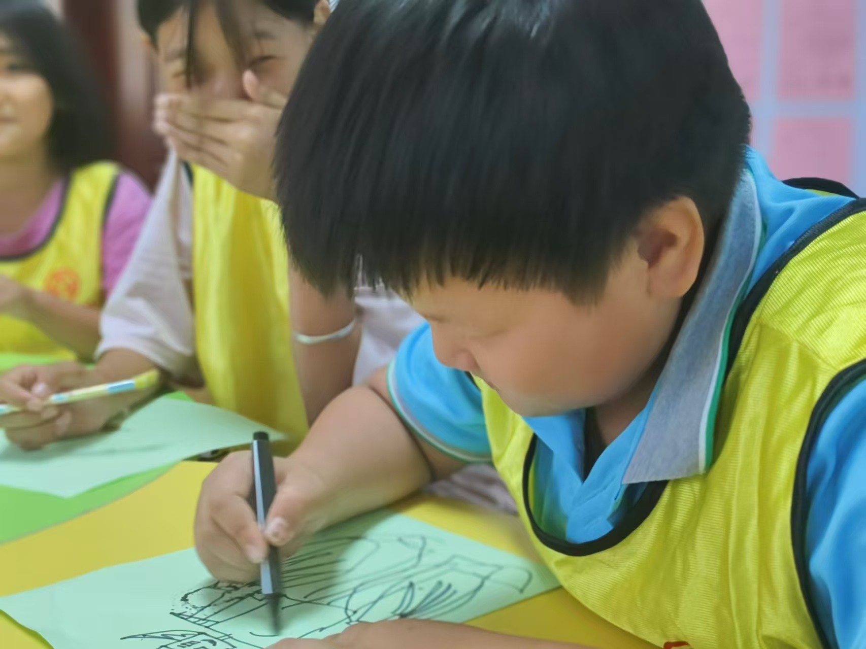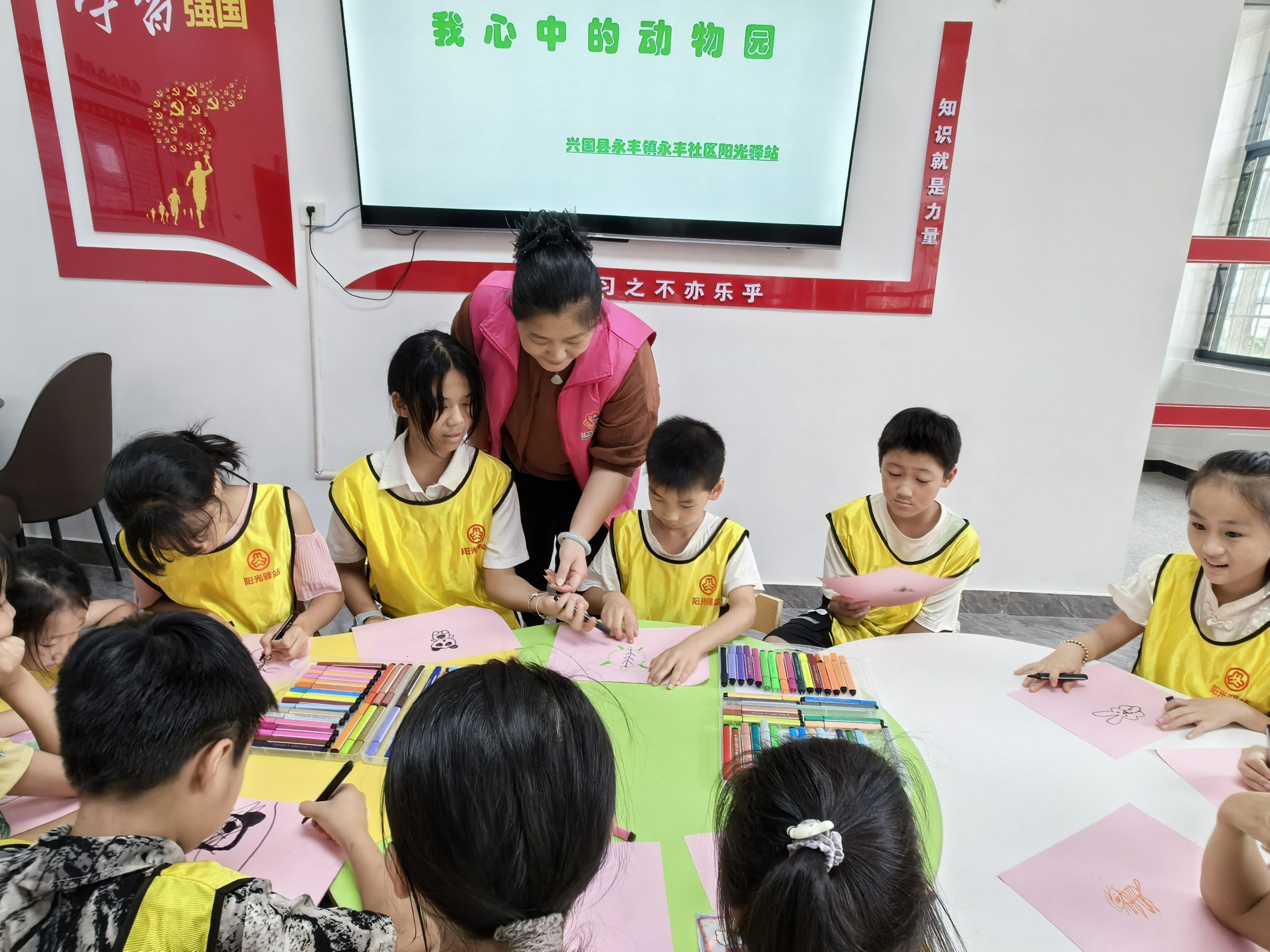 全部儿童人围成一圈,志愿者边说“我们去动物园看什么?”随机询问一位小朋友回答一种动物后,牵着志愿者身后的衣服,以此类推,至所有人结成一条小火车。然后小朋友一起拿起画笔画出喜欢的小动物。接下来组织儿童观看电影《举起手来》。