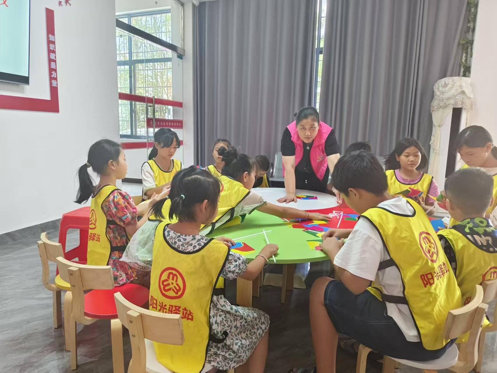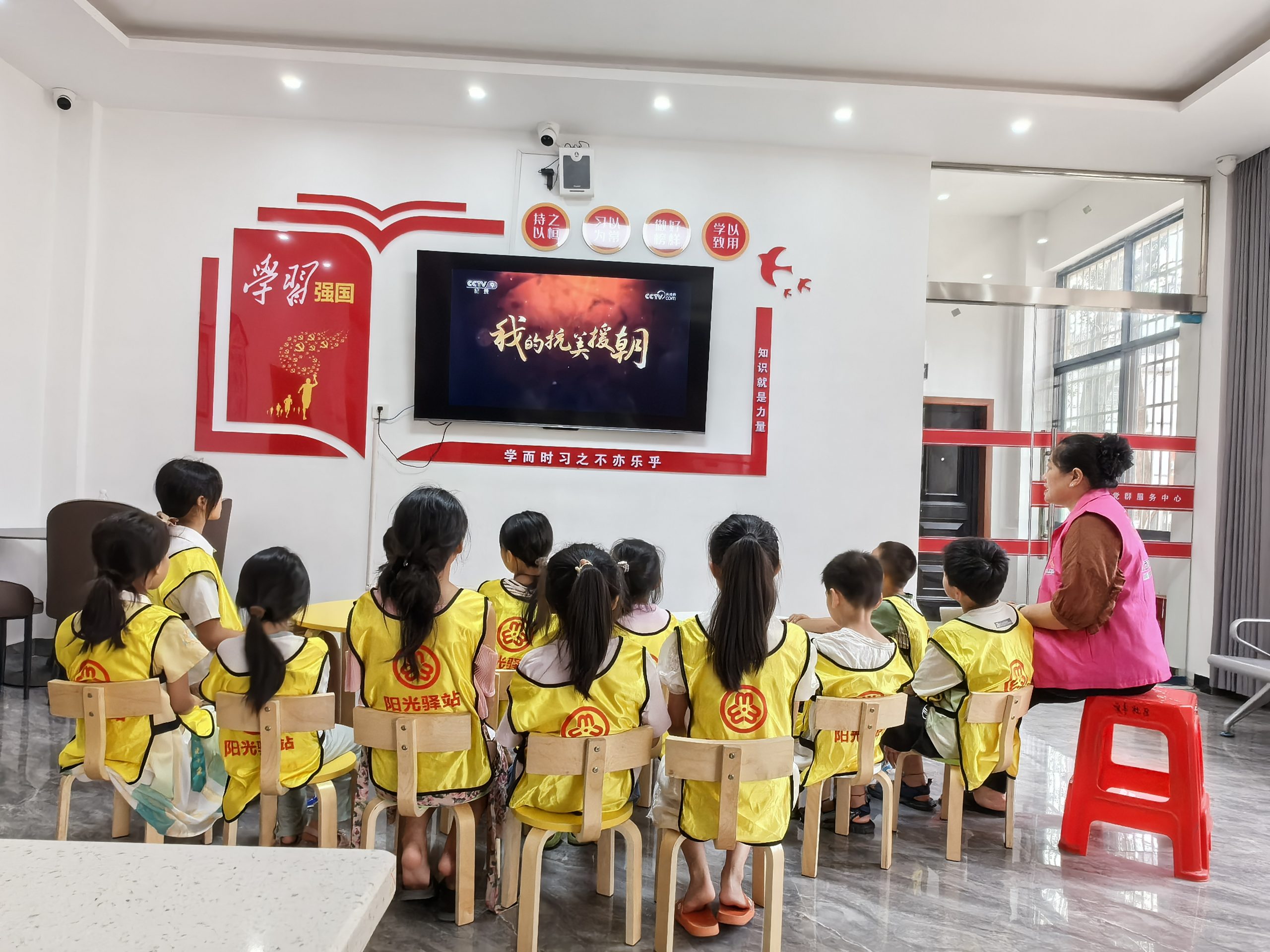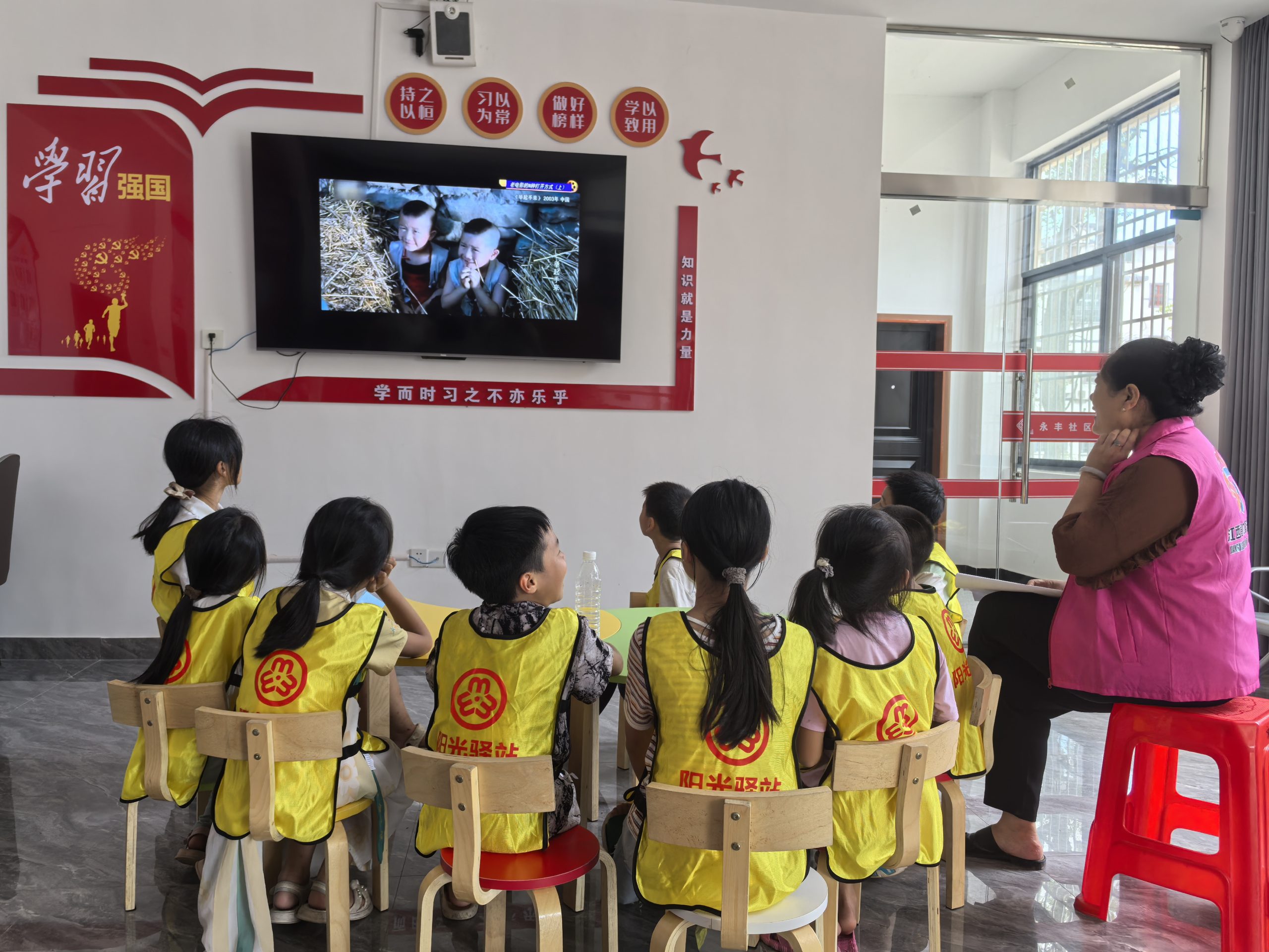 首先志愿者带领孩子们一起做抢凳子游戏,孩子们在音乐中开始围绕圆圈向同一个方向跑步,音乐停,幼儿则开始抢椅子坐,活动培养了儿童的反应能力及游戏规则意识。接下来孩子们动手制作手工小风车,最后播放电影《红领巾》给大家观看。
