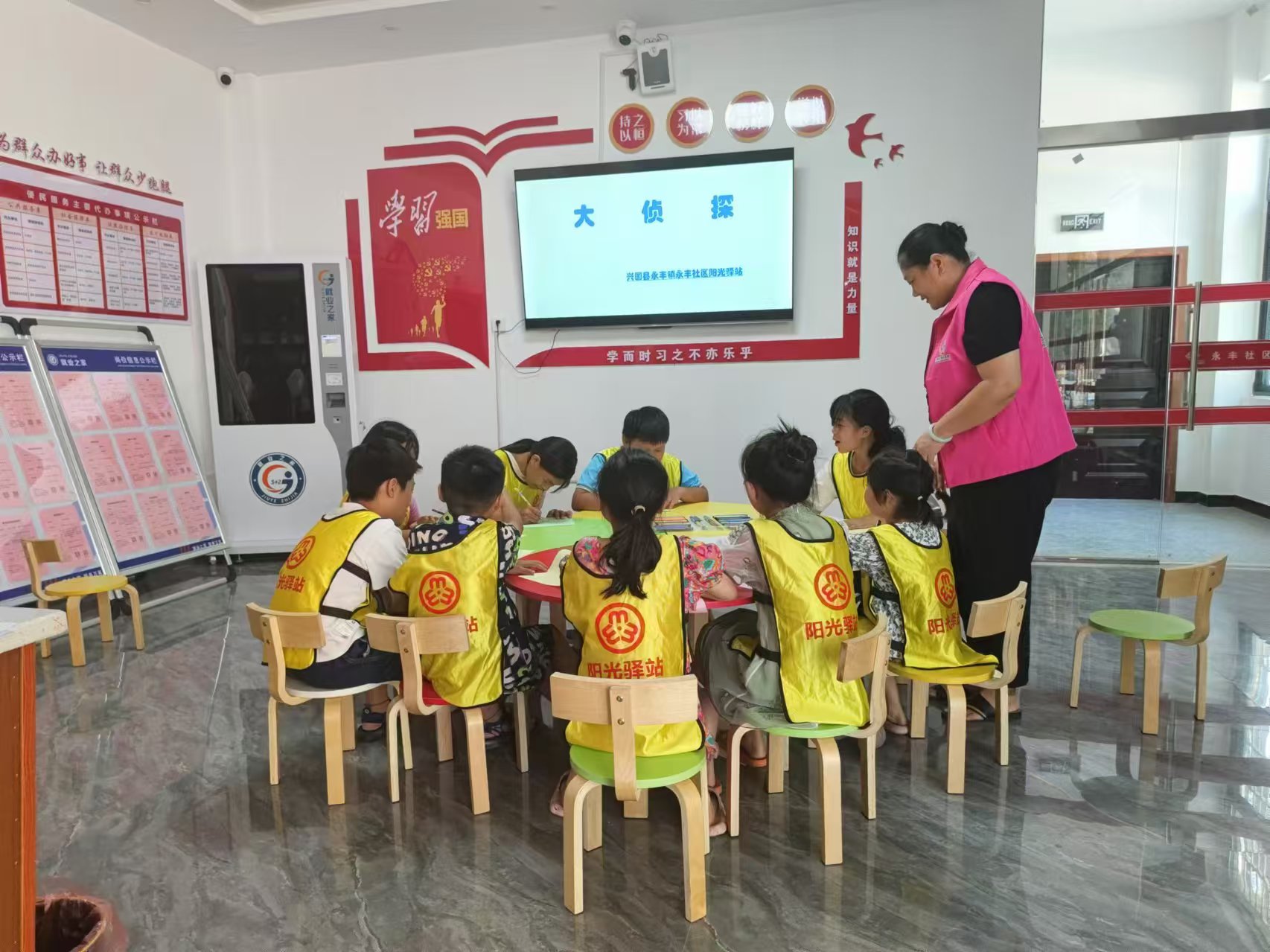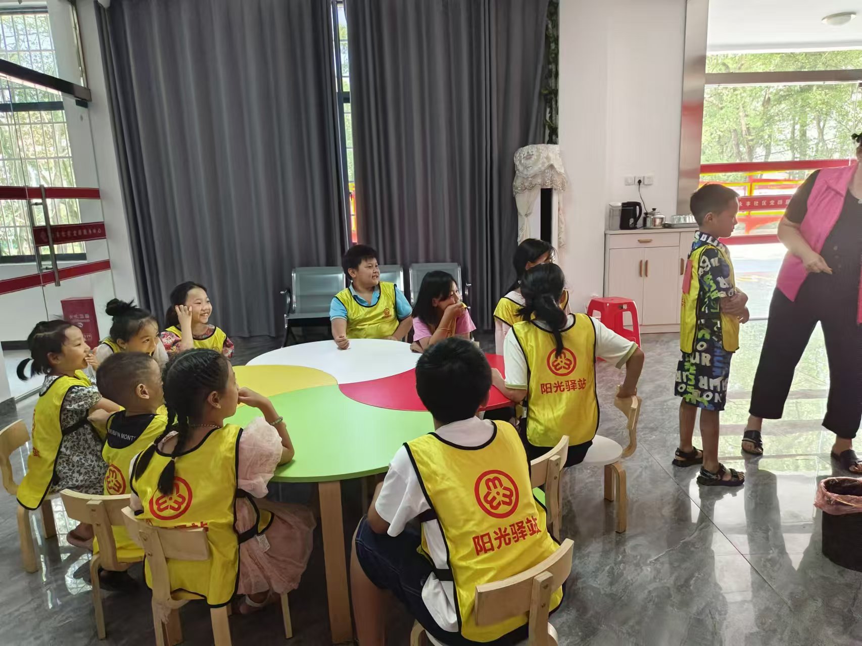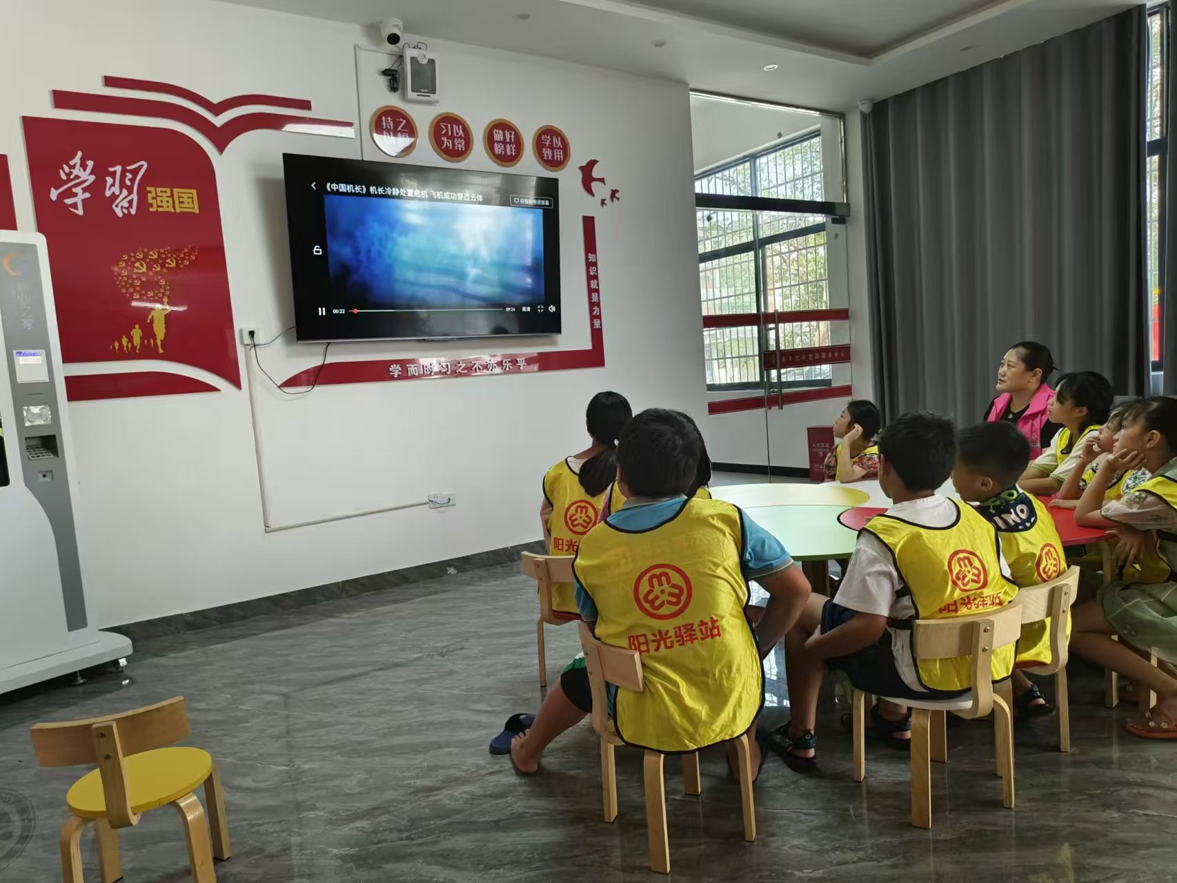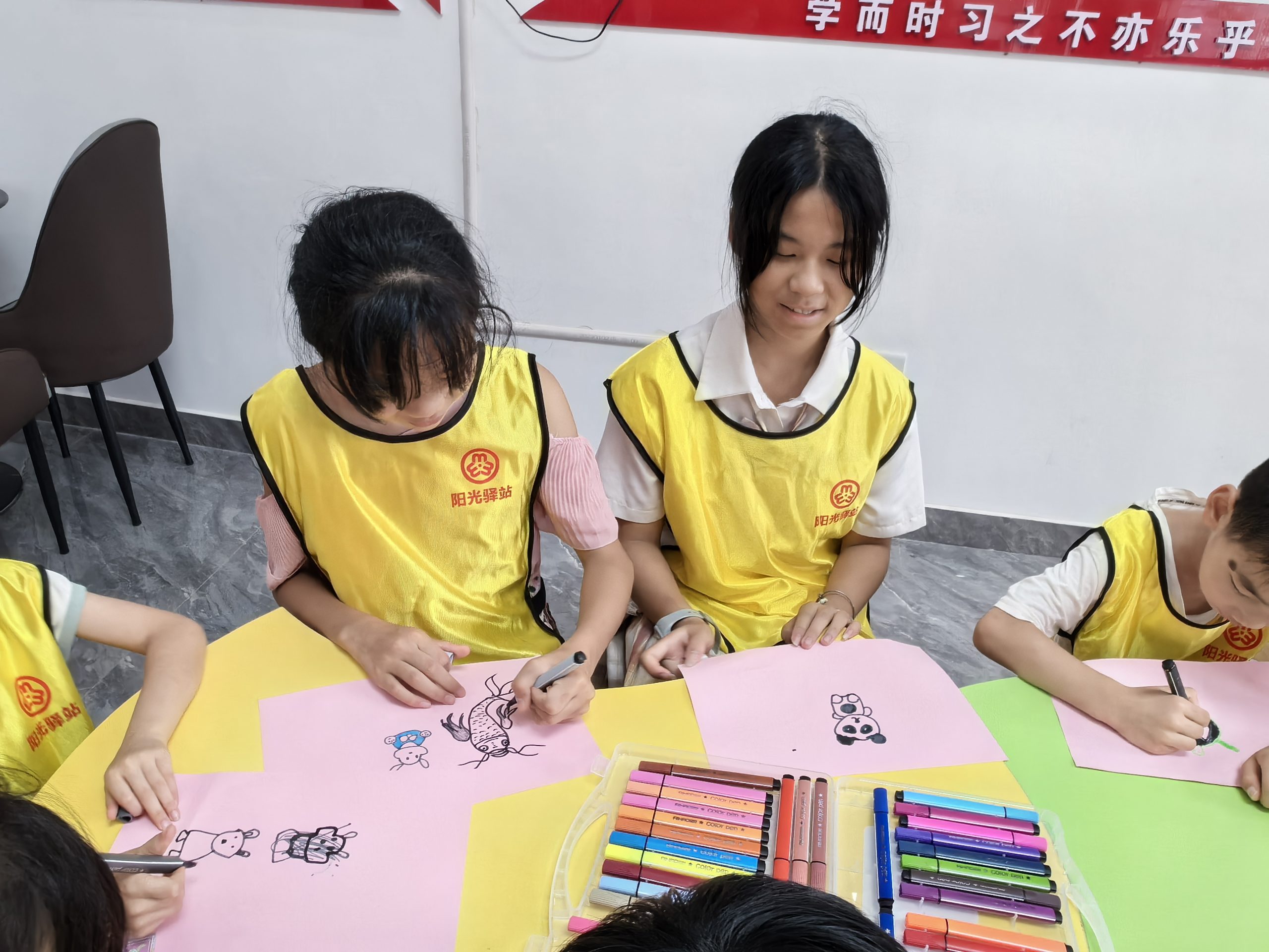 首先志愿者带领孩子们一起做抢凳子游戏,孩子们在音乐中开始围绕圆圈向同一个方向跑步,音乐停,幼儿则开始抢椅子坐,活动培养了儿童的反应能力及游戏规则意识。接下来孩子们动手制作手工小风车,最后播放电影《红领巾》给大家观看。