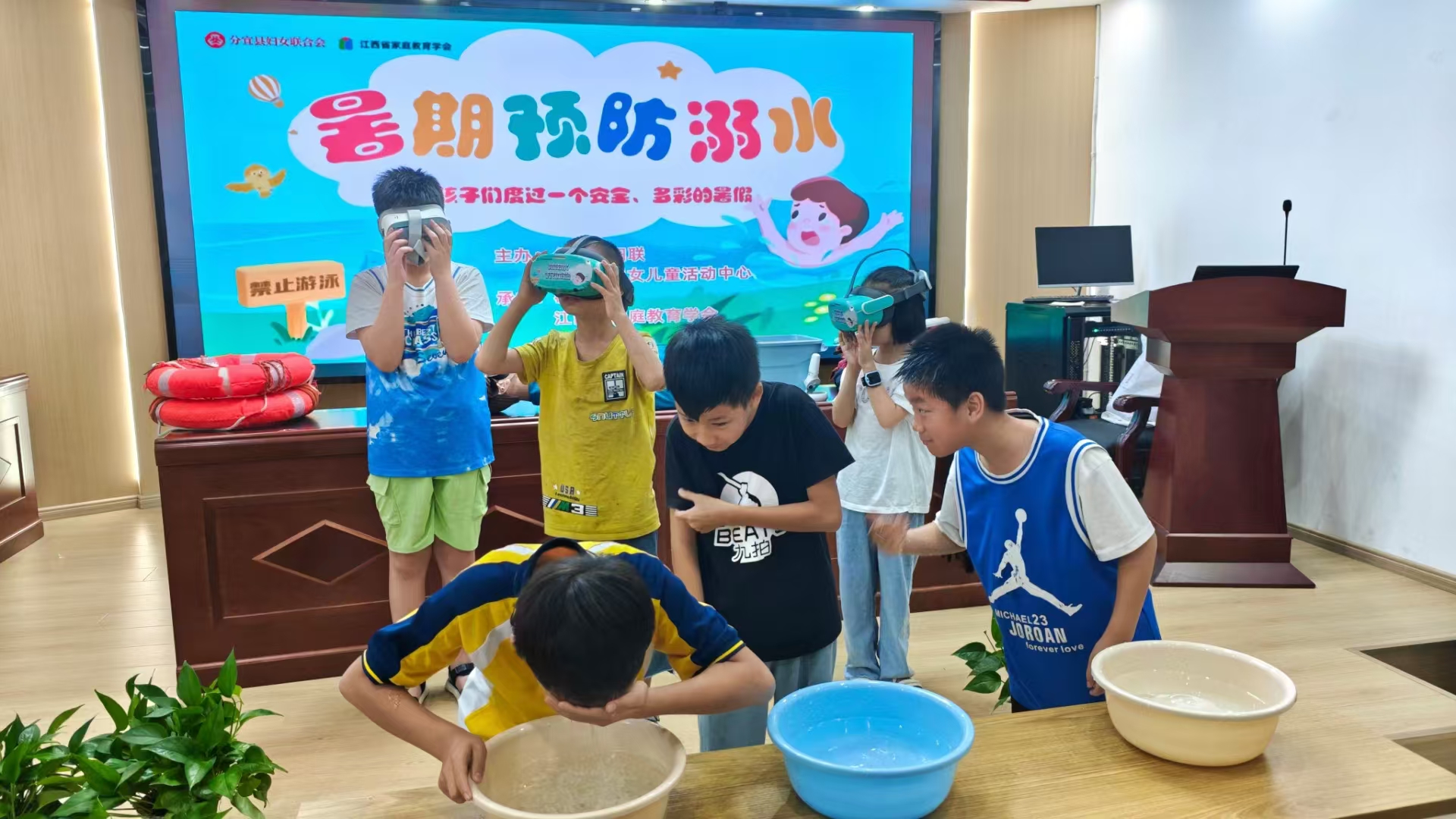 为了让孩子们更好的掌握知识,王老师指导孩子们学习如何使用救生圈、穿戴救生衣,以及对模型进行心肺复苏和人工呼吸,通过VR眼镜沉浸式的体验溺水等实践操作,让他们更加直观地了解了防溺水知识。活动最后,王老师还让学生们进行了一个水下憋气小挑战,让学生们亲身体验窒息的感觉,从而更深刻地理解预防溺水的重要性。