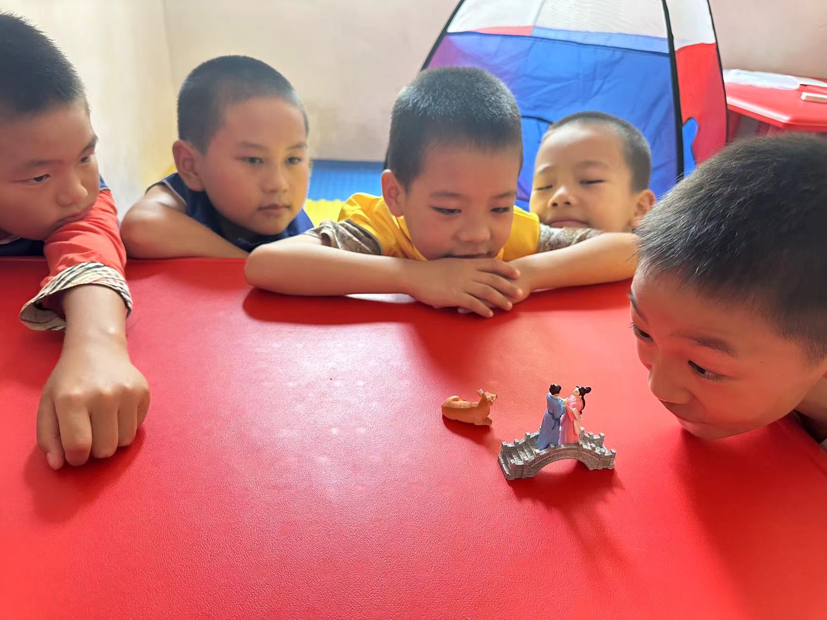 阳光驿站志愿者将牛郎织女鹊桥相会的实景摆在桌上,让孩子们近距离观察,并绘声绘色的描述七夕节的意义。