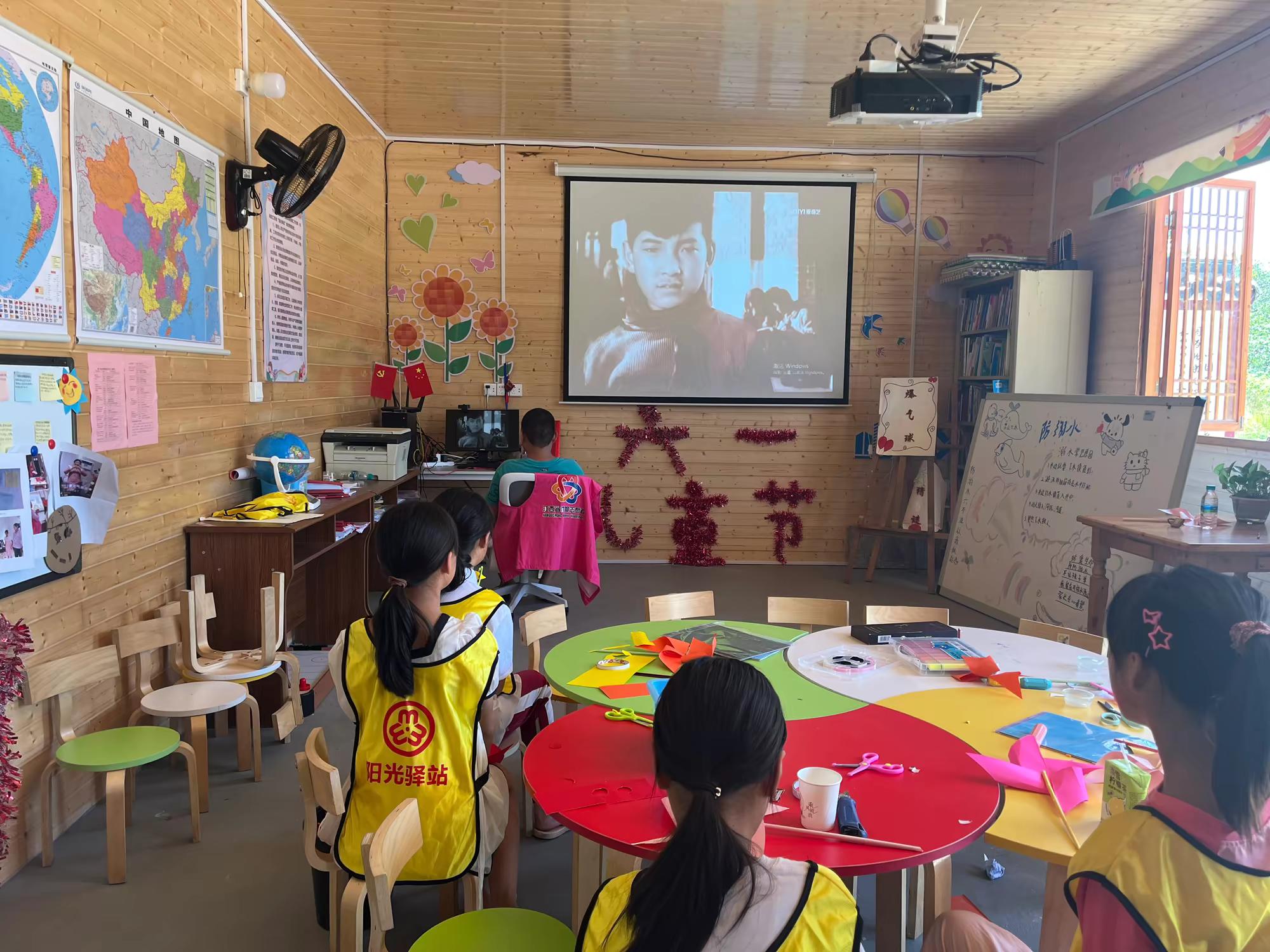 孩子们利用黏土、树枝等东西做了一些特别可爱的装饰品,放在驿站的各个角落这样显得驿站更温馨了。紧接着孩子们进行看电影《红领巾》。