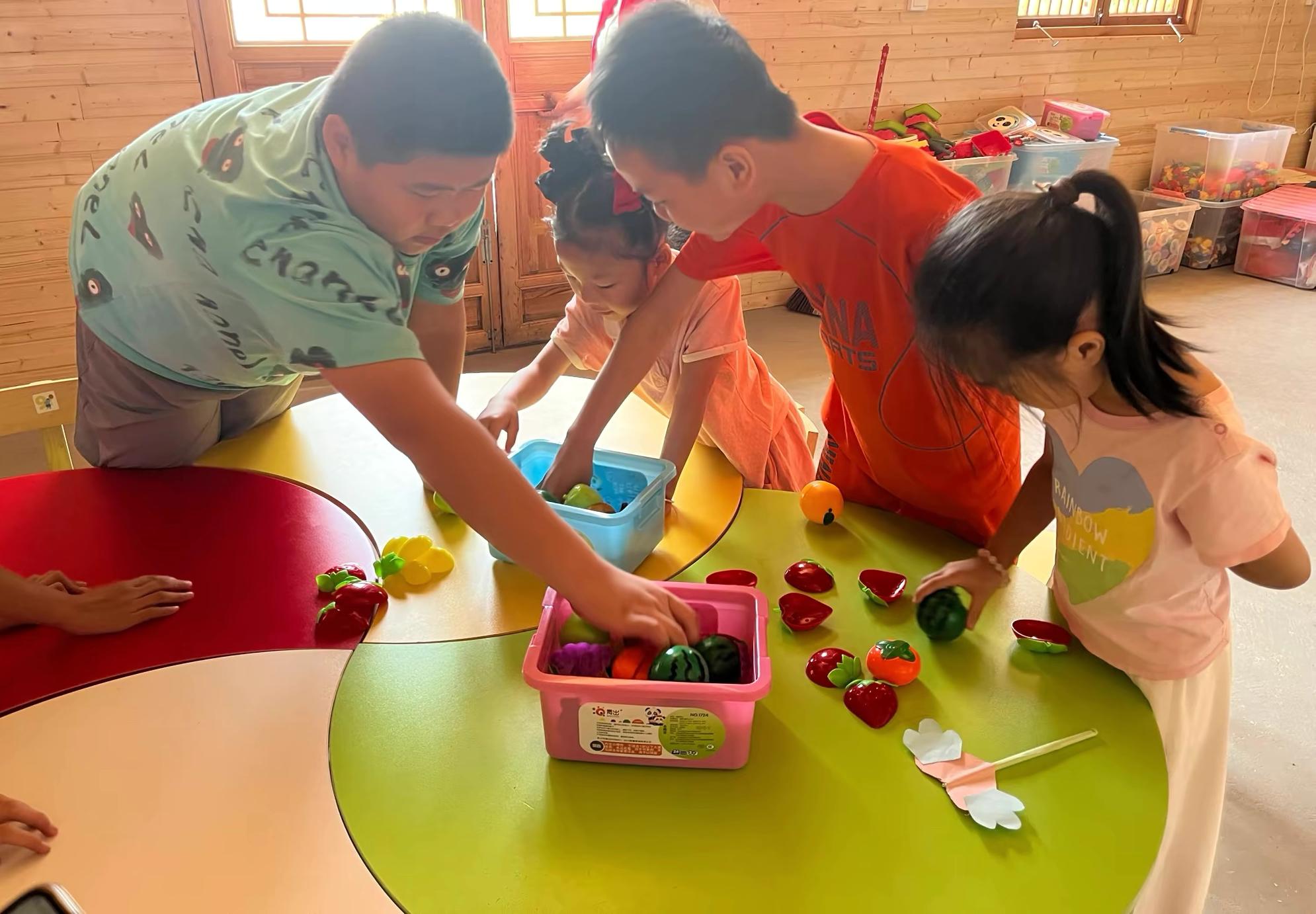 活动二:水果拼拼乐;孩子们利用驿站里的水果玩具进行一个小游戏,孩子们玩得不亦乐乎 一个小游戏体现了孩子们之间默契手速。