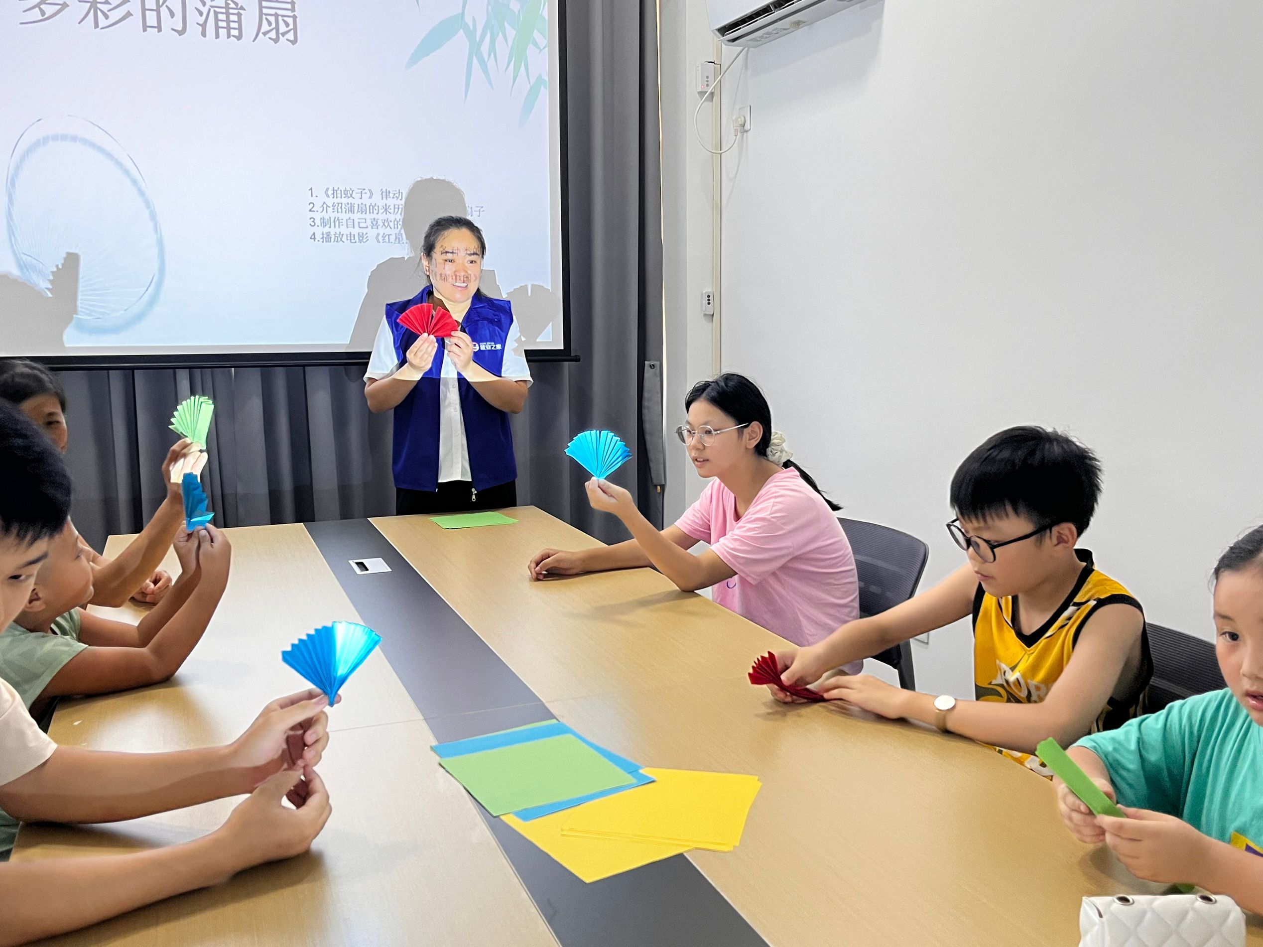 工作人员首先向孩子们介绍了蒲扇的由来,随后在工作人员的指导下,大家拿起工具,充满了创作热情。不一会,一把把五彩缤纷、充满童趣的作品展现在大家眼前,让辖区儿童体验了蒲扇的文化艺术魅力,给炎热的夏天带来丝丝清凉。