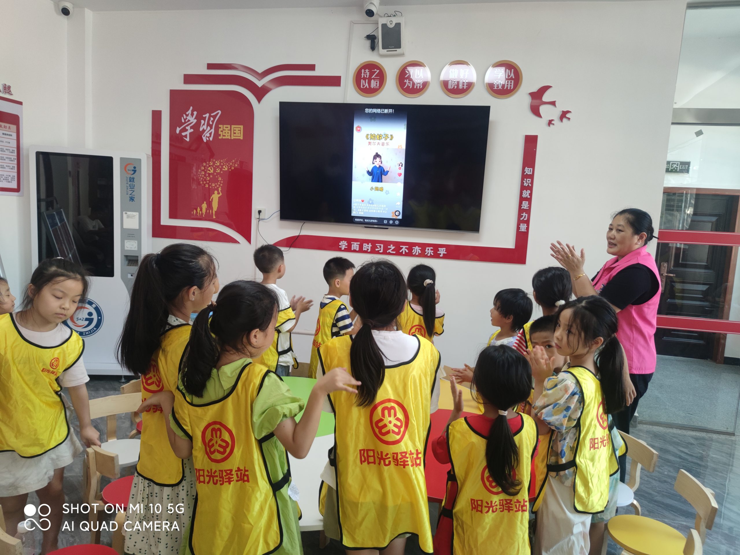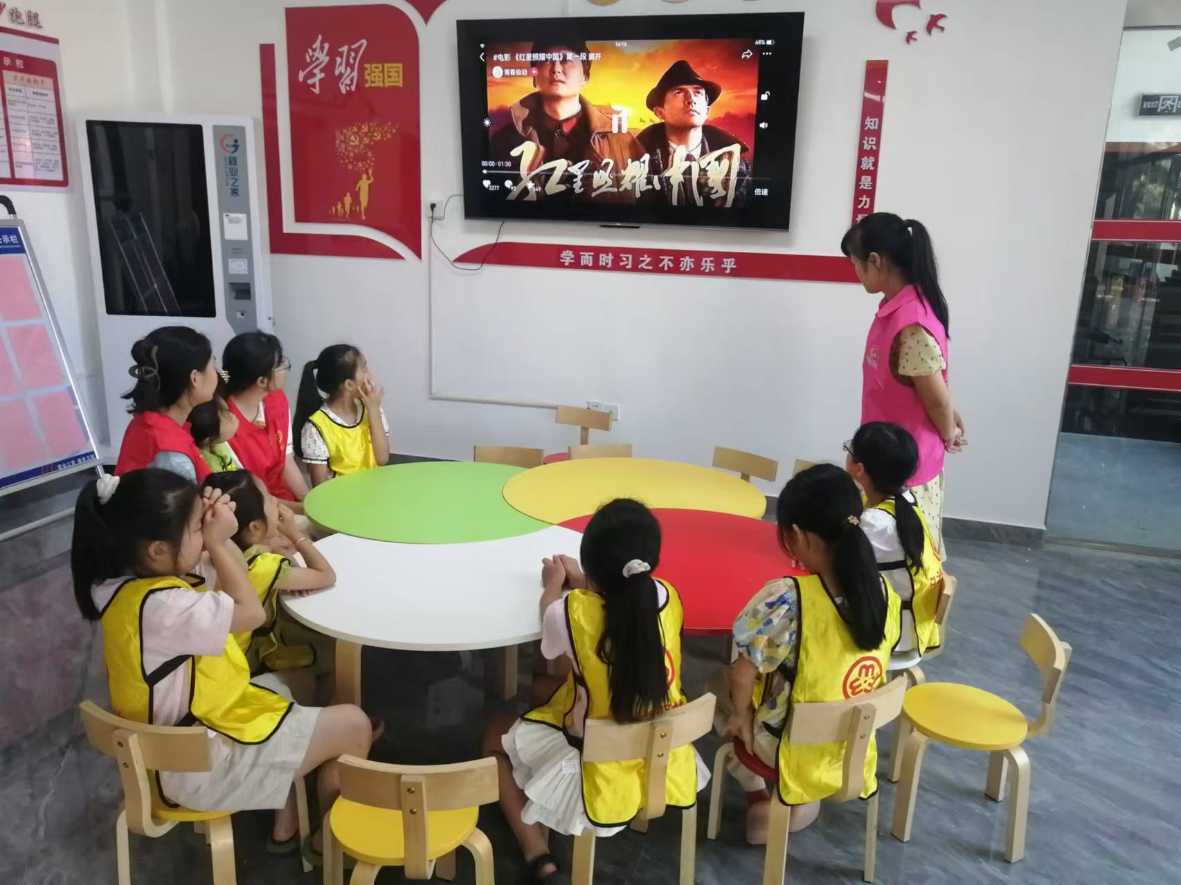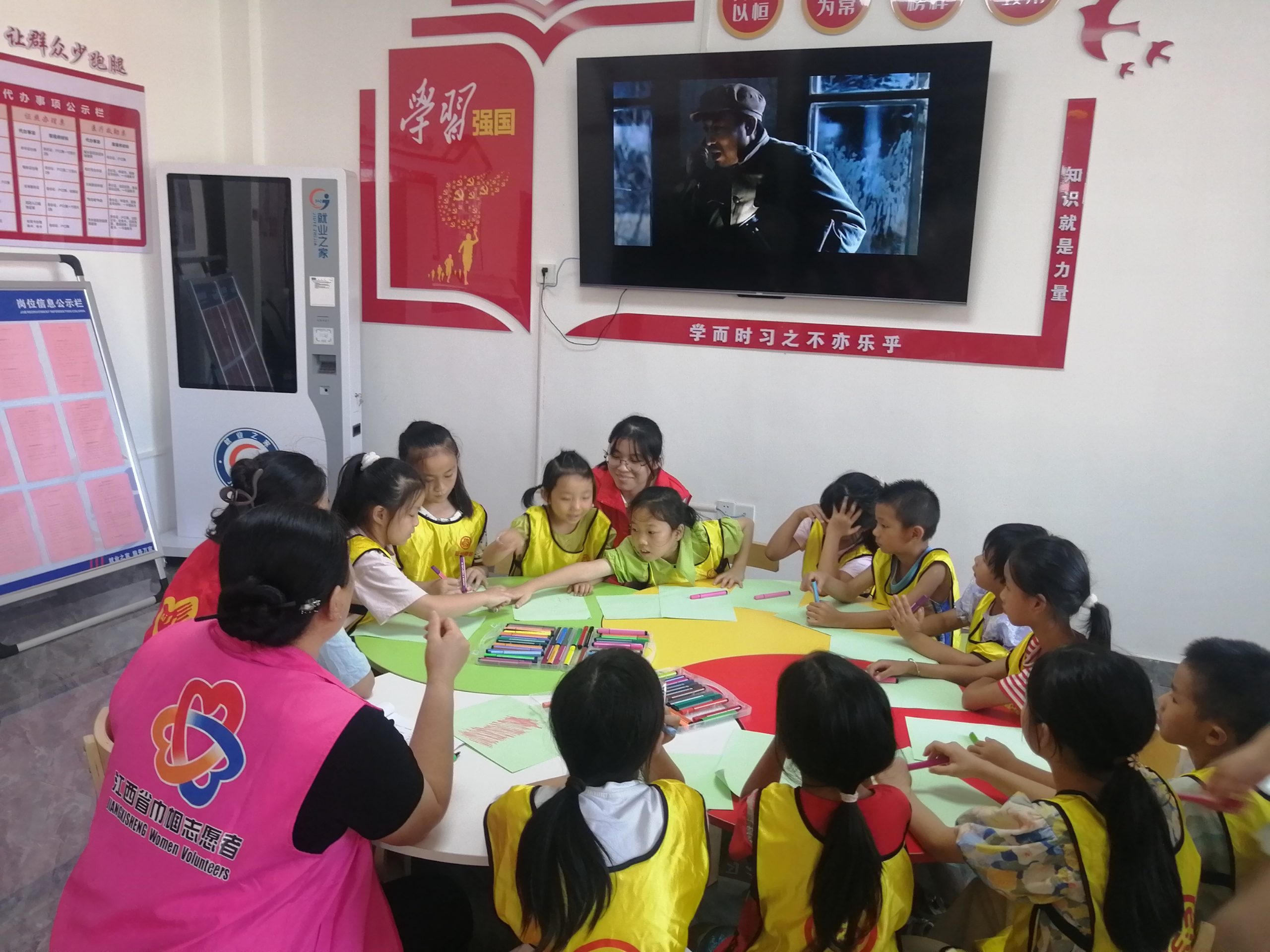 志愿者引导小朋友一起学习《拍蚊子》律动操,然后介绍蒲扇的来历及各种类的扇子,带着孩子们一起制作自己喜欢的扇子。绘制过程中,大家欢声笑语不断,小朋友们融合自己的创意、发挥想象力,在素白的扇面上,经过构图、着色后,原本平淡无奇的扇面开始变得缤纷多彩,每一个团扇上都染上了属于孩子们独有的个性色彩。最后播放电影《红星照耀中国》和孩子们一起观看。