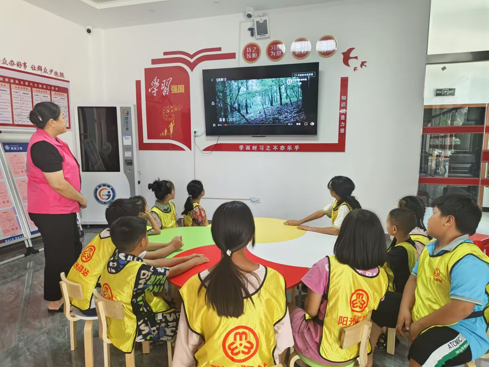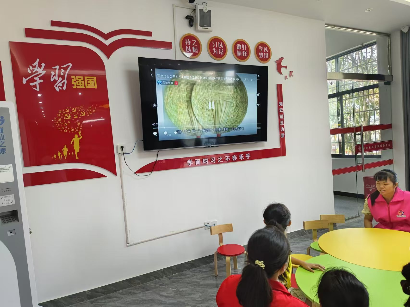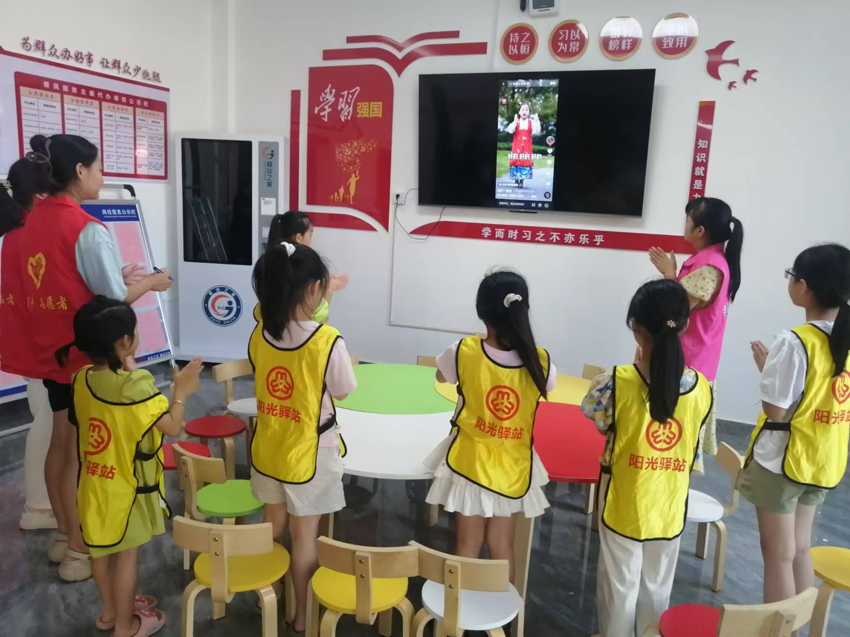 志愿者引导小朋友一起学习《拍蚊子》律动操,然后介绍蒲扇的来历及各种类的扇子,带着孩子们一起制作自己喜欢的扇子。绘制过程中,大家欢声笑语不断,小朋友们融合自己的创意、发挥想象力,在素白的扇面上,经过构图、着色后,原本平淡无奇的扇面开始变得缤纷多彩,每一个团扇上都染上了属于孩子们独有的个性色彩。最后播放电影《红星照耀中国》和孩子们一起观看。