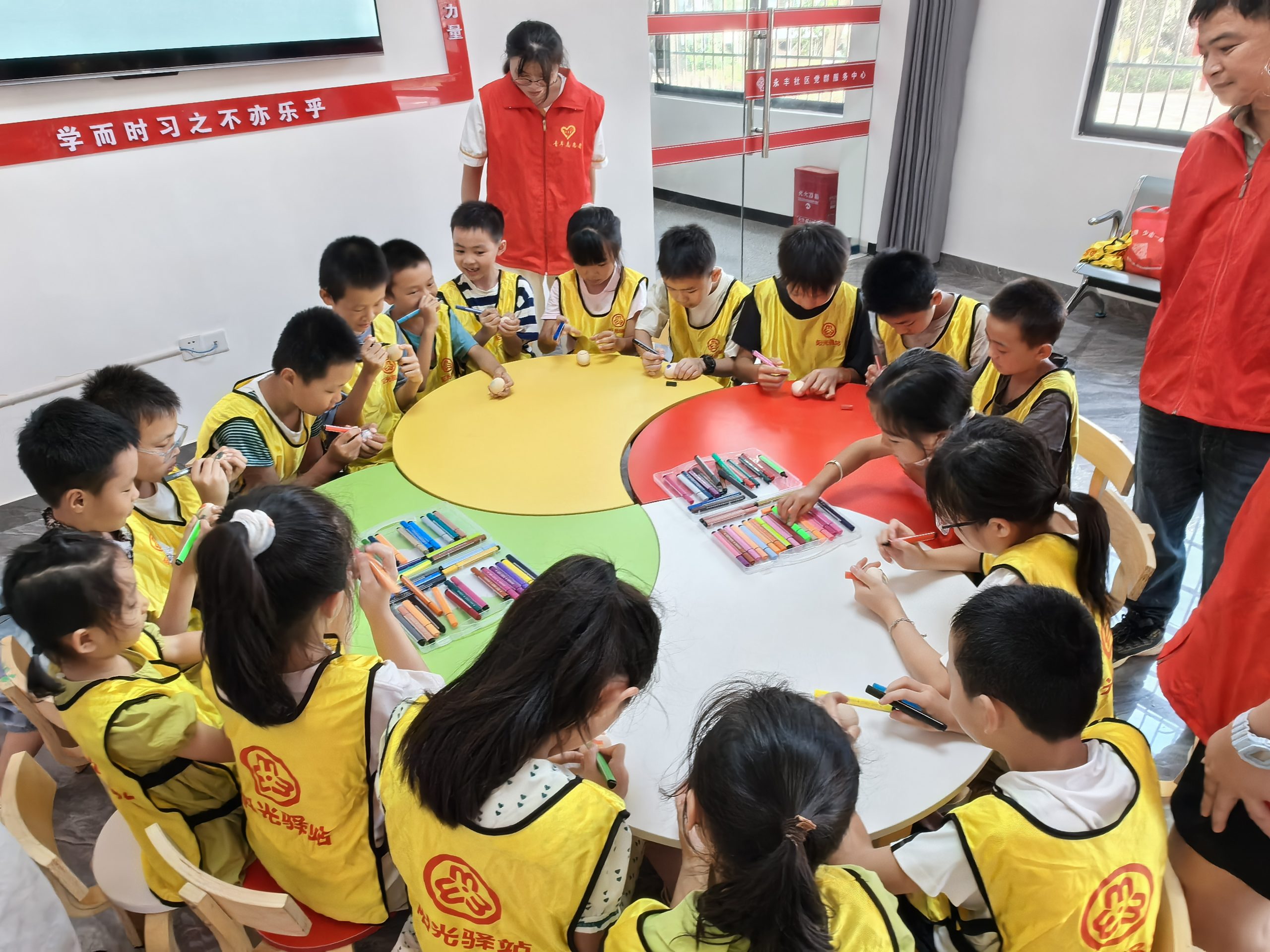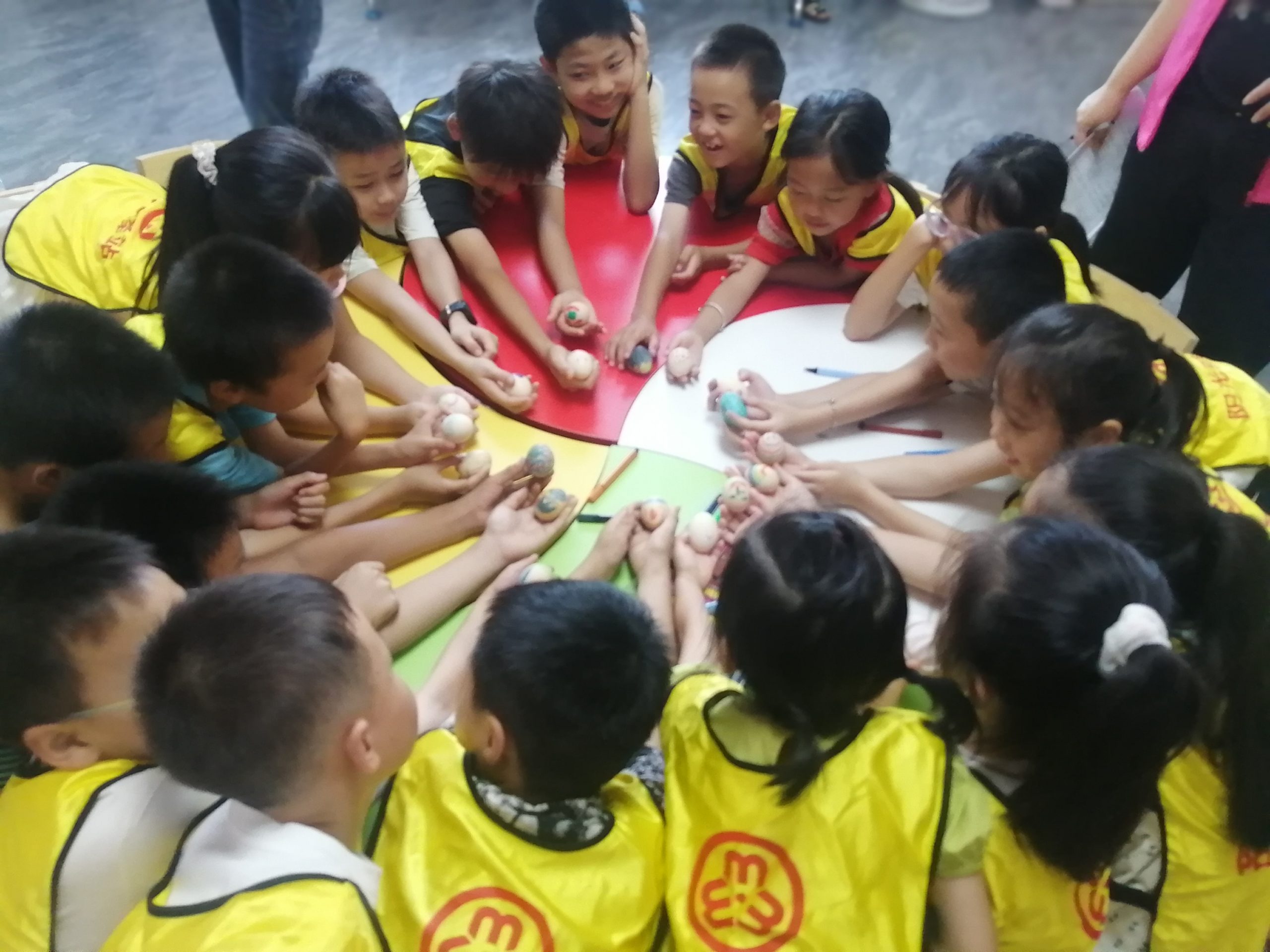 志愿者带领小朋友一起做《丢手绢》热身活动,然后每人准备好一个熟鸡蛋,在蛋壳上画上夏季的主题图案,孩子们用各种颜色的线条把圆滚滚的鸡蛋装饰的有模有样,可爱的,夸张的,搞怪的……还有独特的五彩鸡蛋!最后播放电影《永不消失的电波》。