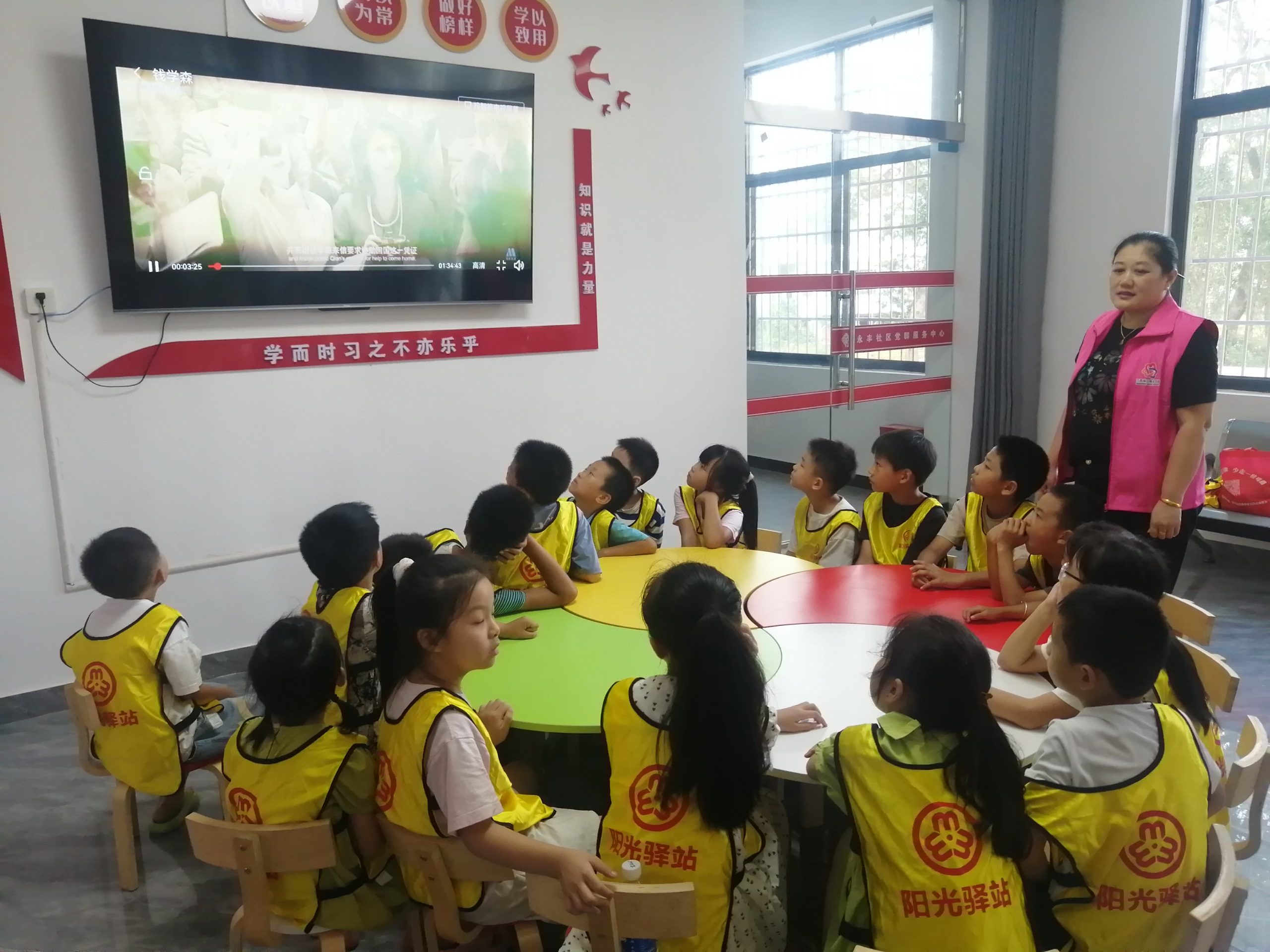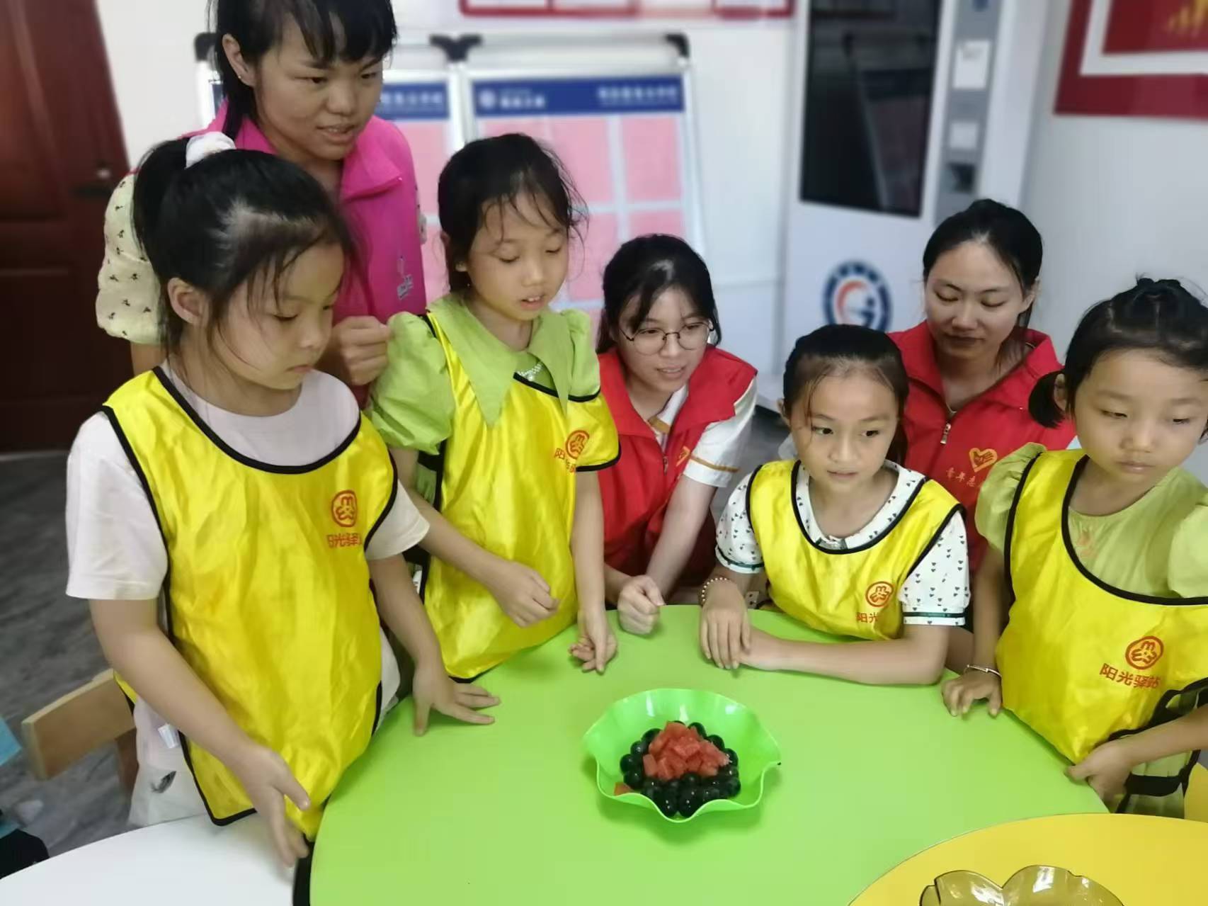首先,孩子们一起学习做《我是指挥家》律动操,接着组织儿童3人一组合作水果大拼盘,然后为小朋友播放电影《钱学森》。