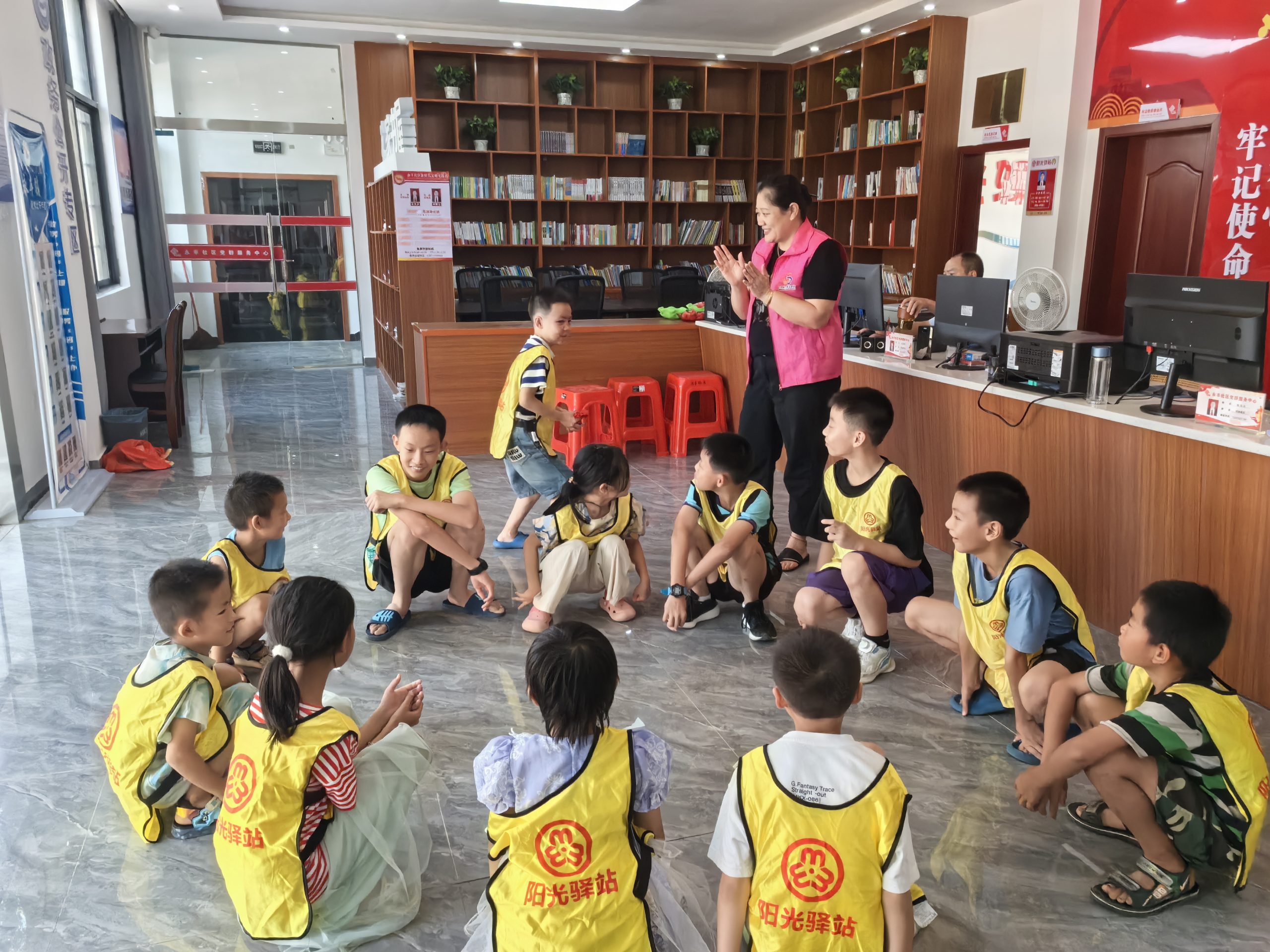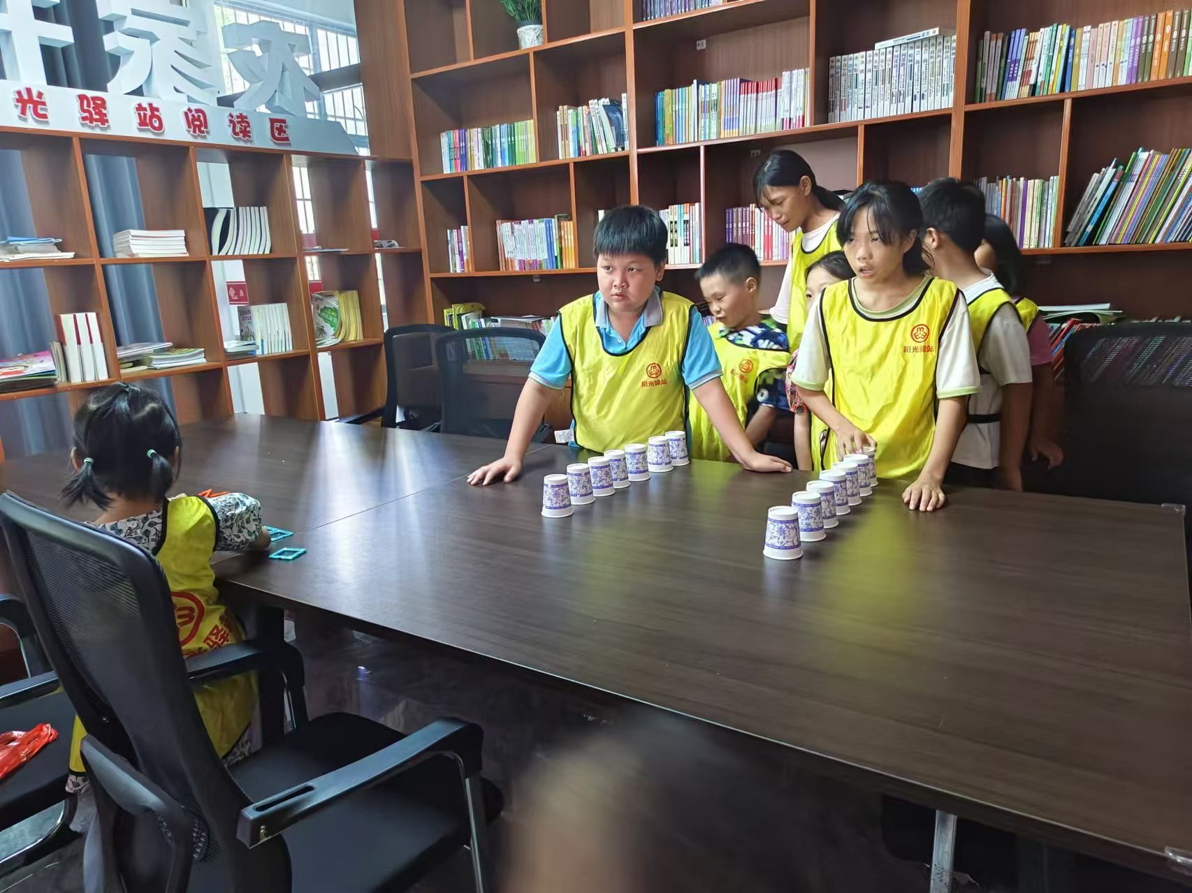 桌上倒扣两排纸杯,一排7-8个。两位儿童比赛把所有纸杯叠在一起,以最先完成的为胜。然后准备文字卡片,让儿童进行成语接龙游戏,接下来组织儿童观看电影《战狼》。