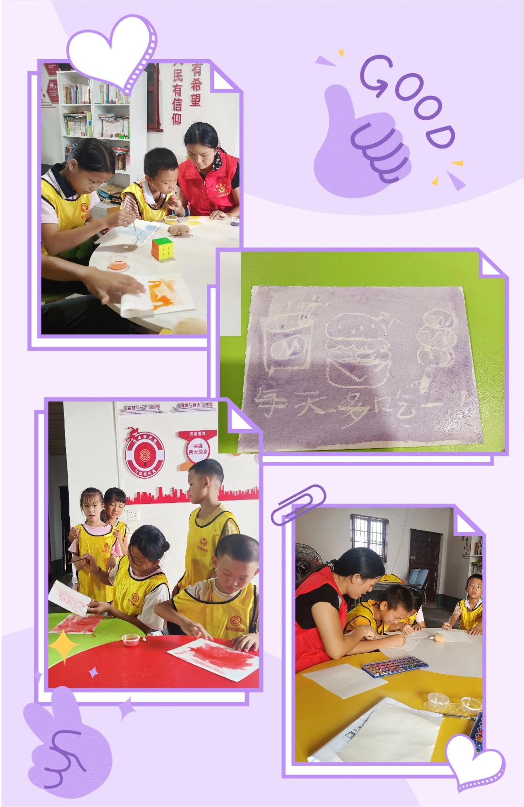 最令人期待的莫过于“无字天书科学”环节了。志愿者们准备了蜡烛和颜料、白纸,用蜡烛或白蜡笔在白纸上画图案,并不能看出来,再用颜料刷在白纸上,图案就显现出来了。
