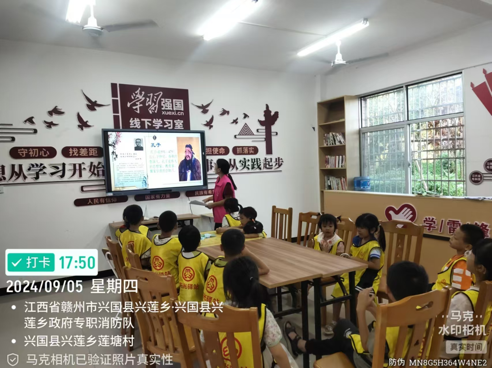 第二环节志愿者工作人员向儿童介绍我国著名的教育家孔子、陶行知讲述他们的教育故事。