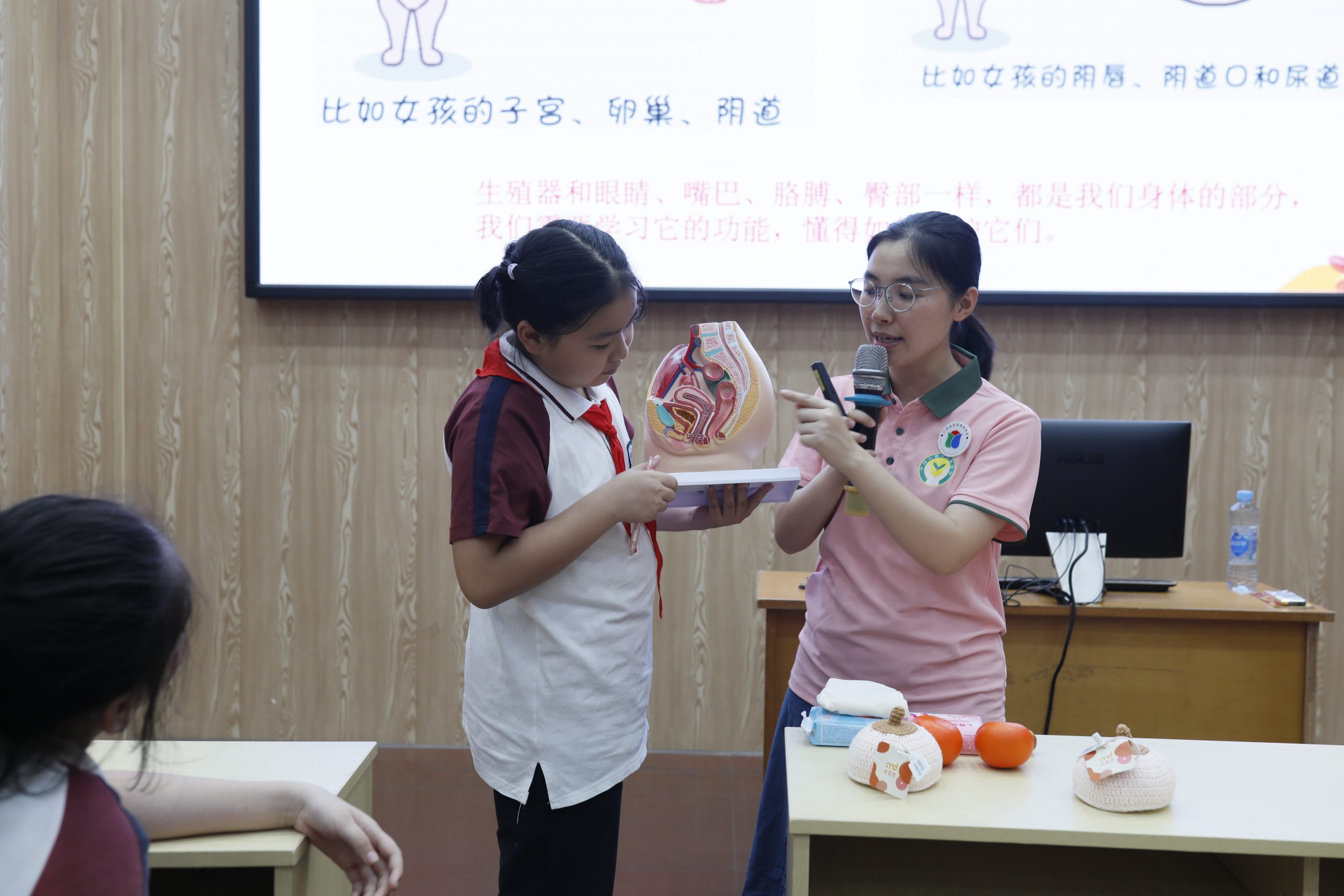 在南昌外国语高新学校,首先王老师跟在场的女童们玩了一个”大风吹“的小游戏,询问在场女童们身体是否开始发育,从而引出今天要讲的内容。接着王老师通过生动的图片和有关的道具,向在场的女童们详细地讲解了青春期身体的变化过程,包括乳房发育、月经初潮、体毛生长等生理现象,帮助她们正确认识自己的身体变化,减少青春期带来的担心和忧虑。