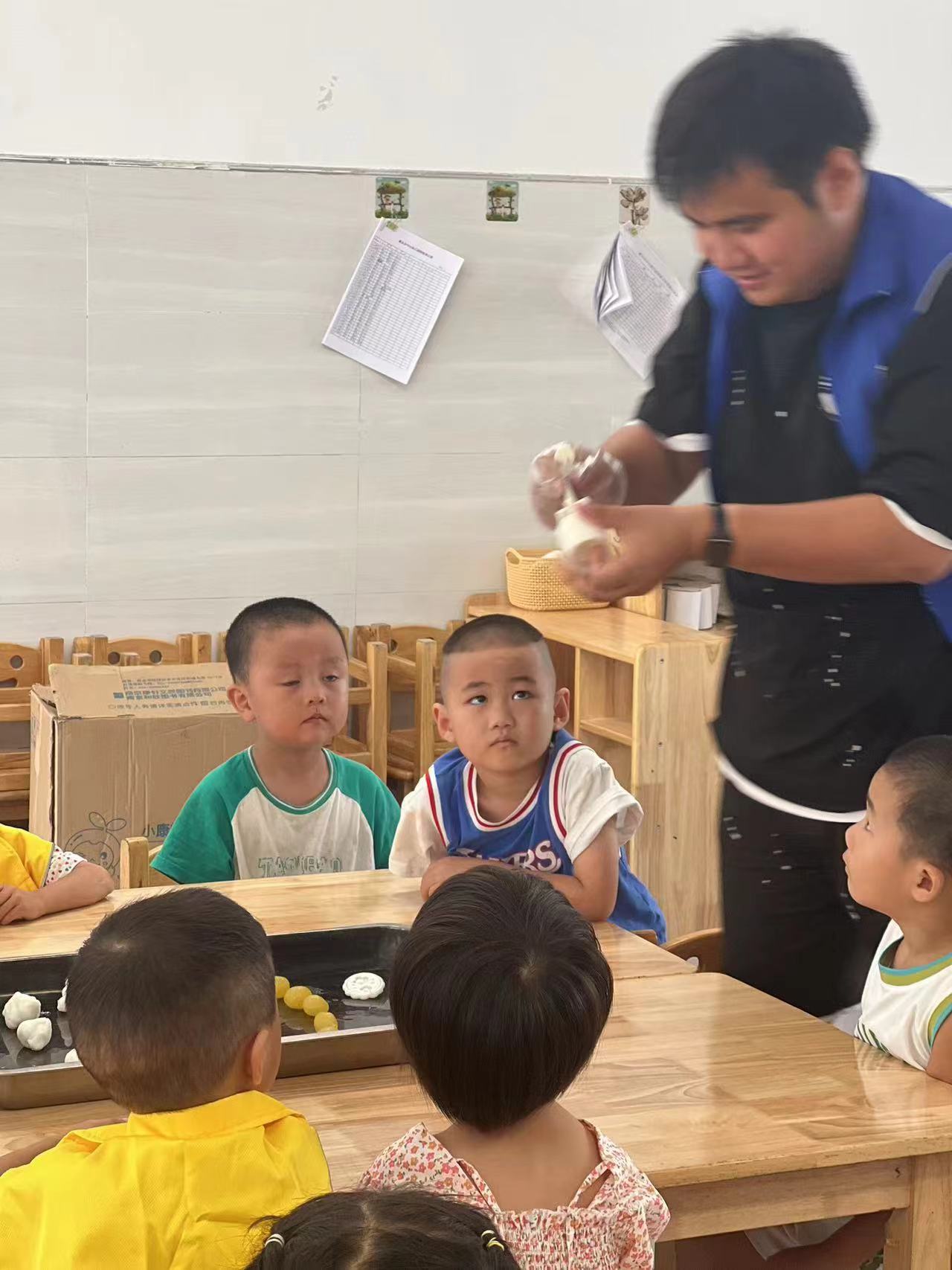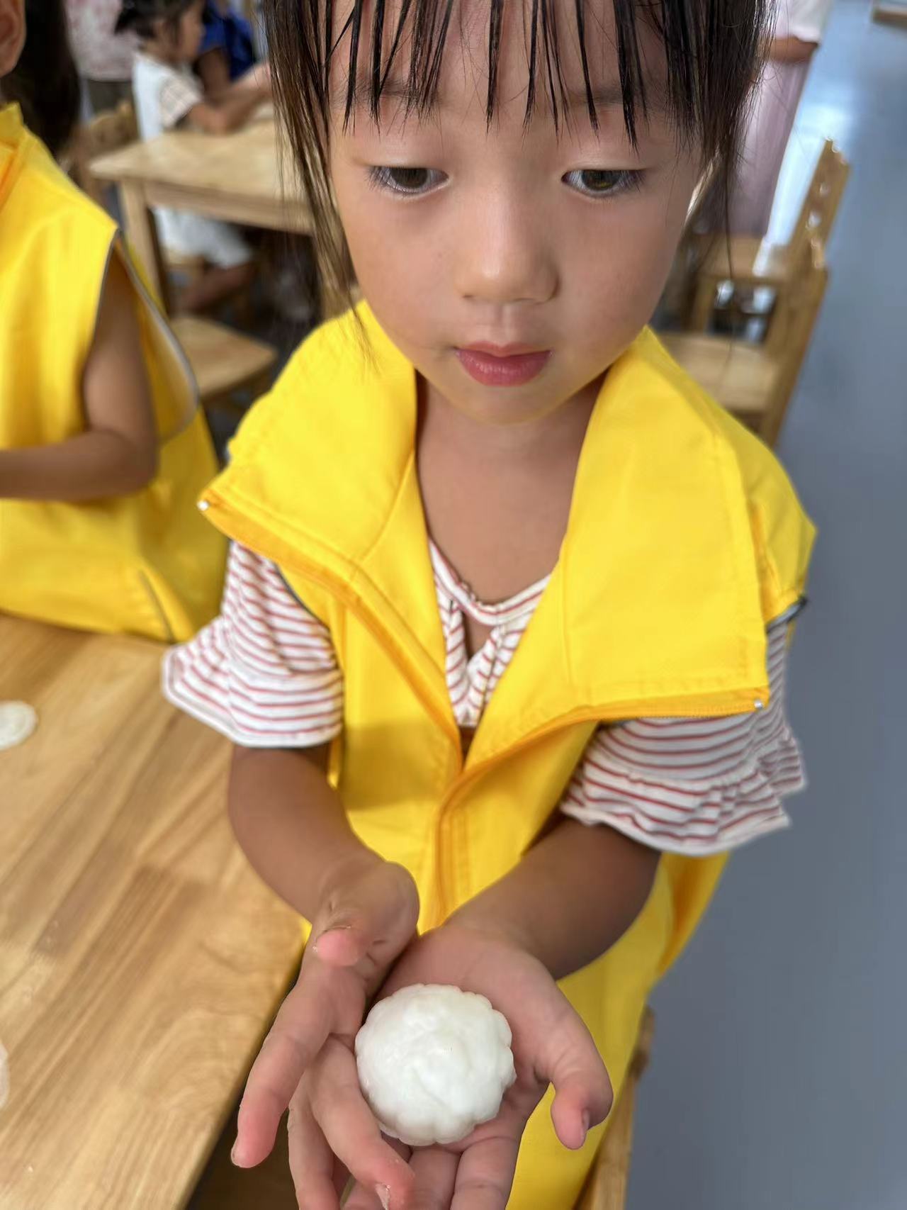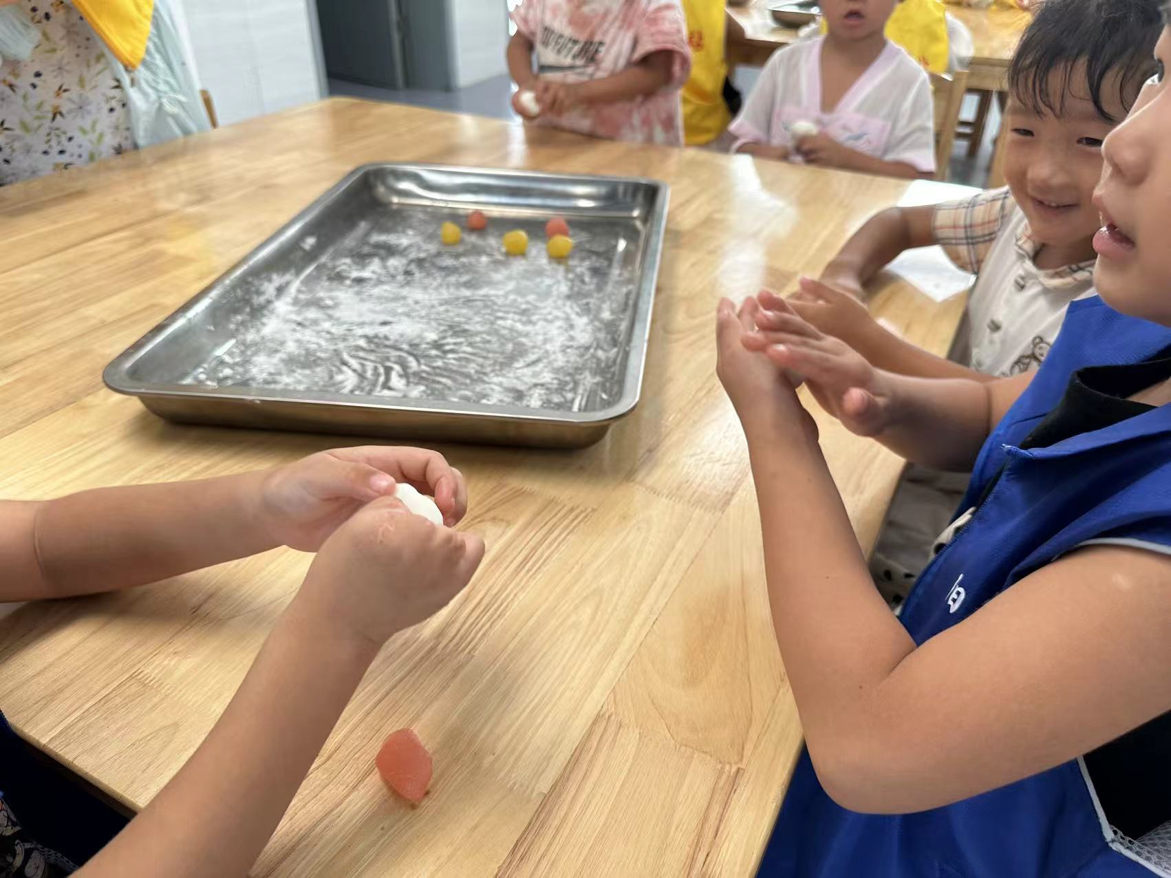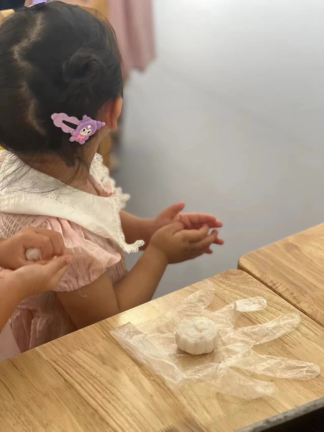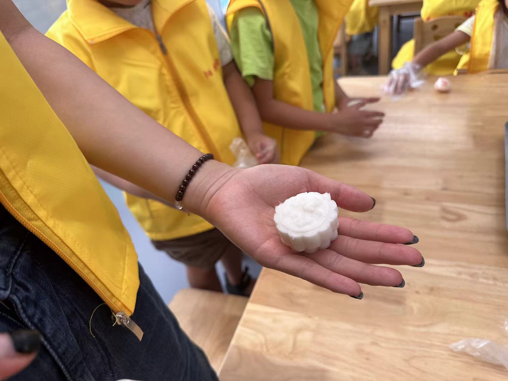 在月上明珠的热身的小游戏过后,工作人员组织孩子们进行制作冰皮月饼的活动: