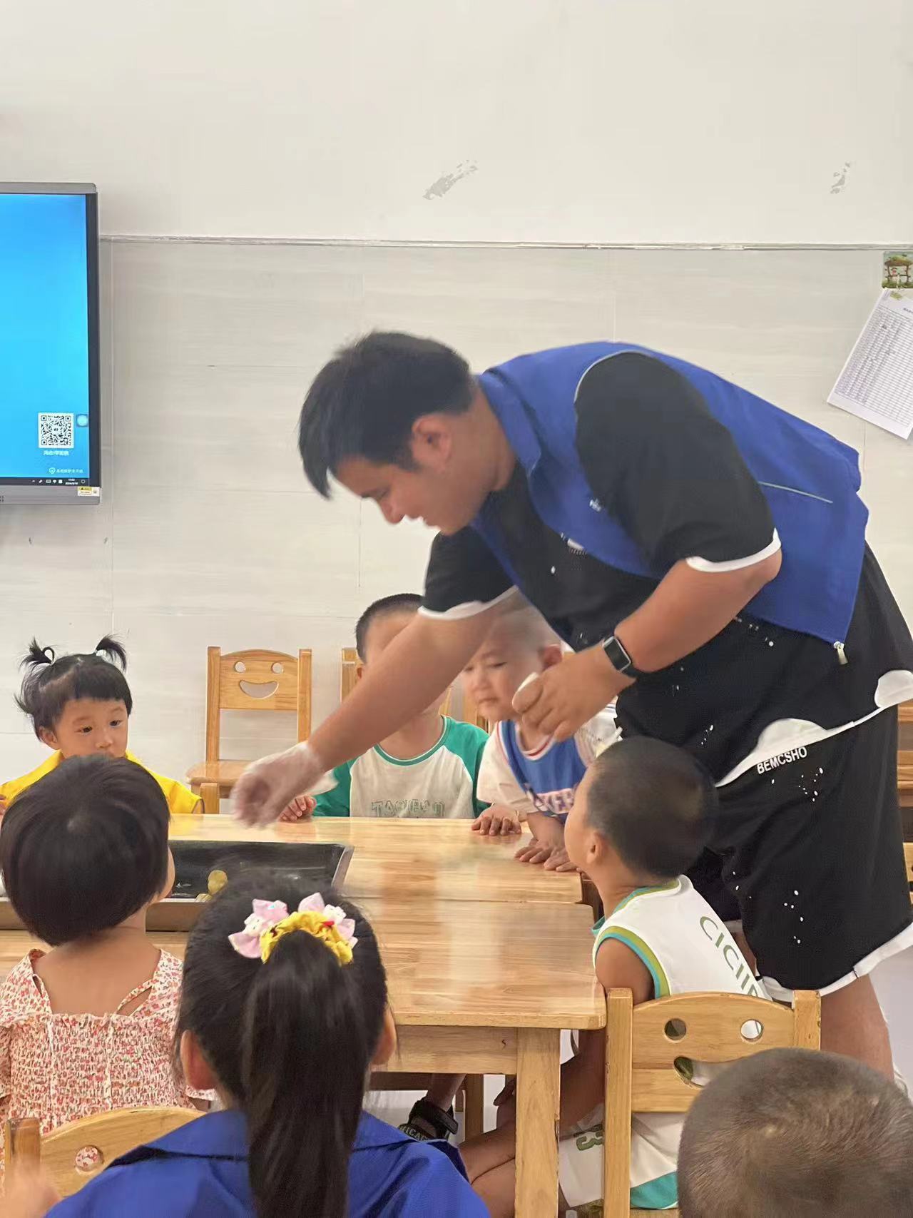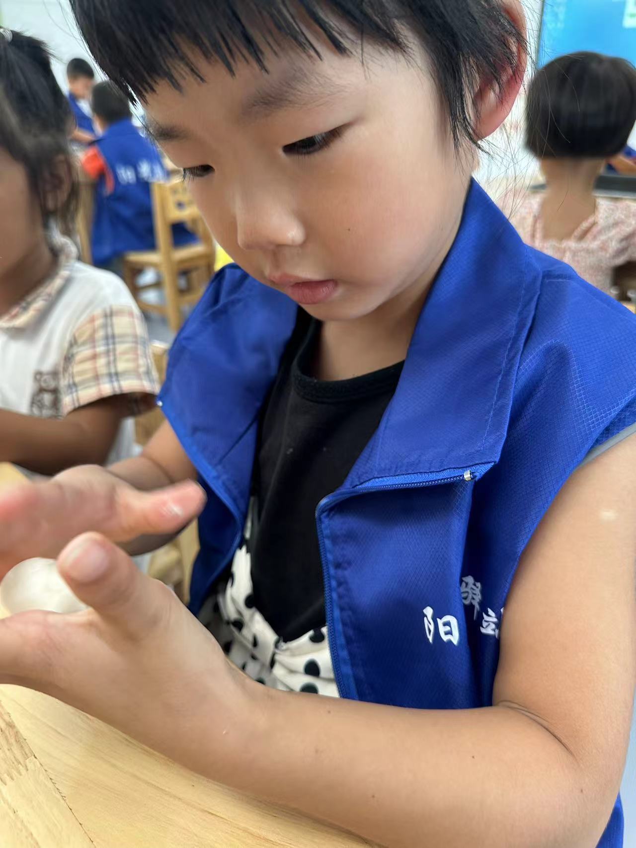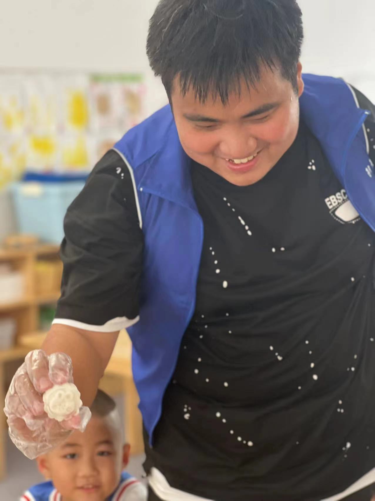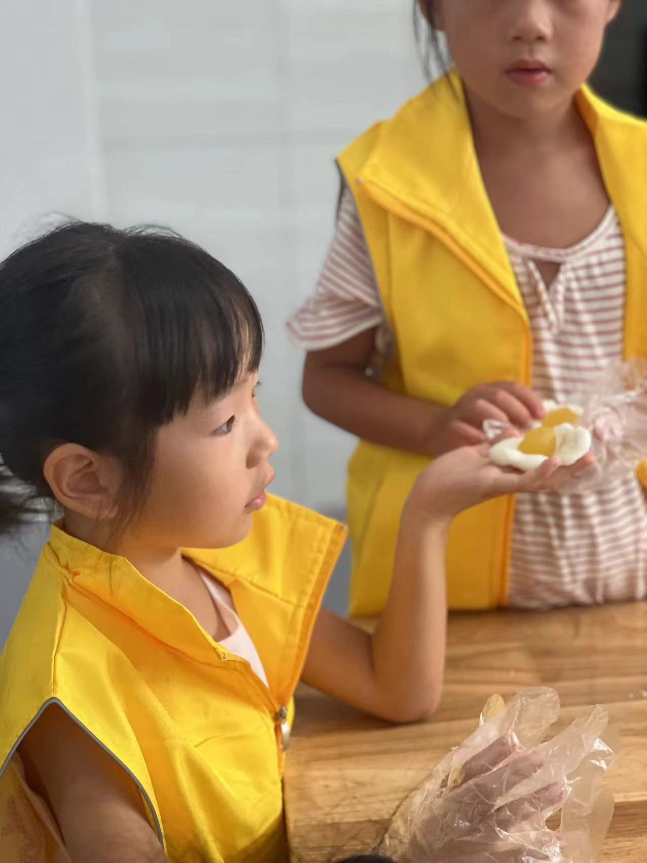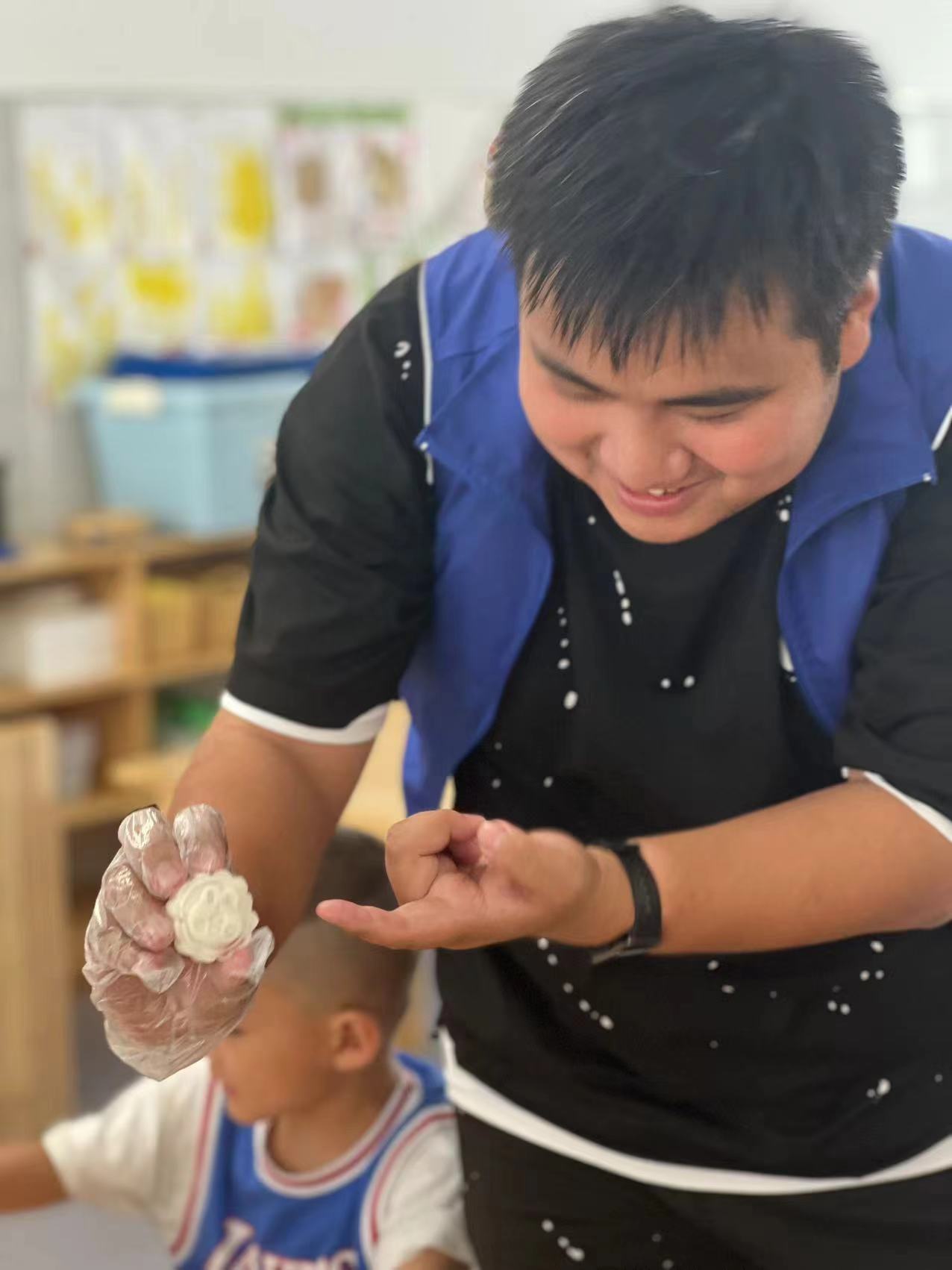 在月上明珠的热身的小游戏过后,工作人员组织孩子们进行制作冰皮月饼的活动:
