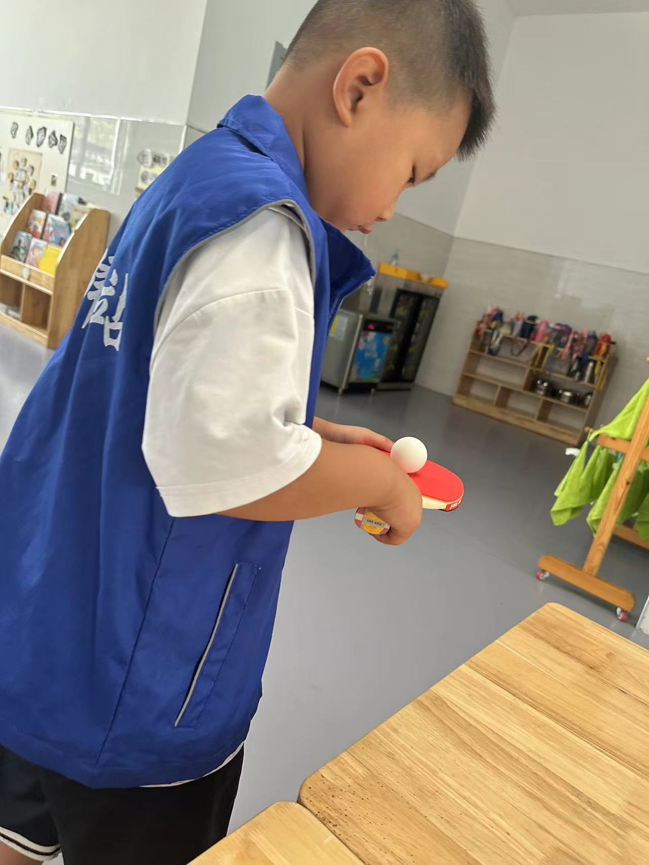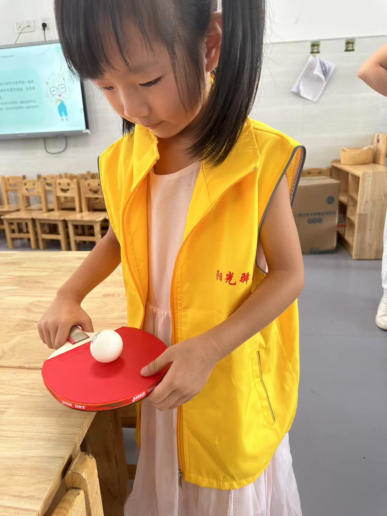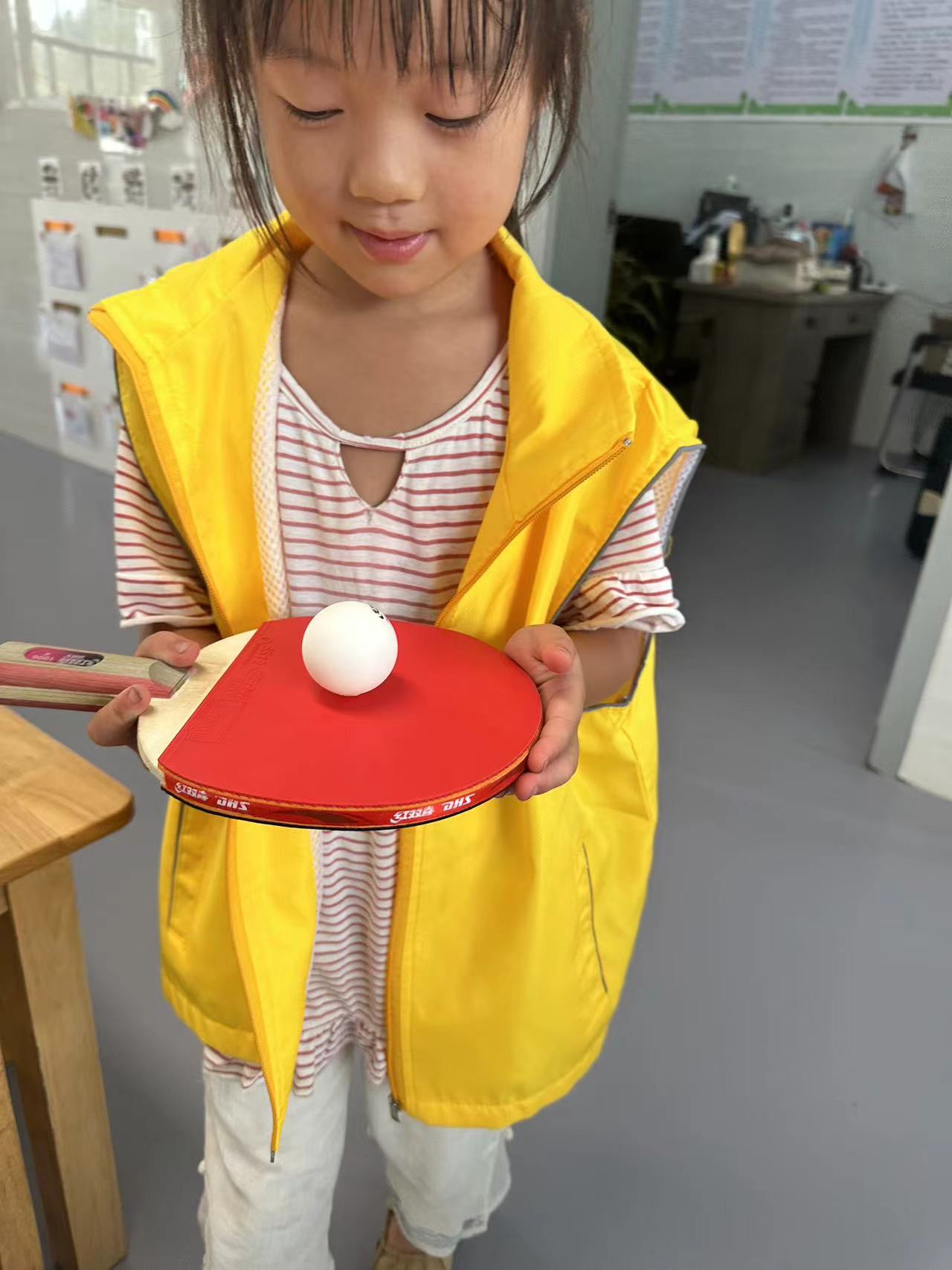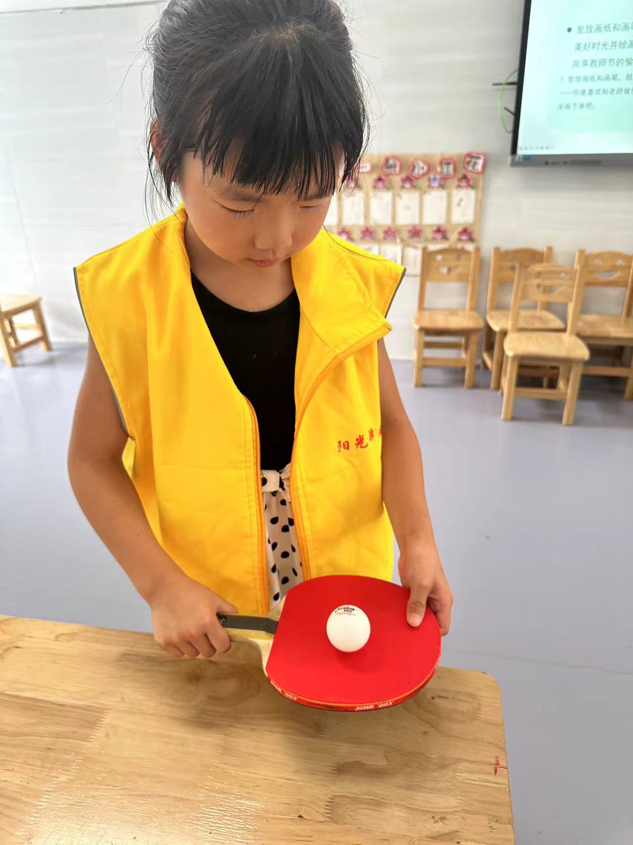 工作人员要准备好一个乒乓球和一个乒乓球拍。参与者将乒乓球平放在乒乓球拍上,沿着桌子绕一圈,走至终点,球未丢就为胜。
