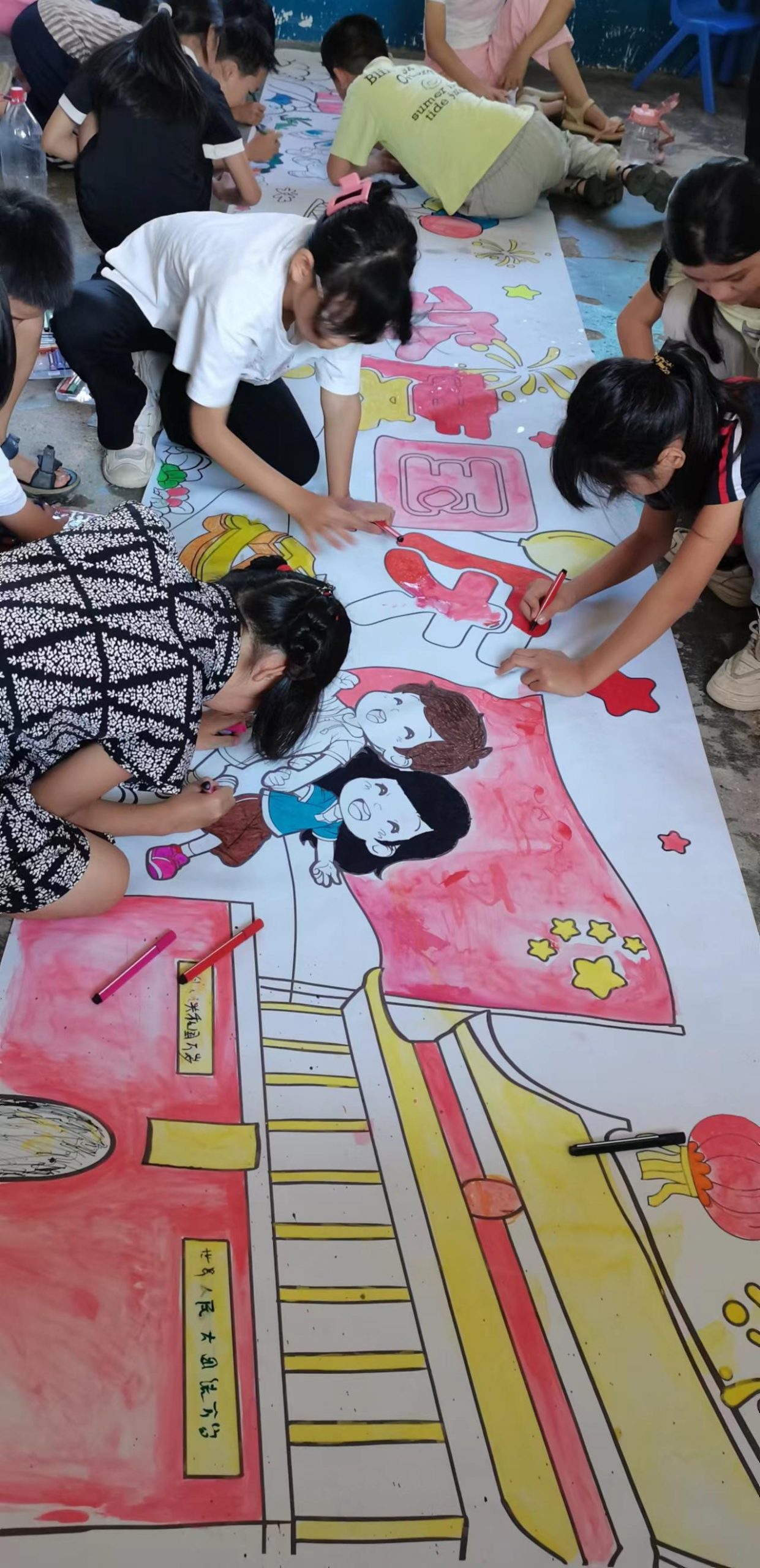 最激动人心的环节莫过于“爱祖国,绘长卷”了。在工作人员的带领下,小朋友们纷纷拿起彩笔和水粉颜料,兴奋地投入到5米长的绘画长卷创作中。他们趴在长卷上,用五彩斑斓的色彩描绘出心中的祖国。在画了天安门城楼和五星红旗,都凝聚着孩子们对祖国的深情与向往,也展现了他们丰富的想象力和创造力。