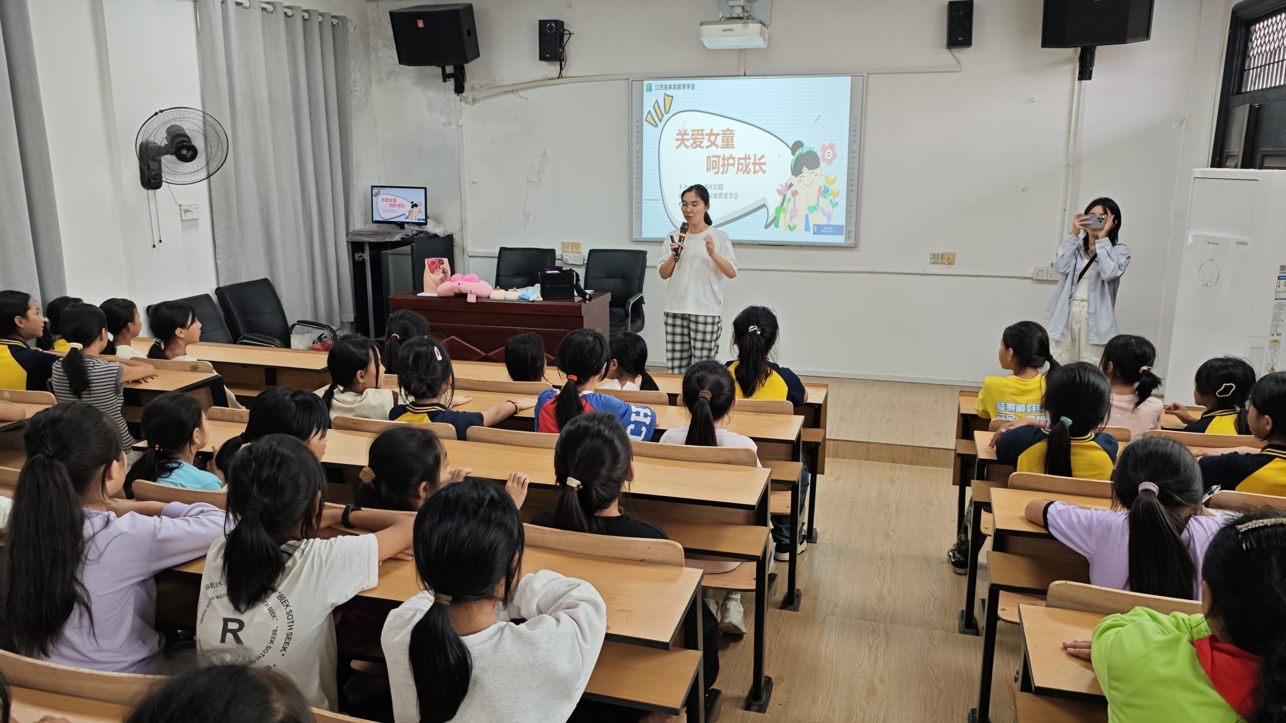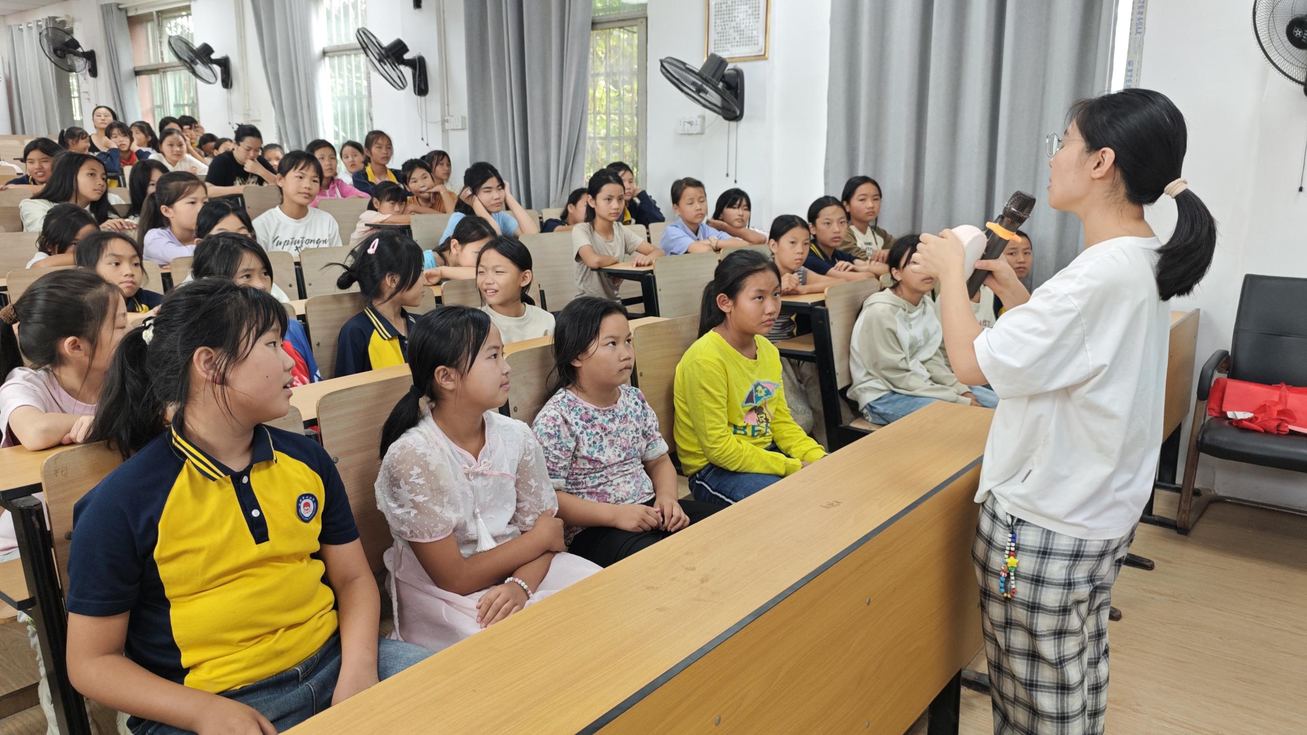 江西省家庭教育学会的三级心理咨询师、中级社工、儿童安全专职讲师王珍妮老师以生动的讲解方式,赢得了在场女童们热烈的掌声。讲座内容不仅涵盖了生理变化、人际交往及应对策略,还深入探讨了自我保护及预防性侵害等重要的话题。